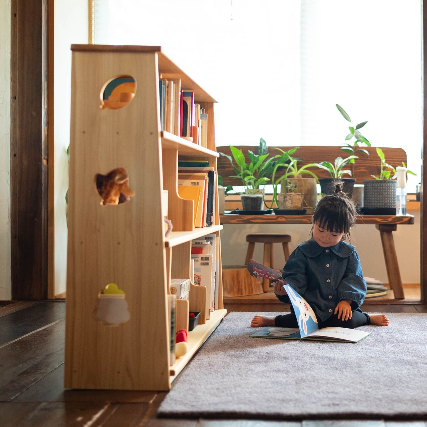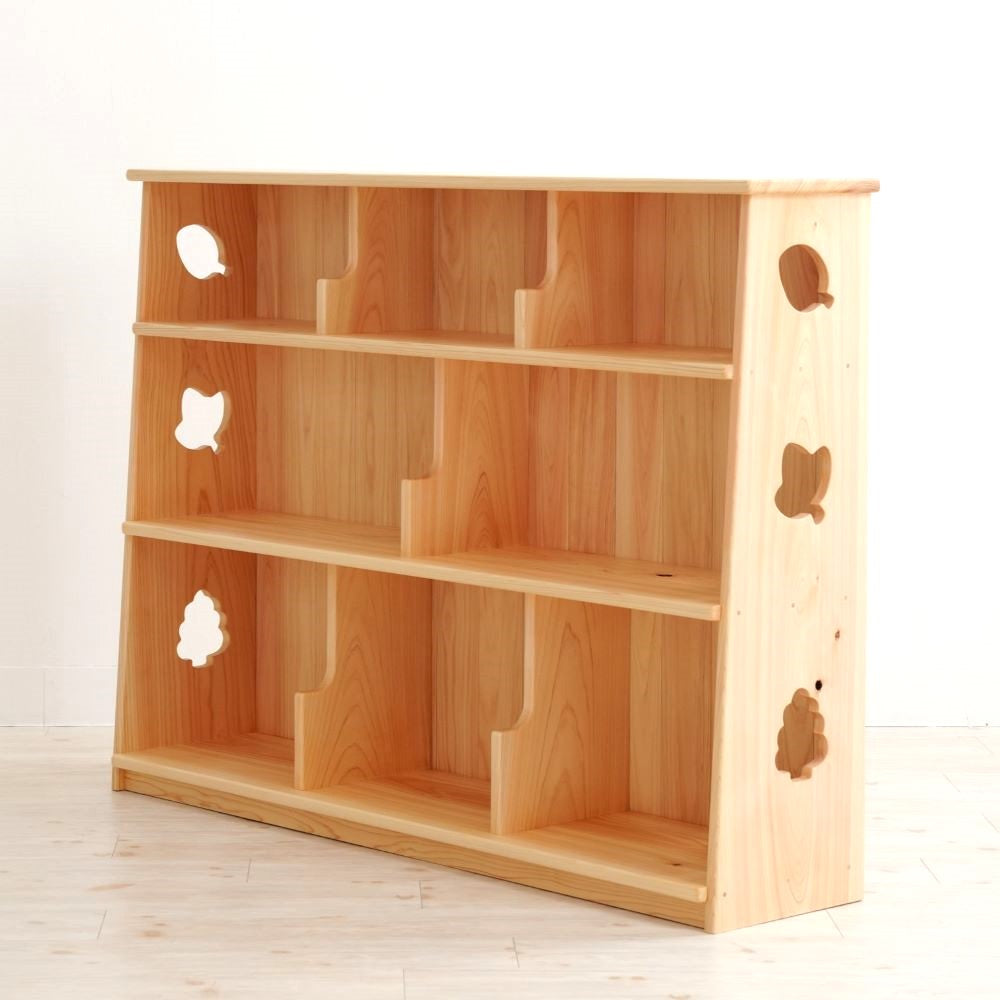 高さ93cmで子どもが自分で手に取りやすく、絵本の時間や片づけが自然と習慣になります。国産ヒノキを使い、角は丸くすべすべに仕上げました。