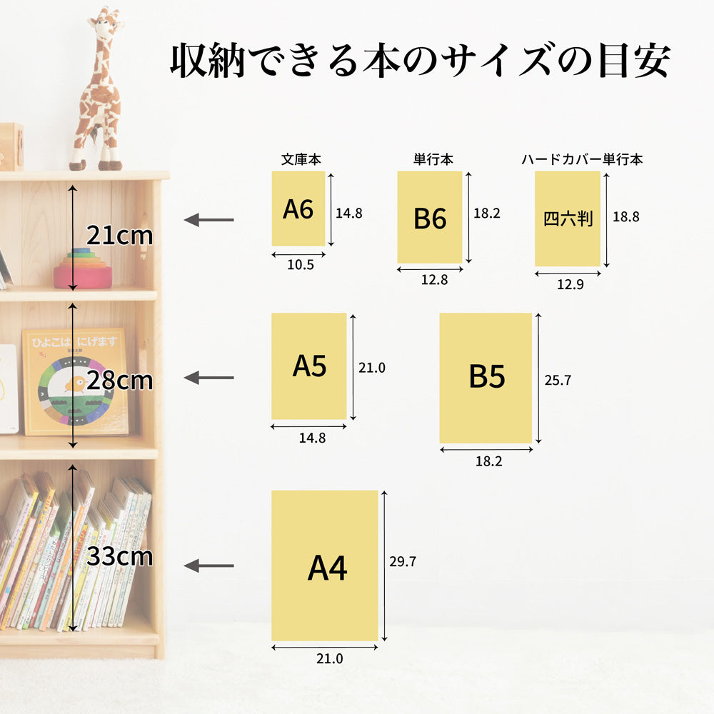 それぞれの段の高さと収納できる本の目安はこちら。