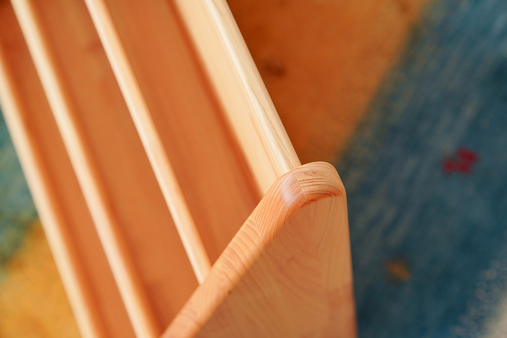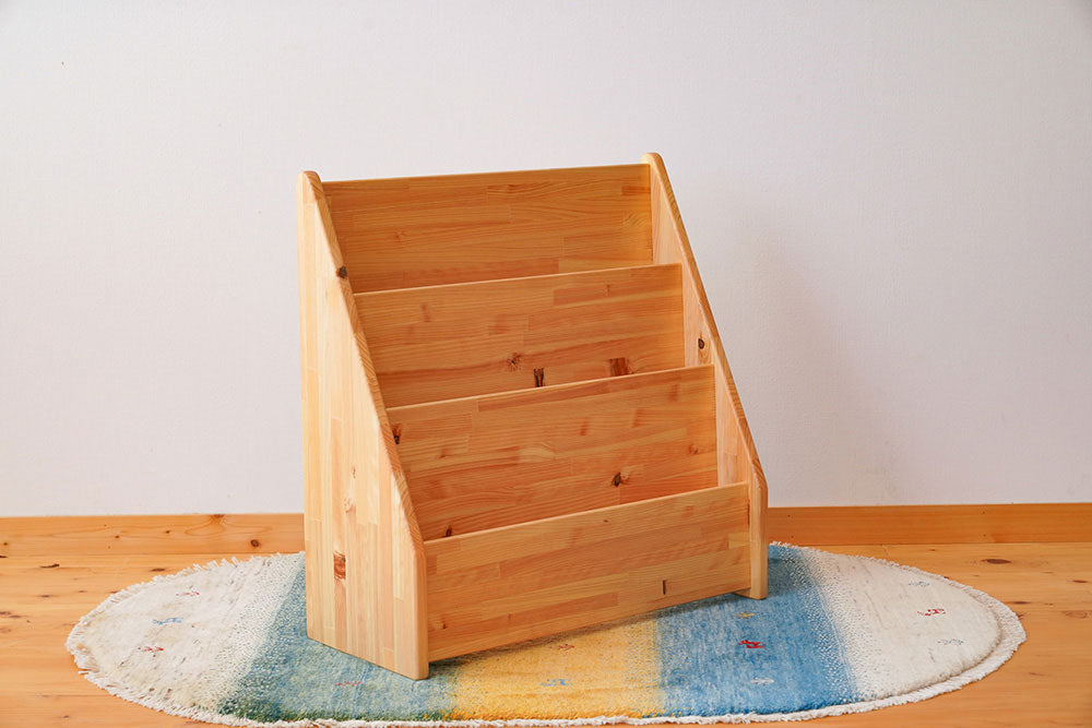 お部屋の中に大好きな本といっしょに生活していくことができます。本立ての角は丸くつるつるですので転んで角に当たっても平気です。あかちゃんから大人までいっしょに使ってください。日本の木材ヒノキを使った贅沢な仕上げ、塗料にはドイツ製のリボスオイルを使用しました。アレルギーのお子様にも安心、つるつるに磨かれて肌触り満点です。