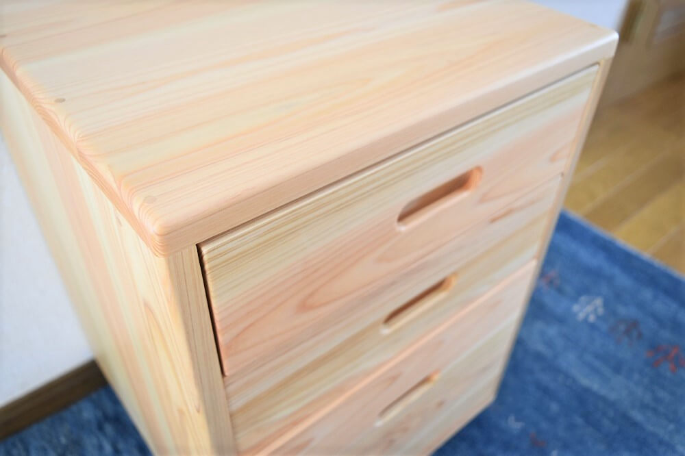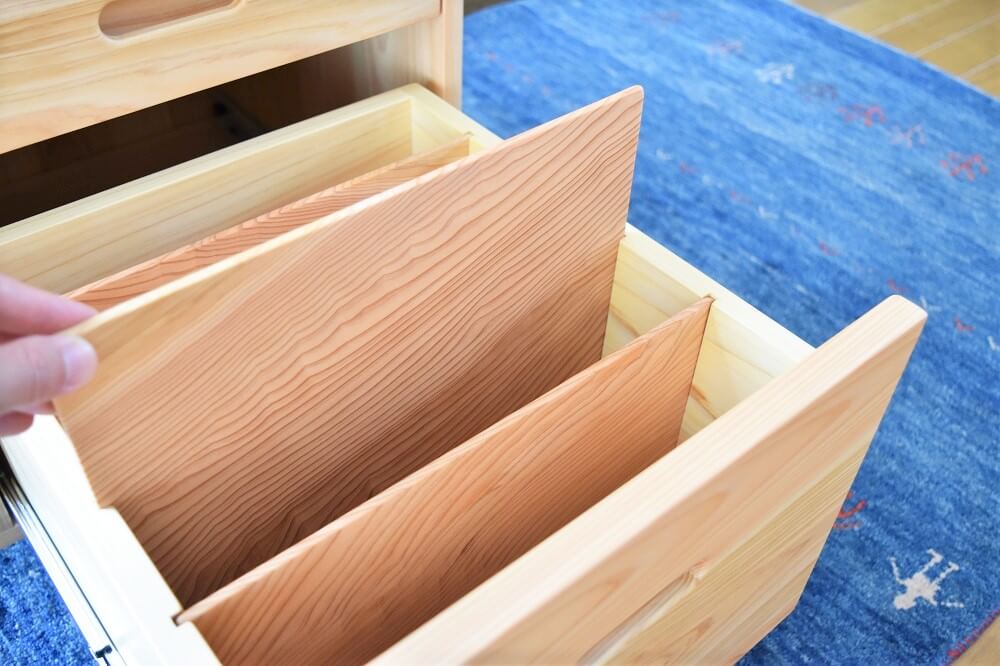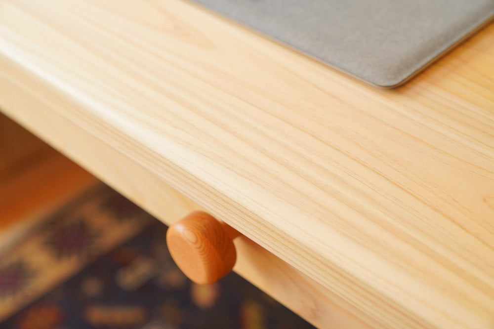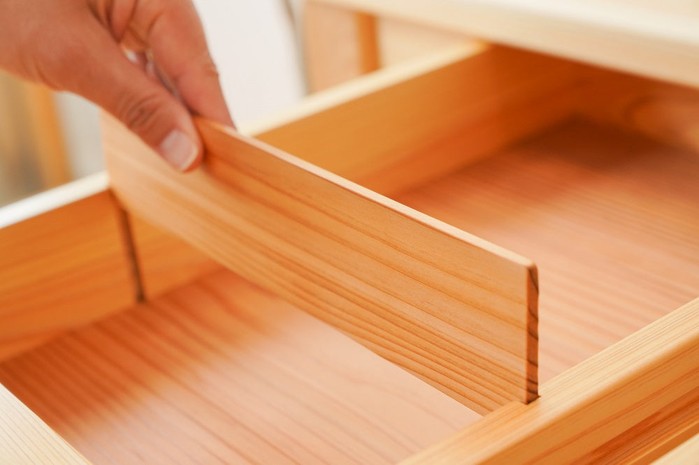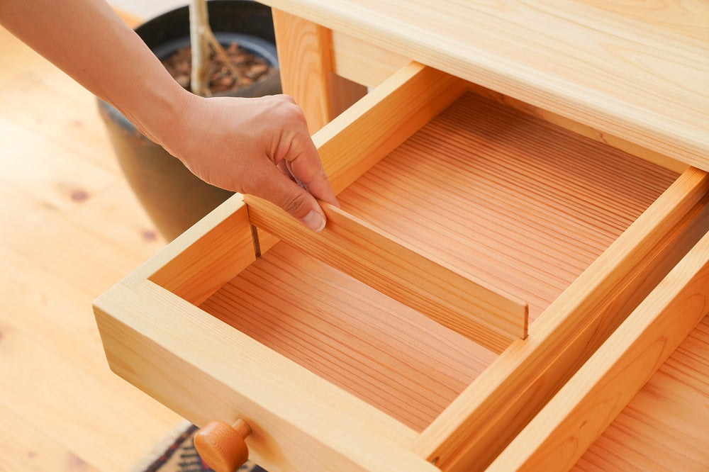 木目のきれいな部分だけを厳選して使っています。引出しの中は天然杉。ヒノキと杉の香りも部屋中に漂うくらい。いい香りを楽しんでいただけます。