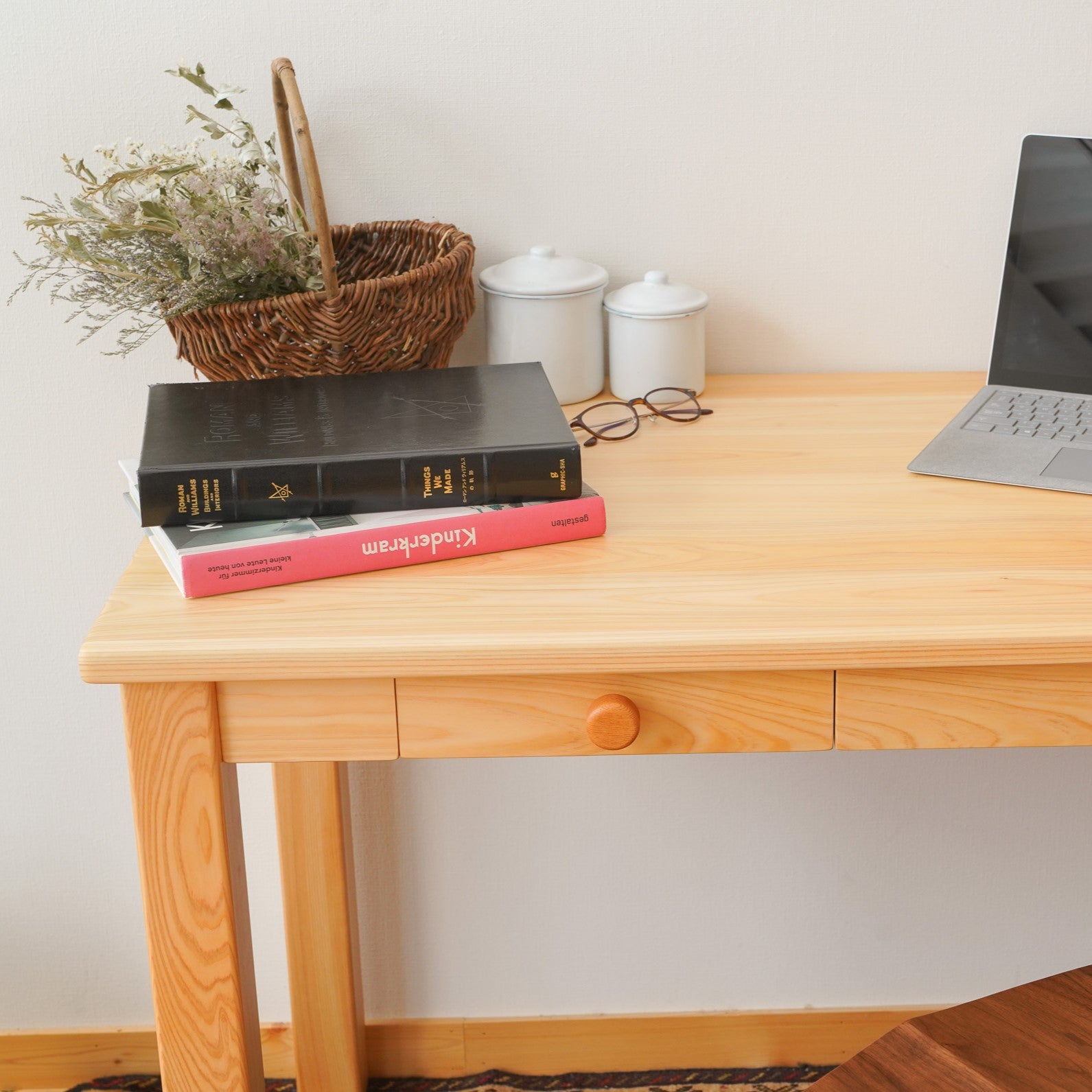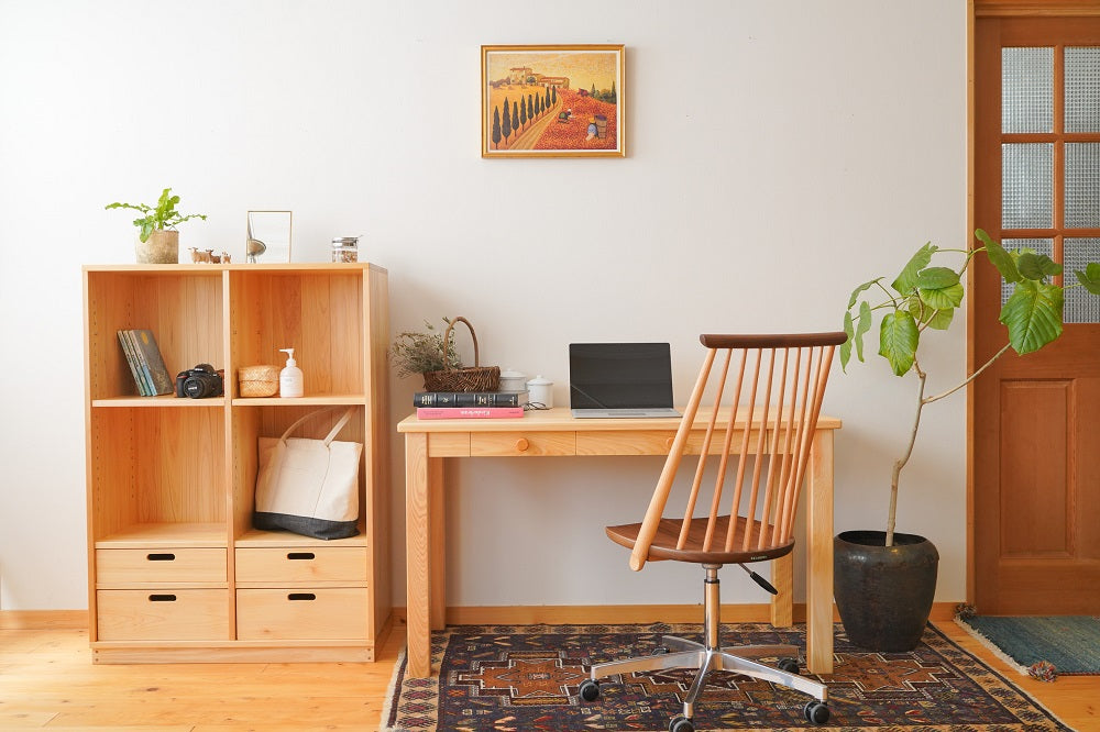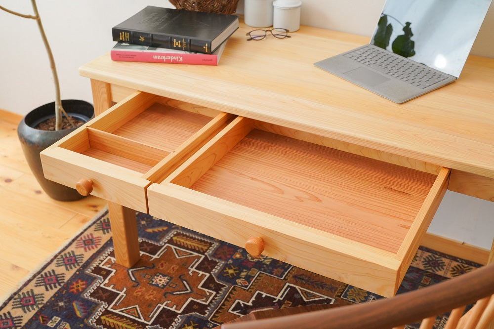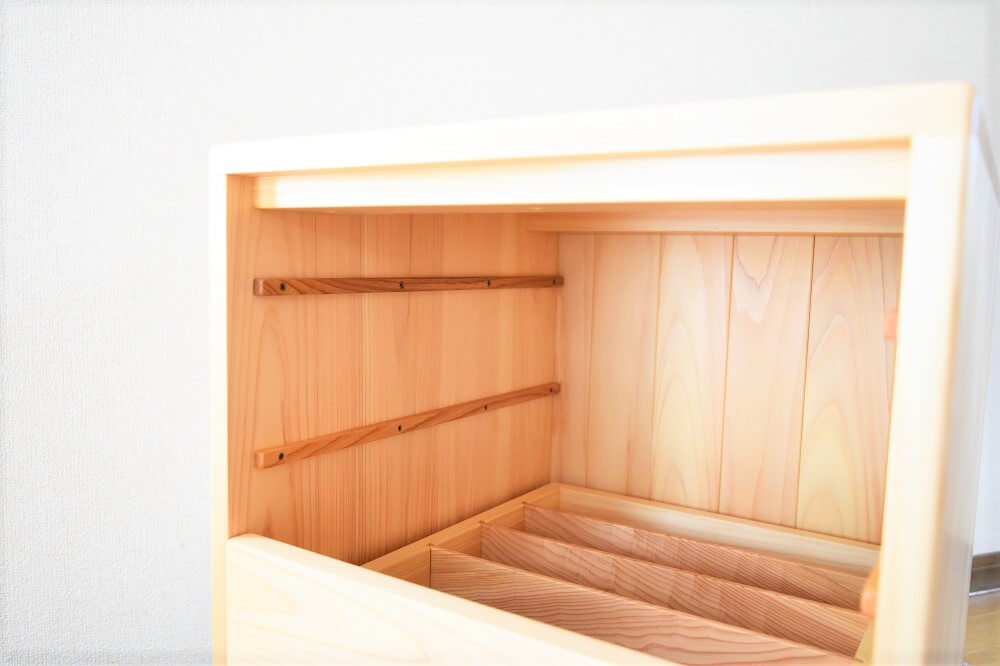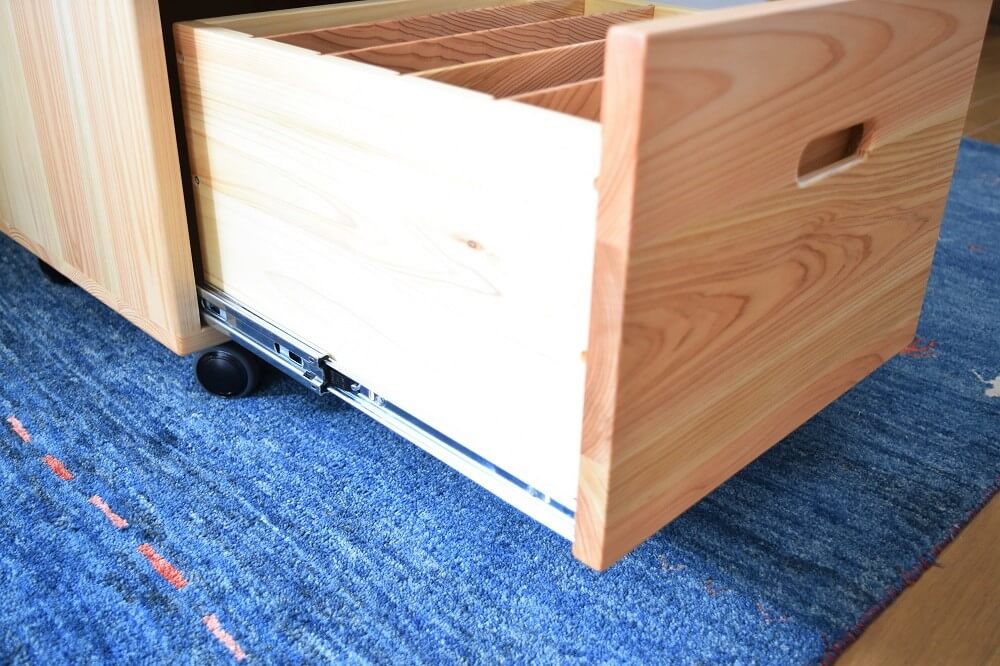木目のきれいな部分だけを厳選して使っています。引出しの中は天然杉。ヒノキと杉の香りも部屋中に漂うくらい。いい香りを楽しんでいただけます。