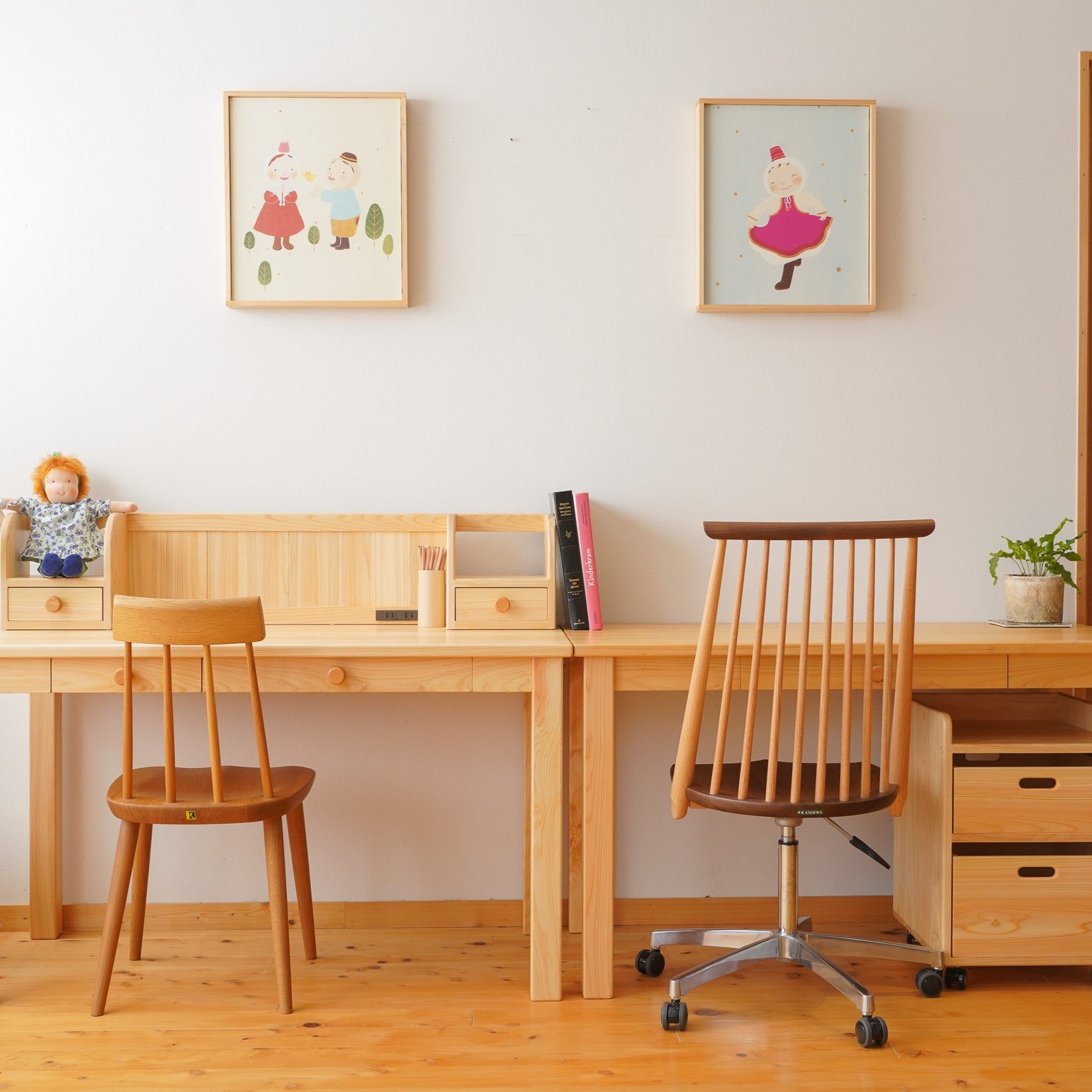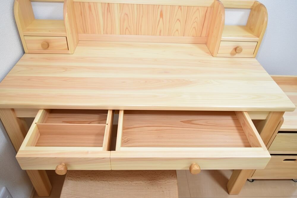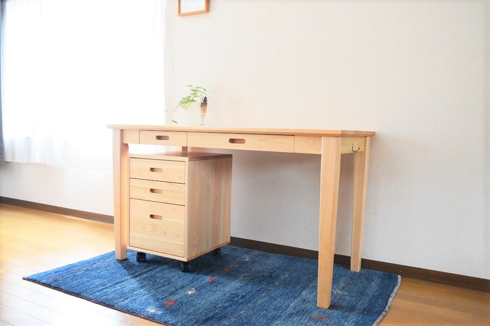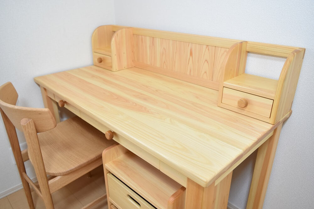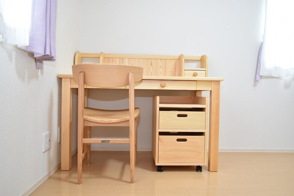 学習デスクといえば、その時流行のキャラクターがデザインされたものや、見た目も子ども用に作られているものが多い印象を受けます。なかよしライブラリーの造る製品はそういった量販品とは違い、全て国産の無垢材を使用し、職人が一から製作する木の学習デスクです。