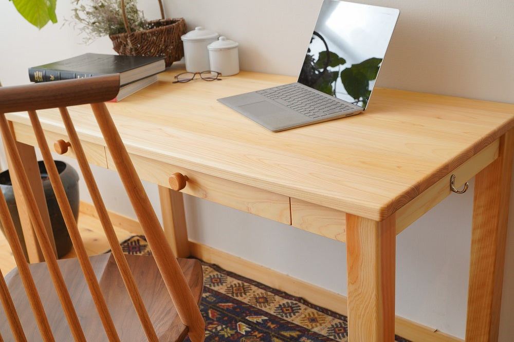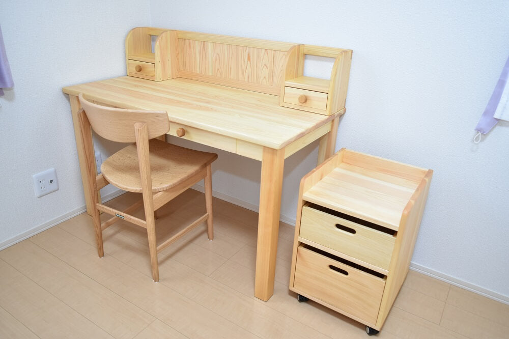 木のおもちゃと子ども家具専門店なかよしライブラリーが製作する学習机です。国産材を使用し職人が手作りしています。シンプルなひのきの学習机ですが、小学校入学から大人になっても使えます。サイズは幅120cm。植物油で口に入れても安心レベルの高品質な子ども家具です。