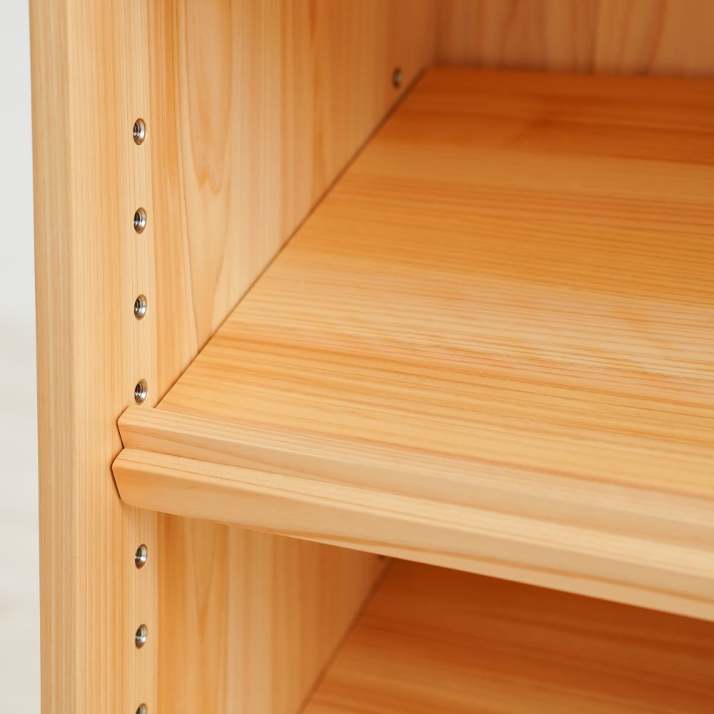 可動棚には落下防止の桟がついています。斜めにした時に、絵本やおもちゃが落ちないように工夫しています。桟は取り外しができるので、棚板を平行にした場合は外してご使用できます。