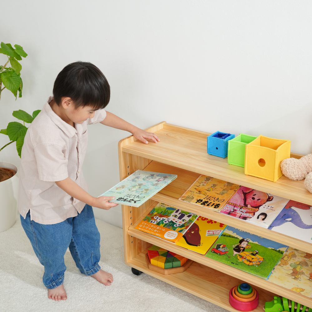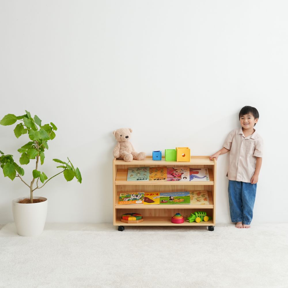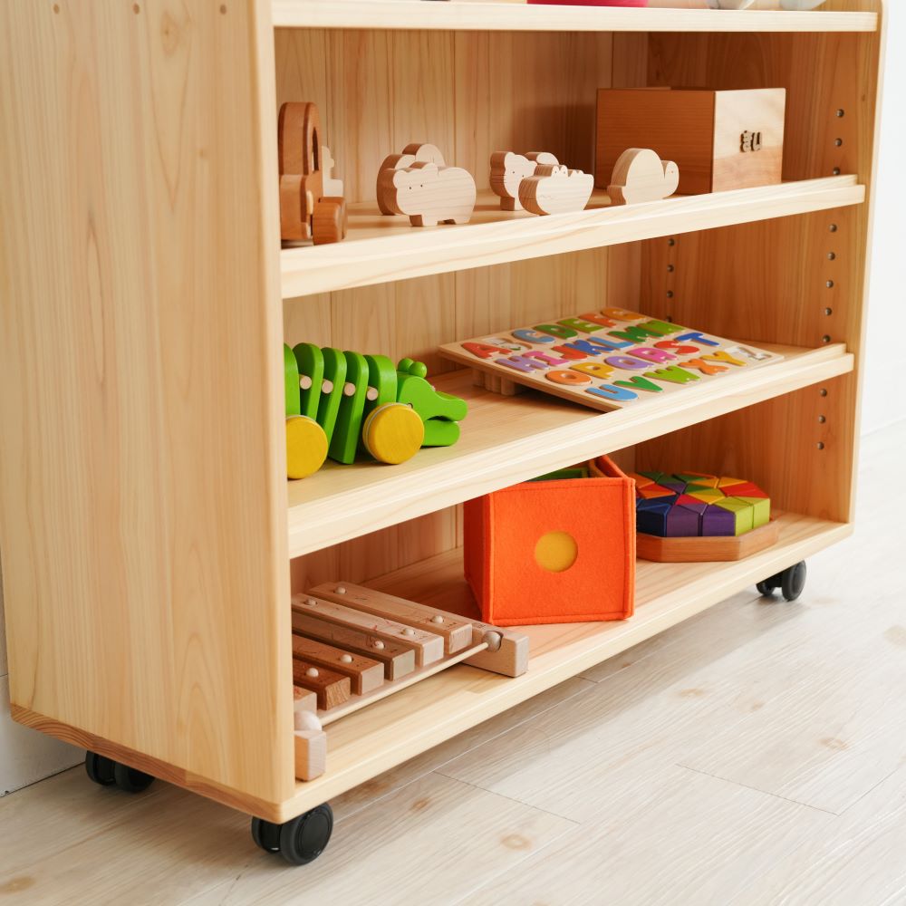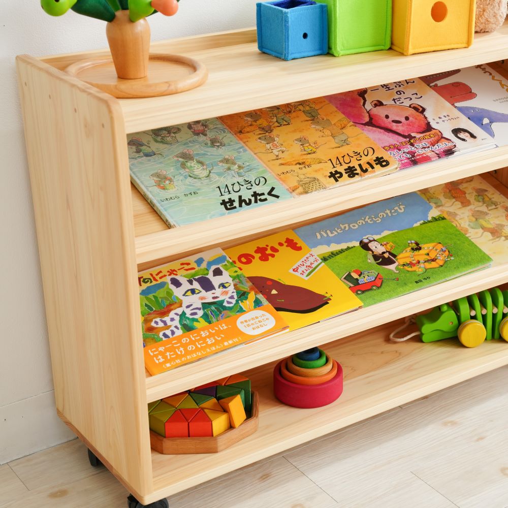 子どもたちが見やすく手に取りやすい角度に調整できるキャスター付きおもちゃ絵本収納棚です。