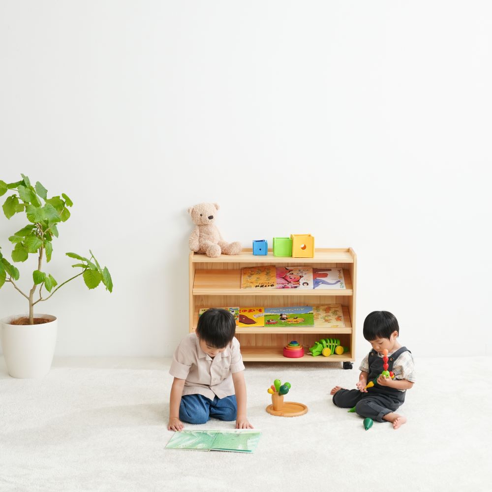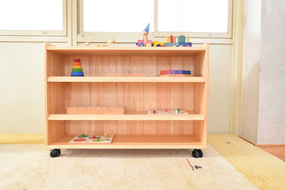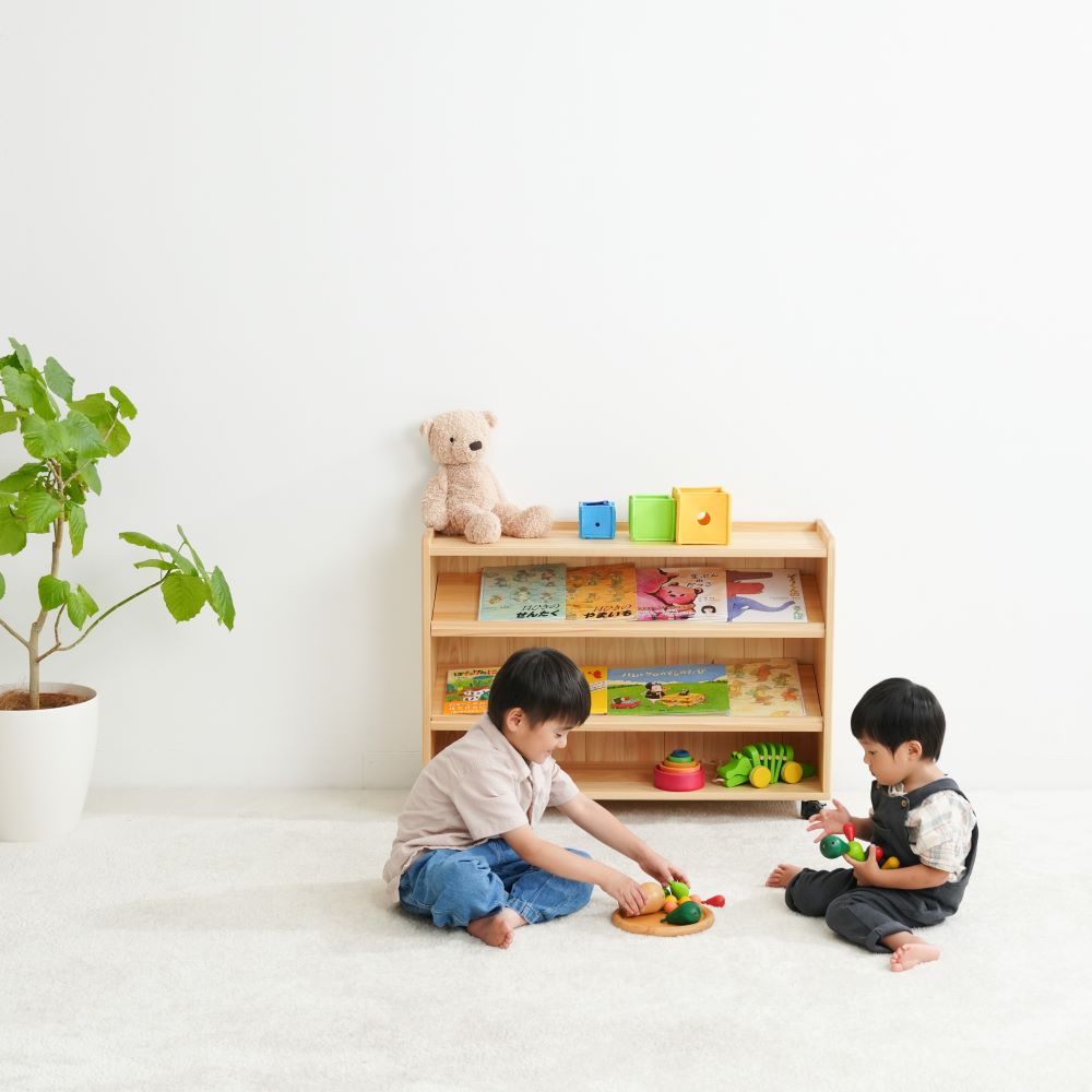 収納する棚の家具選びは遊ぶおもちゃと同じくらい重要だと考えます。特に年齢の低い子どもたちにとって絵本やパズルや積み木などで遊ぶ力も促してくれます。