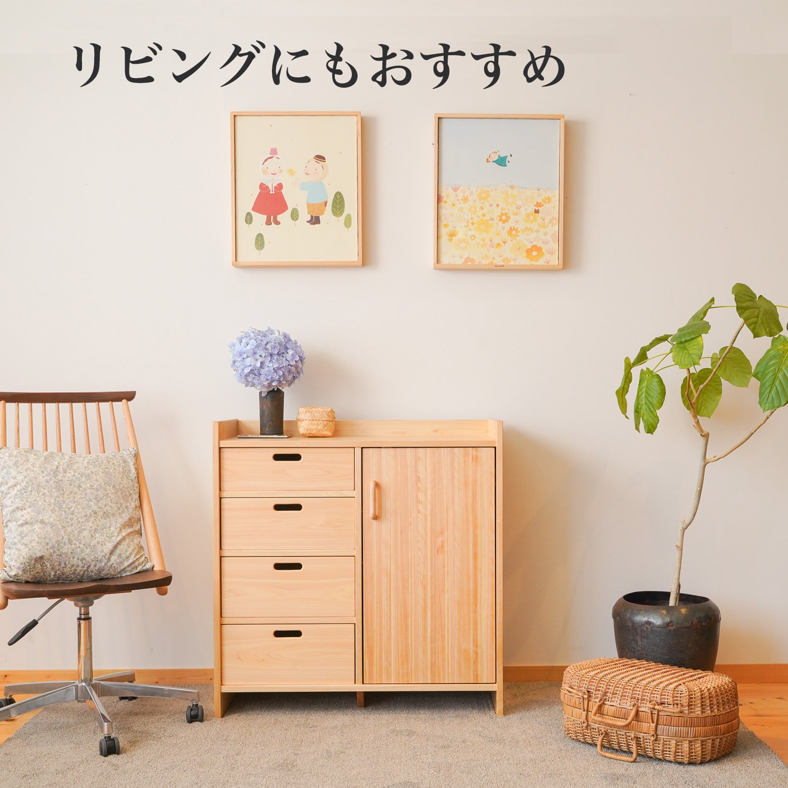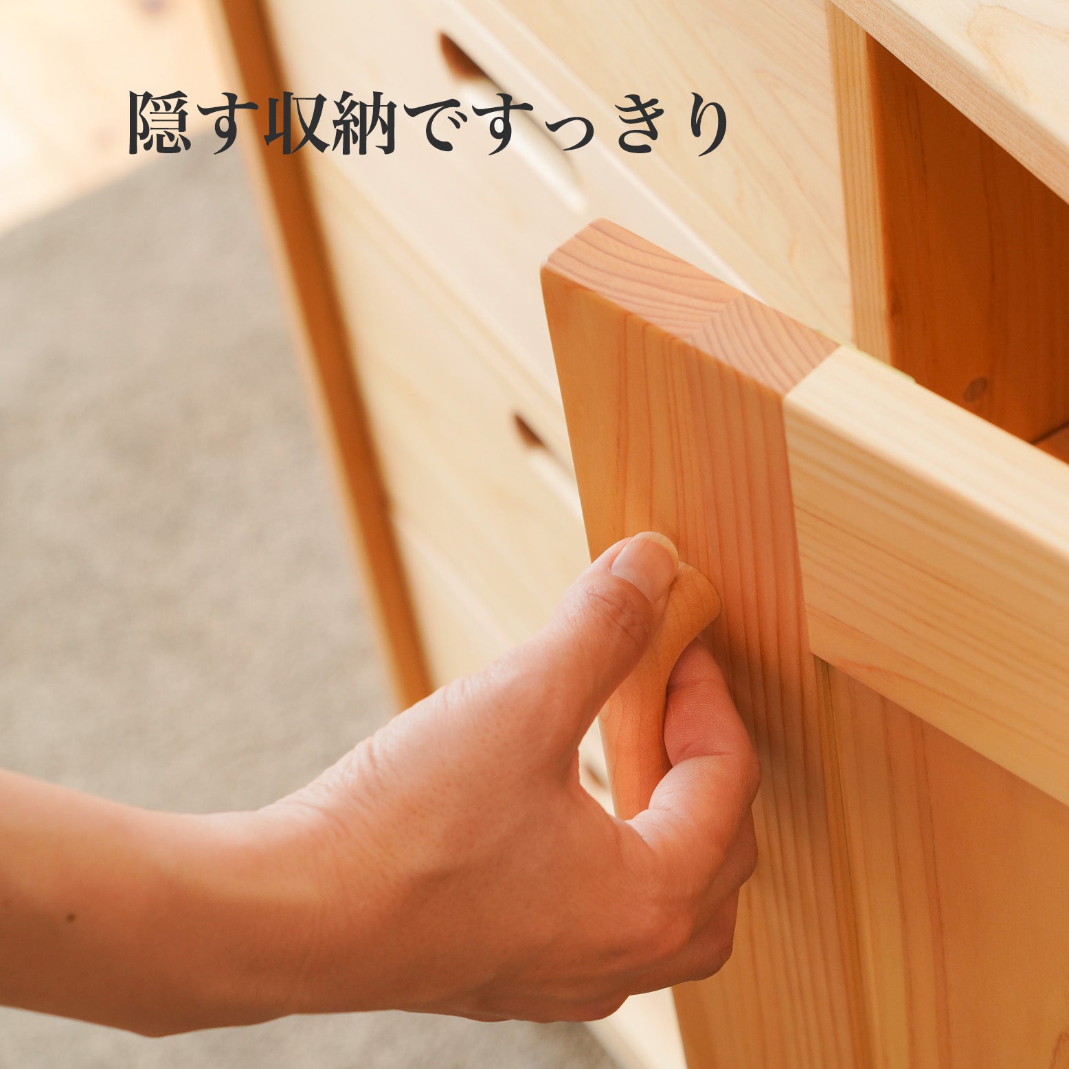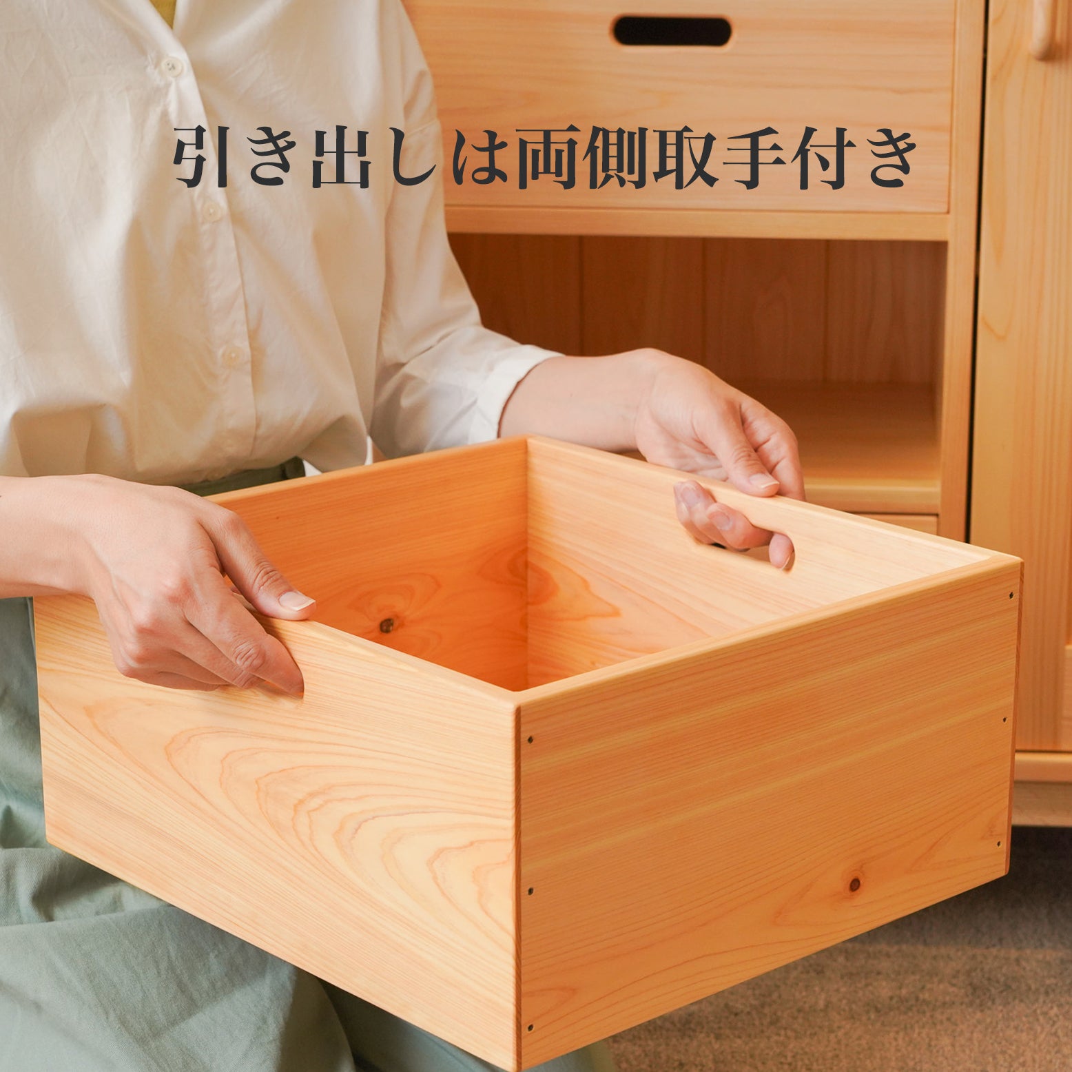 引出には衣類や、細々したものを収納してください。引出しの深さも異なりますので、かさ高に合わせて収納ができます。衣類収納としておすすめするのは、天然のヒノキと杉で製作しているため、香りが良く、天然の防虫効果により防虫剤などの化学薬剤を使用せずに済みます。