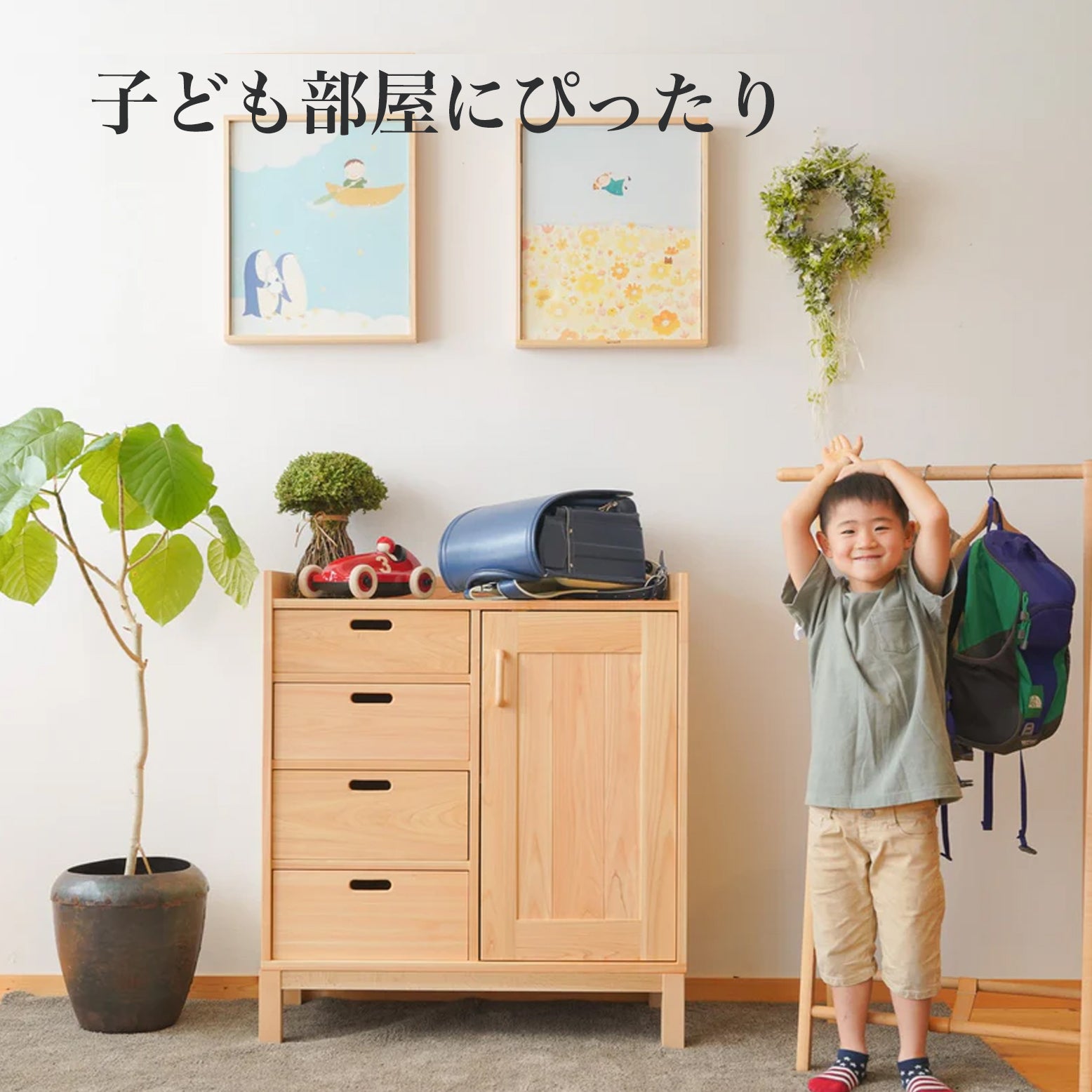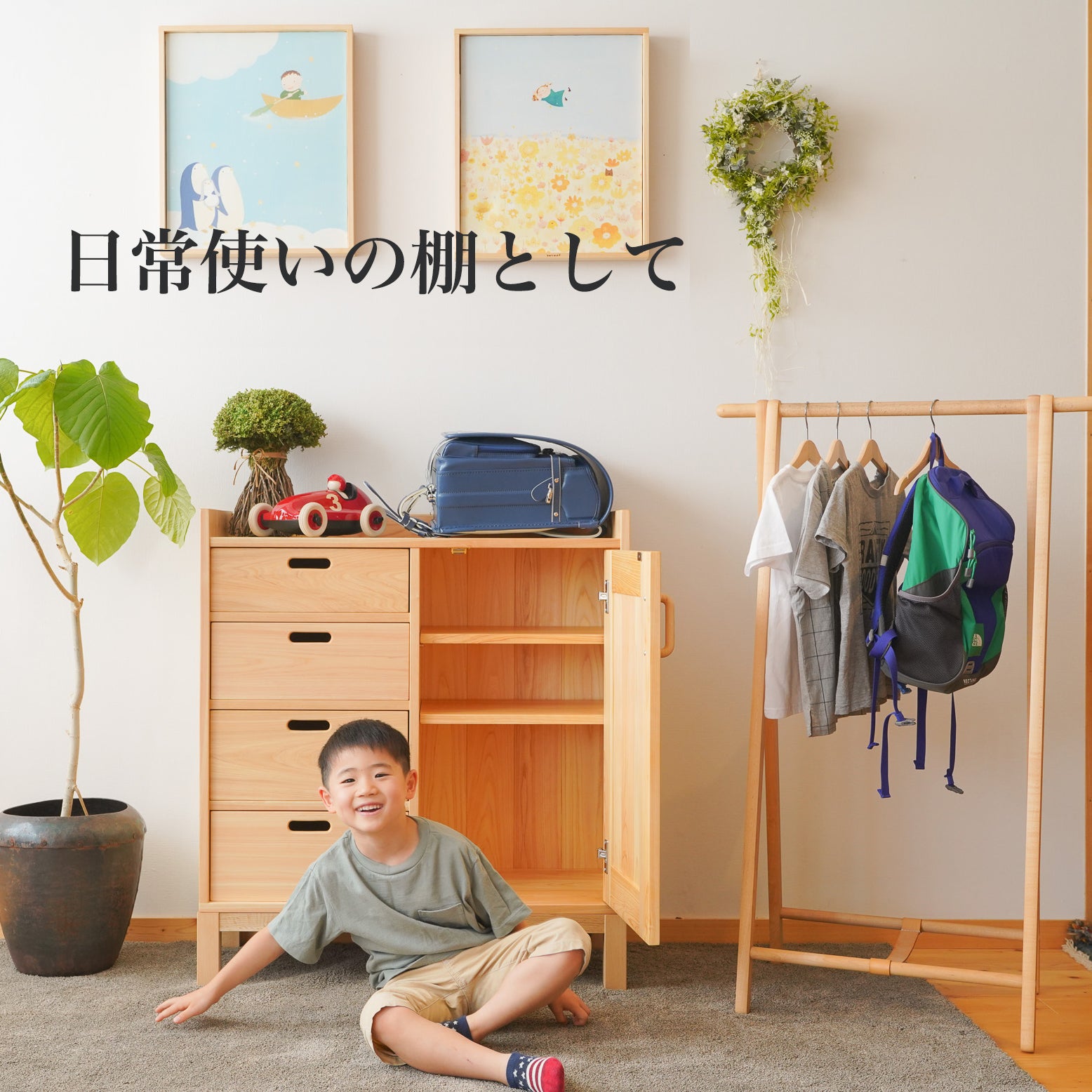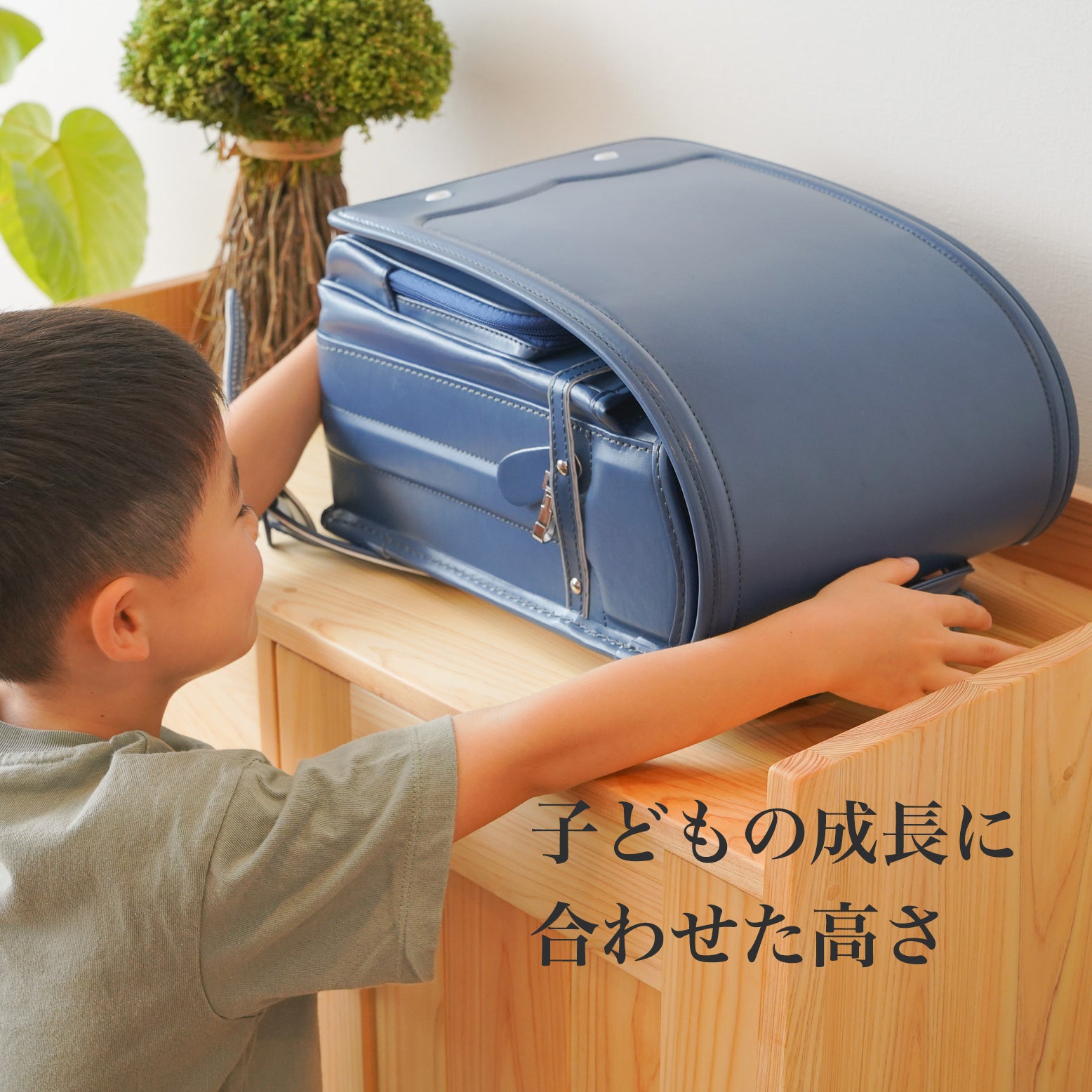 保育園等では、カバンを“掛ける”よりも“置く”動作の方が多いような印象を受けます。家具の上は出来るだけスッキリ見せると美しいのですが、小学校の時は、本を置いたりランドセルを収納したり、お気に入りを飾ったり、自分好みに使って下さい。