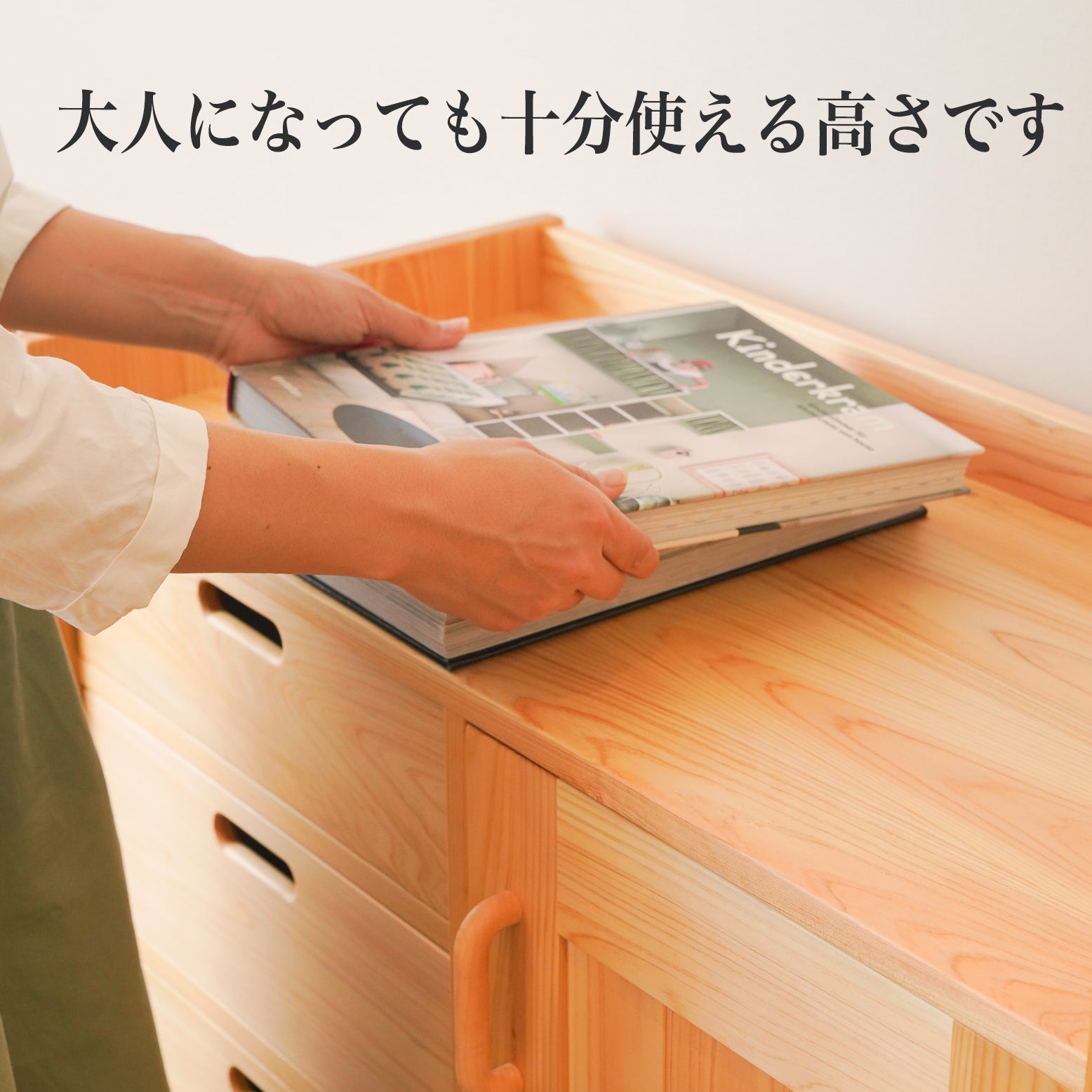 大人になってからも十分に使えます。腰よりも少し高いくらいの位置に天板面がきますので、腰をかがめなくても使いやすい高さです。リビングや書斎、あるいはキッチンなどで活躍することを考えています。