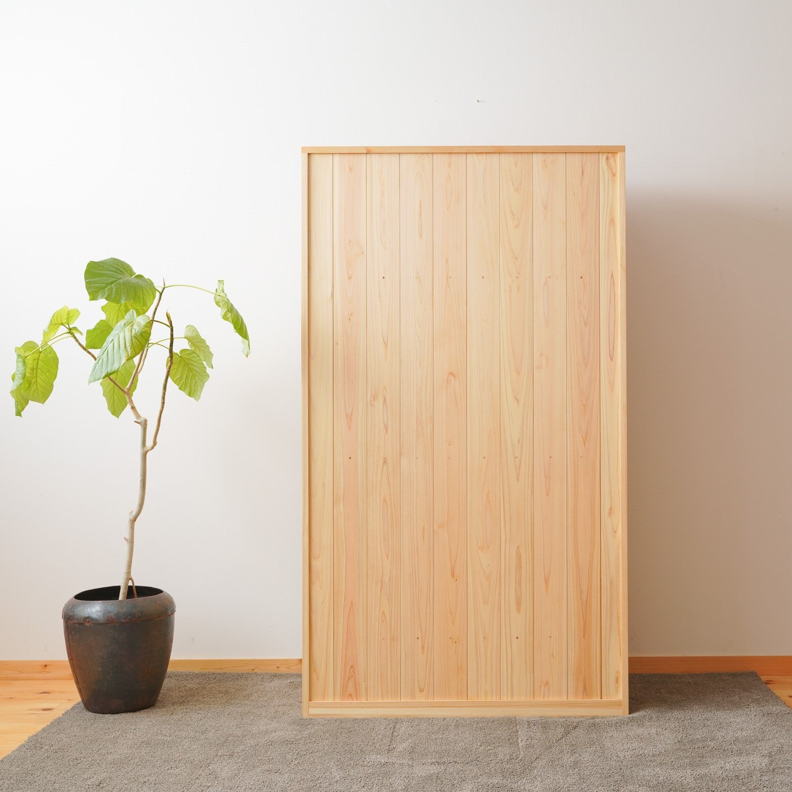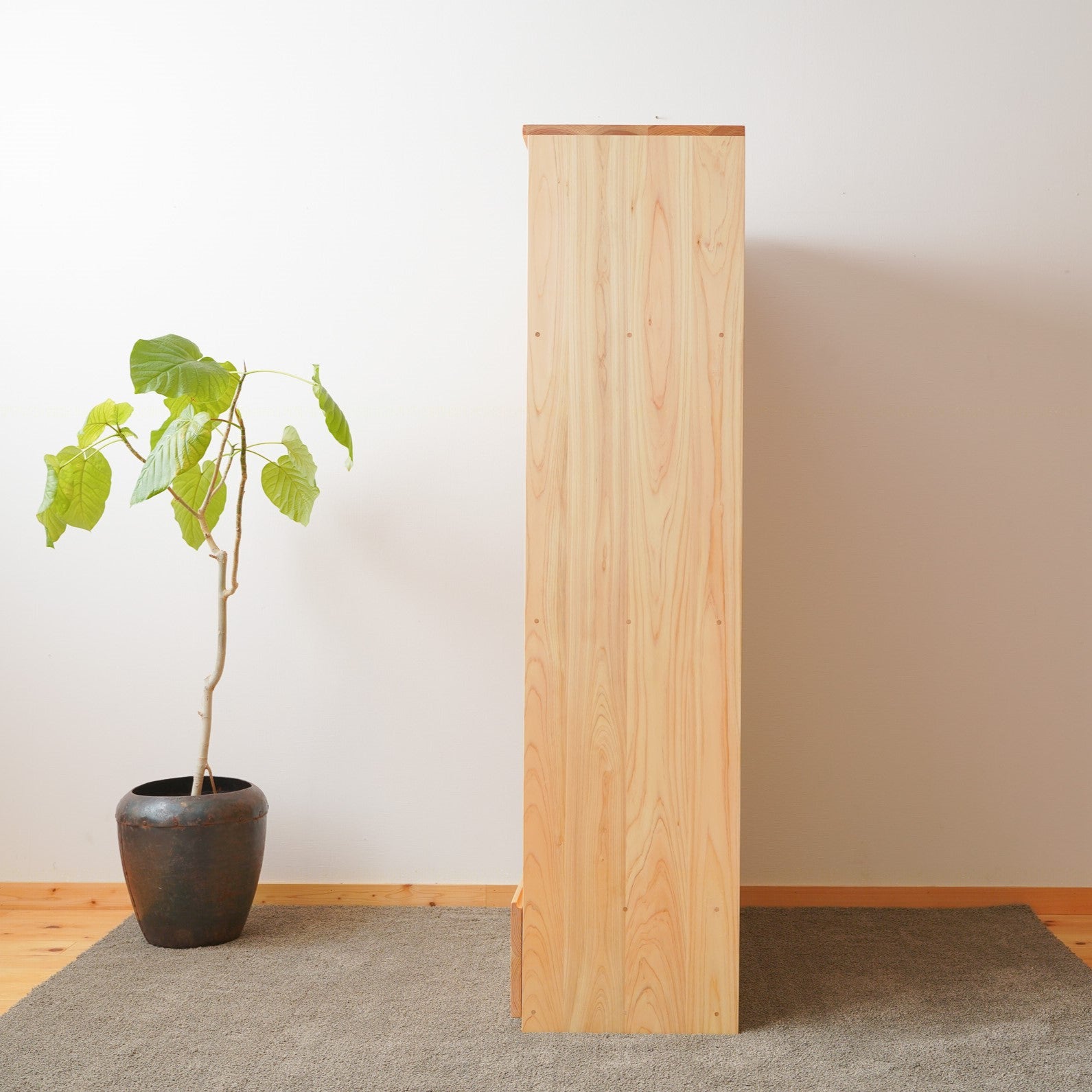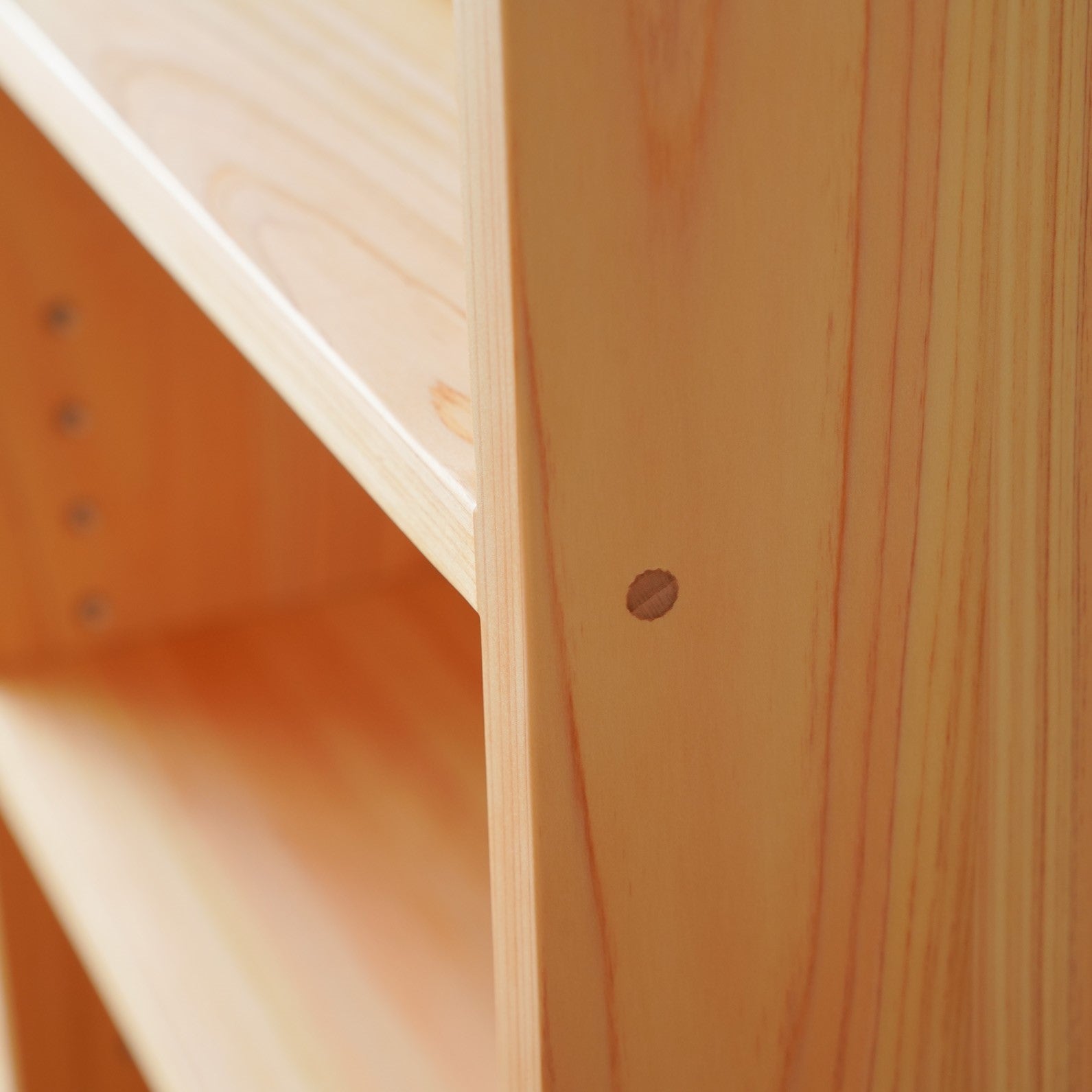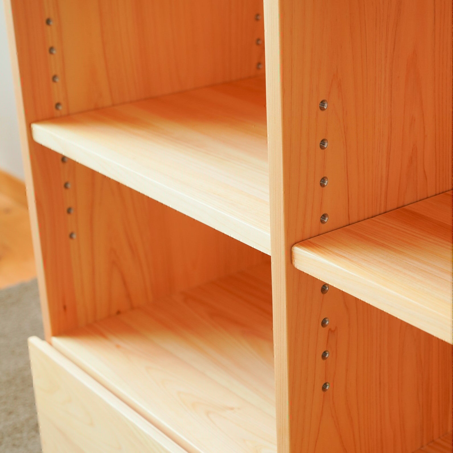 棚板の間隔は30㎜ピッチで可動できるようにしています。また棚板の追加発注も可能ですので、物が増えた場合にも便利です。棚板は反りに強いヒノキの柾目材を使用しています。もちろん節一つない高級材です。棚板にはもったいないと言われそうです。