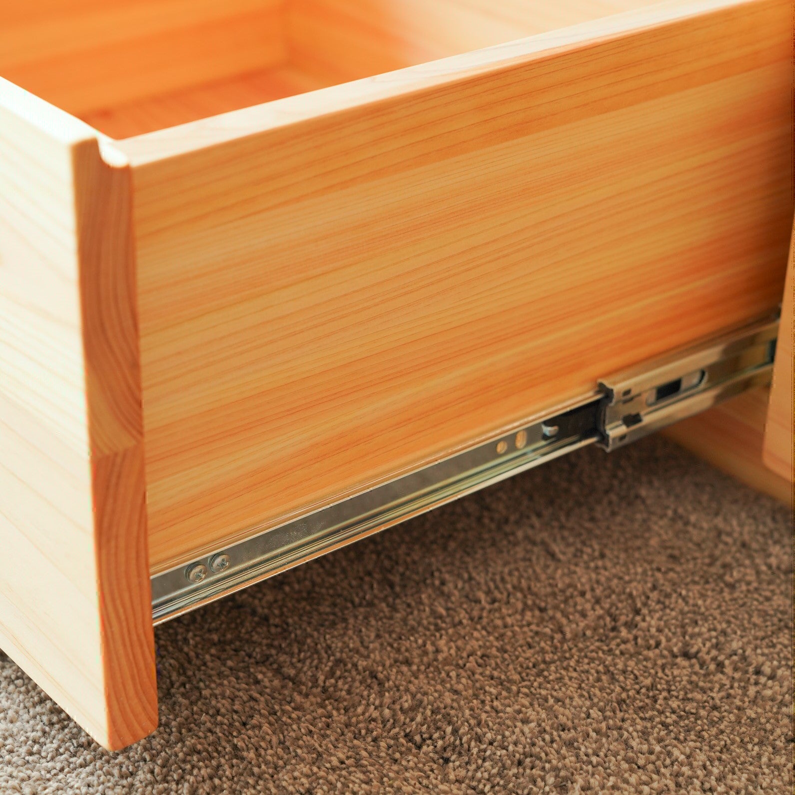 引出しにはスライドレールがついています。引出しを目いっぱいまで引き出しても 引き抜けず、そしてスムーズに開け閉め可能です。一番の利点は重たい物を入れてもスムーズに動かせること。年に1度くらいは油を付けて滑りを良くしてあげるとさらに長持ちします。万が一、長年の使用で破損しても、引出しのみ取外し可能ですので迅速に修理致します。ご安心下さい。