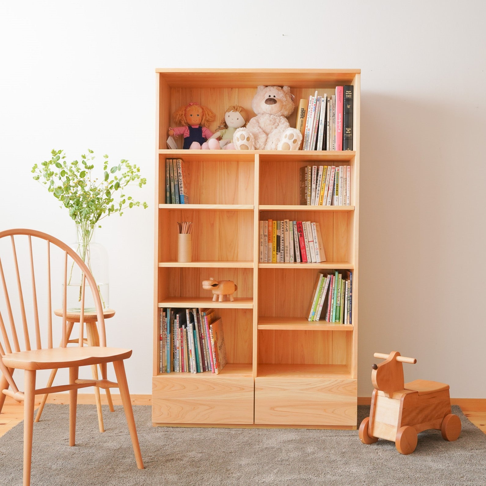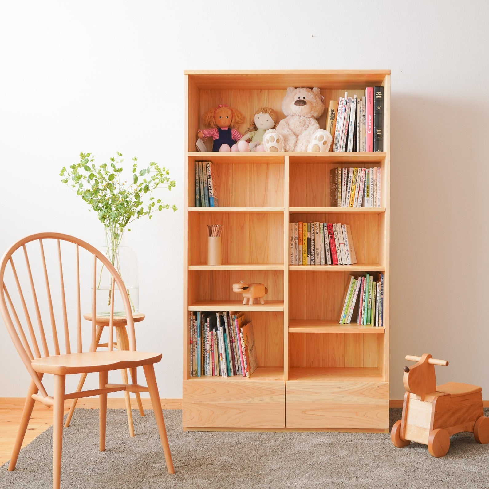 大きな家具というカテゴリで分けると大人用も子供用もないと考えます。ただし、市場で出回っている商品を見ると子ども用といえば、可愛らしく、作りは値段相当で安価なものが多い。私たちが考える家具は子供たちが使いやすいをコンセプトにしていますが、+α永く愛用できることを大切にしています。家族の本棚は、大人の書物、子供の絵本、家族みんなが使う文房具等を入れて収納していただきたいと考えています。