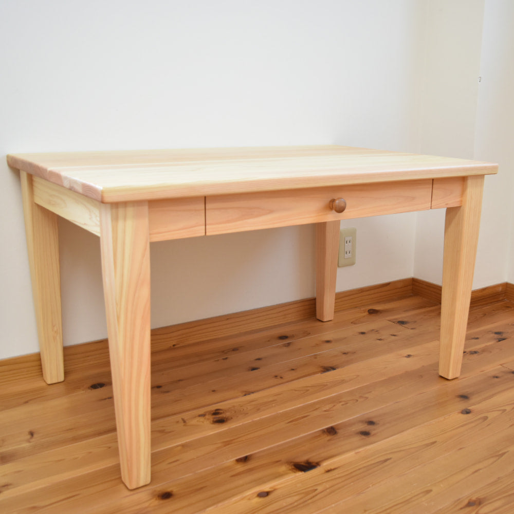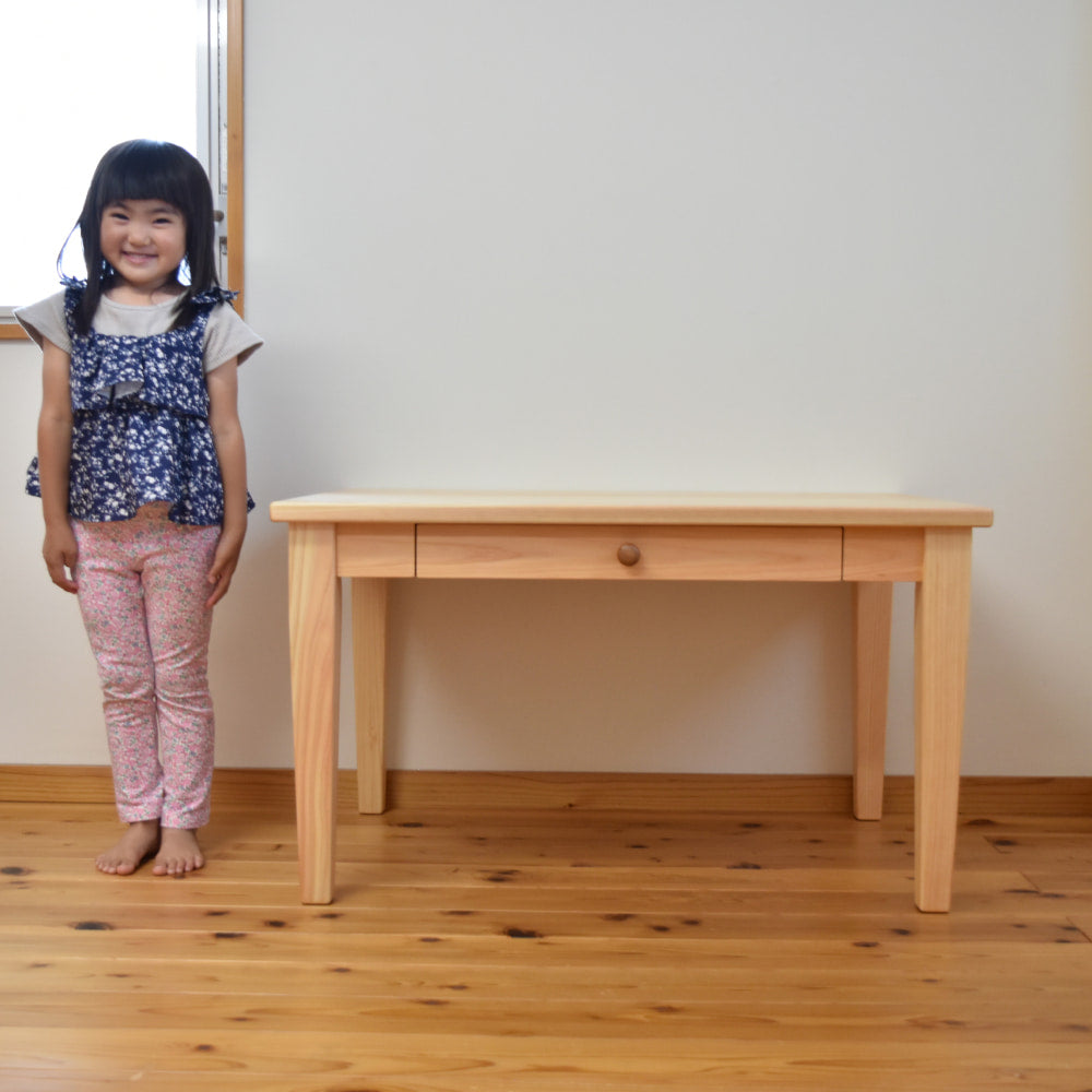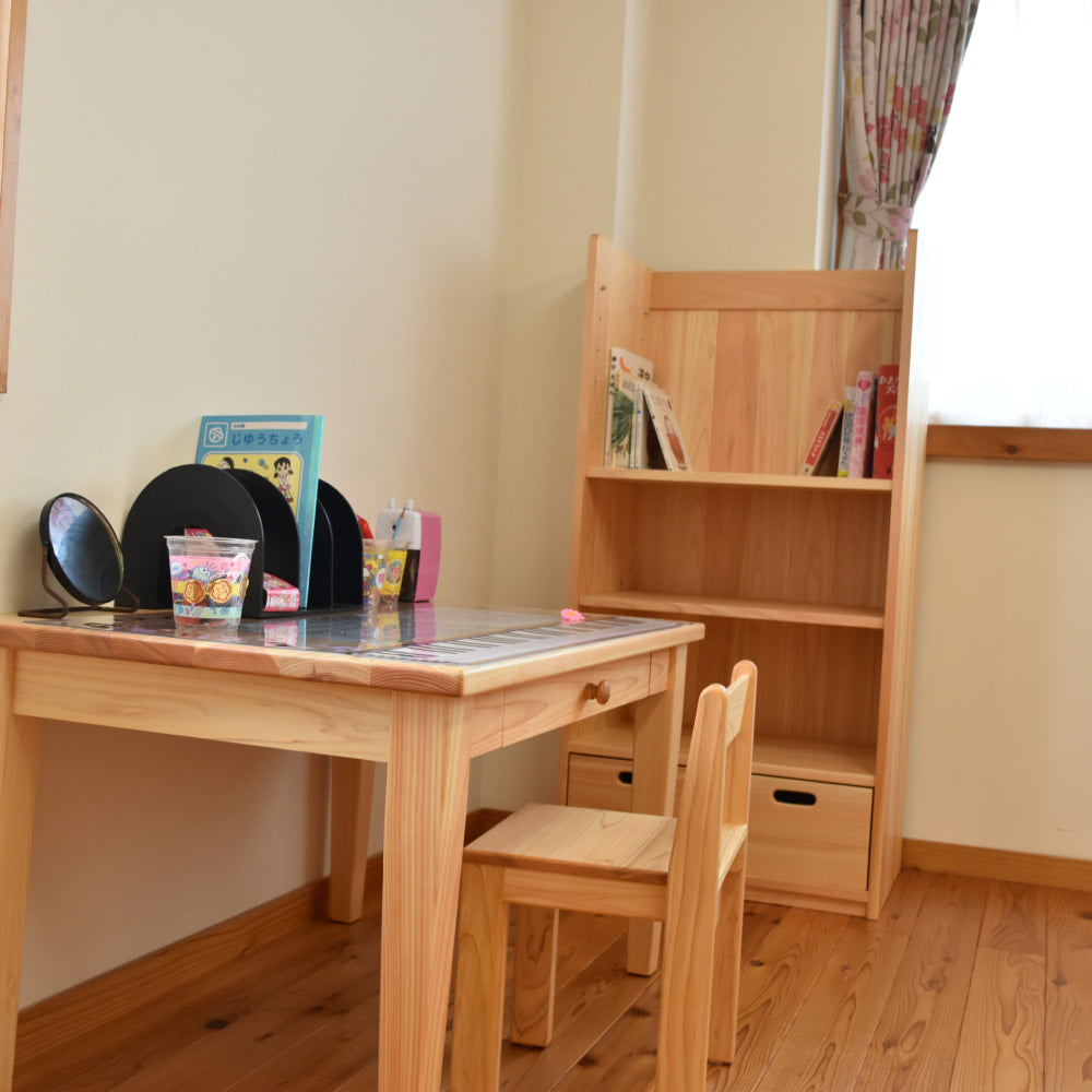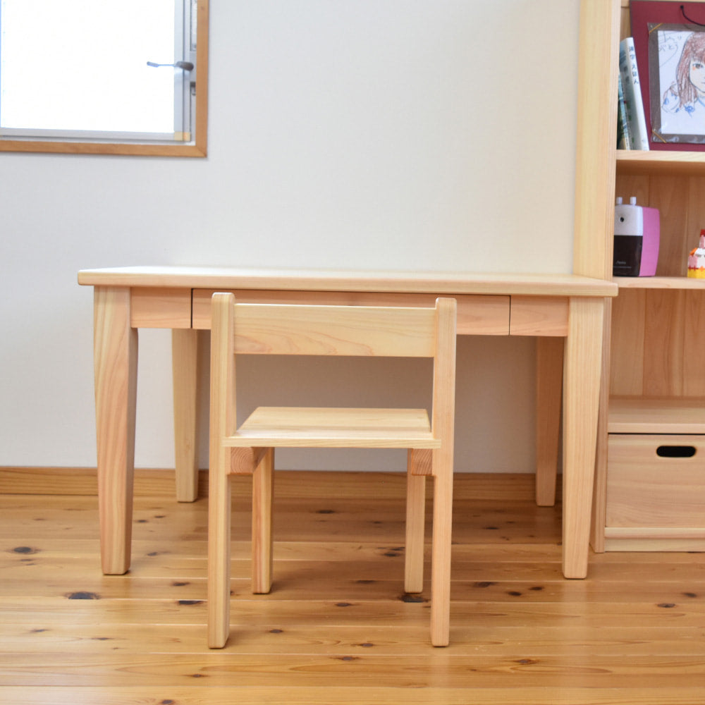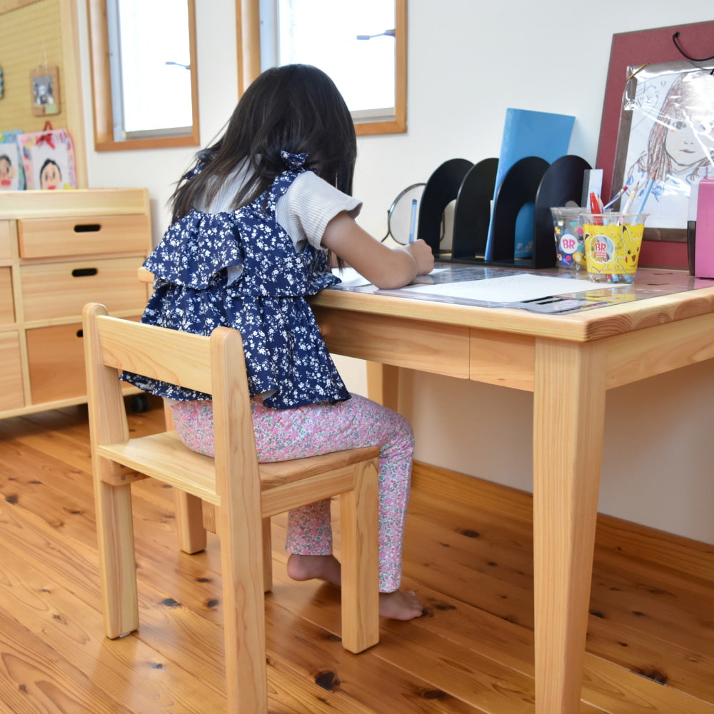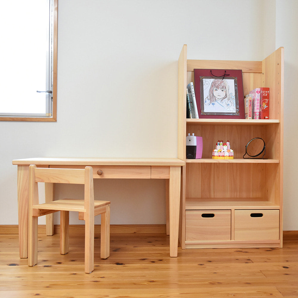 小学校入学前の4〜5歳から使える学習机セット。絵本やお絵描き、工作など、遊びの中で机に向かう習慣を自然と育みます。小学生になったら脚を交換して高さを変えられるので、長く使える国産の天然木家具です。