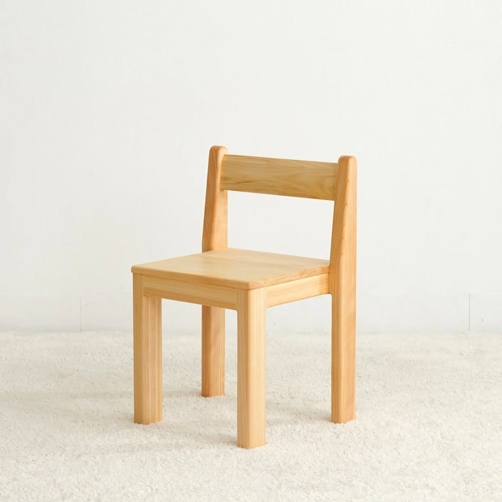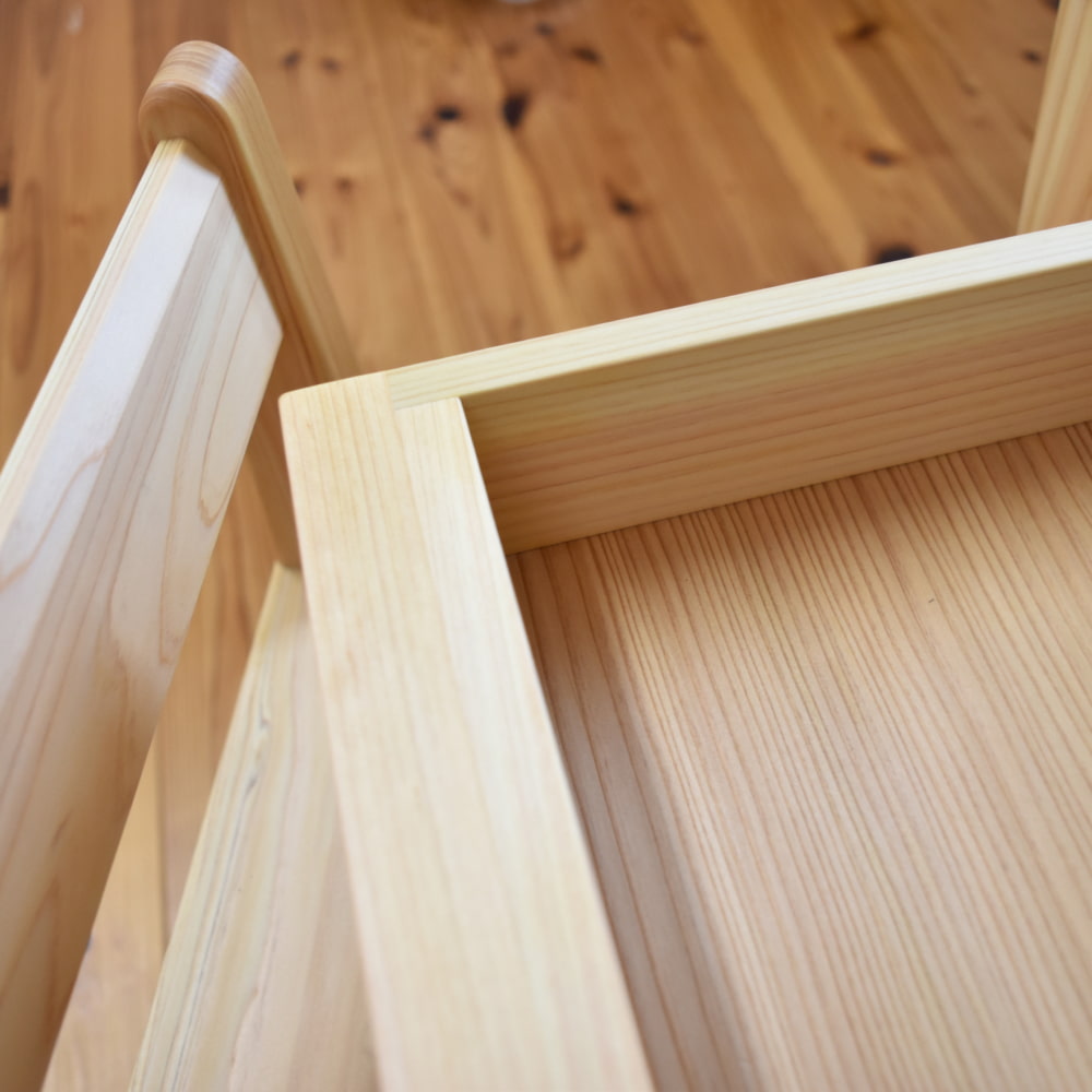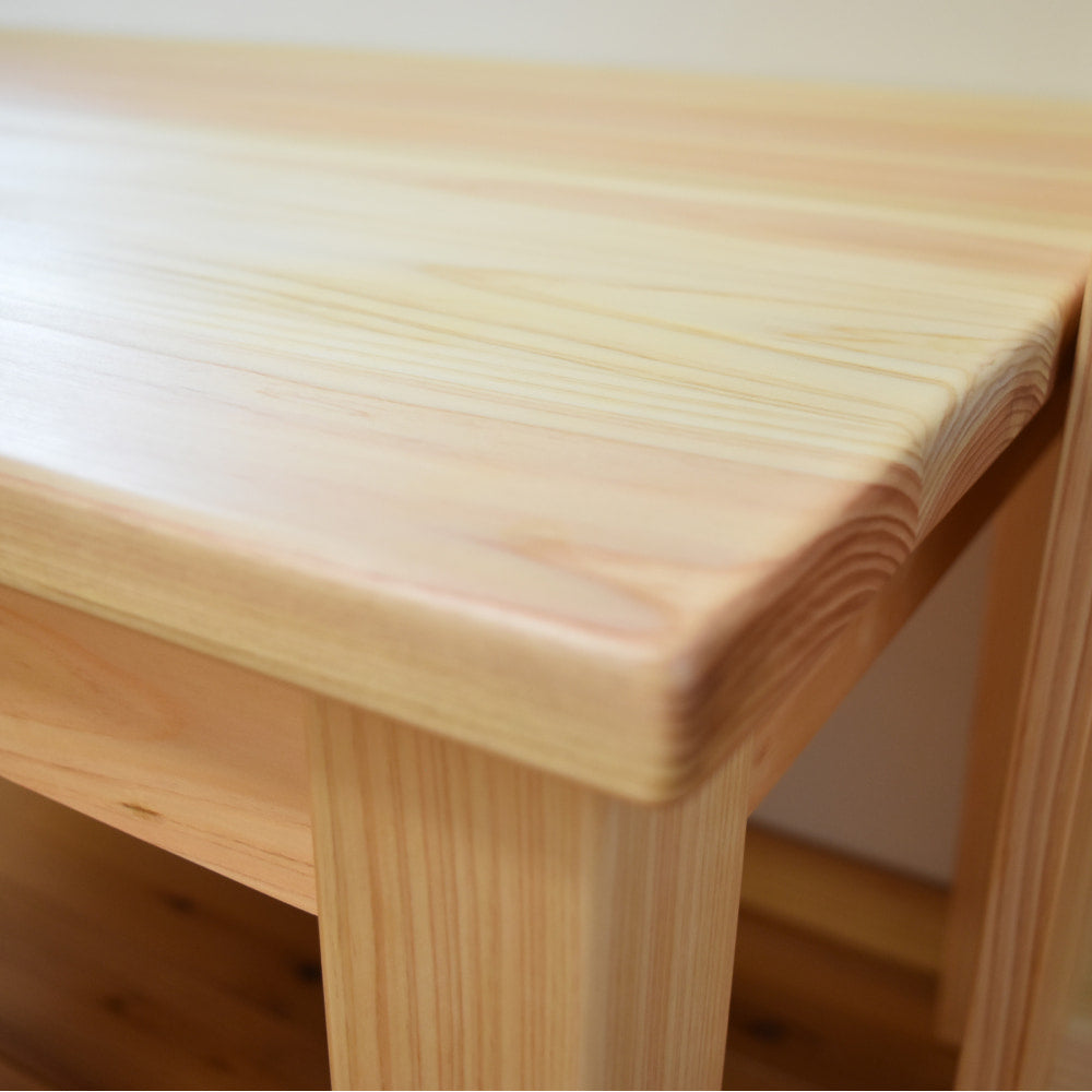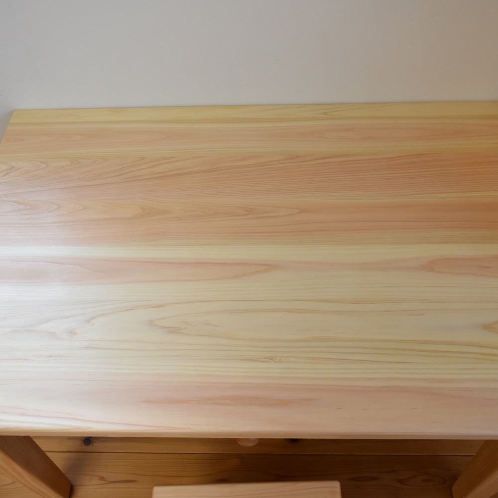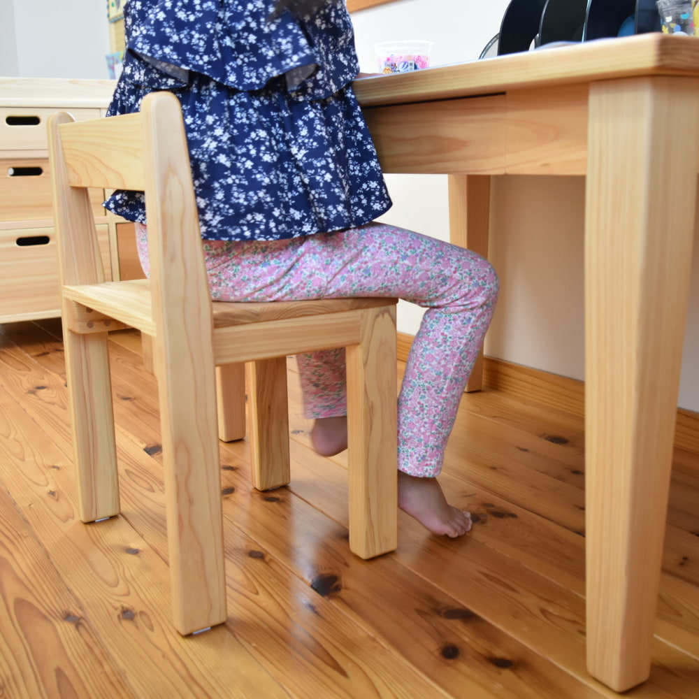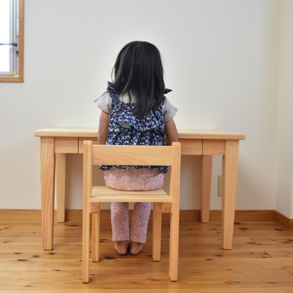セットの椅子は、保育の現場でも選ばれている「積み上げ椅子」。国産ヒノキで作られているため、金属椅子のような硬さがなく、万が一からだをぶつけても安心です。ヒノキのような針葉樹は、軽くて丈夫なのが特長。重さはわずか2kgとお子さまが自分で運べる軽さでありながら、日常使いには十分な強度があります。木ならではのやさしい質感は、はじめての学習椅子にぴったりです。