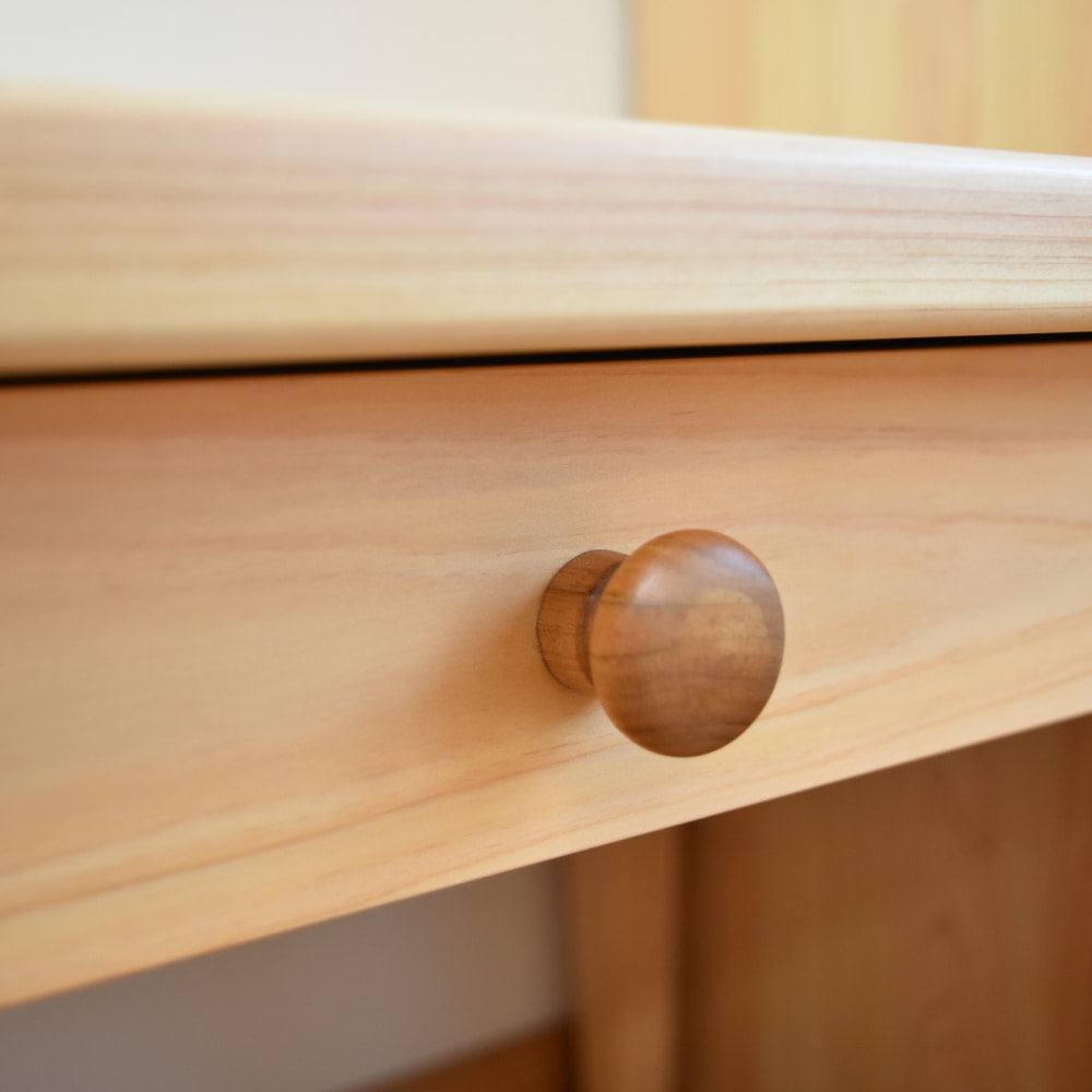 丸い取手には国産のサクラ材を使用。濃いめの色合いがアクセントになり、木の表情にリズムを加えています。毎日ふれる場所だからこそ、素材にも手ざわりにもこだわりました。