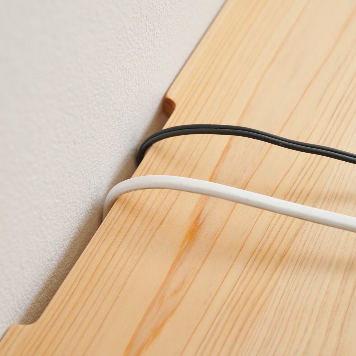 テレビの配線を抜く加工をしています。壁面にピッタリ納めてもコードを挟むことがありません。