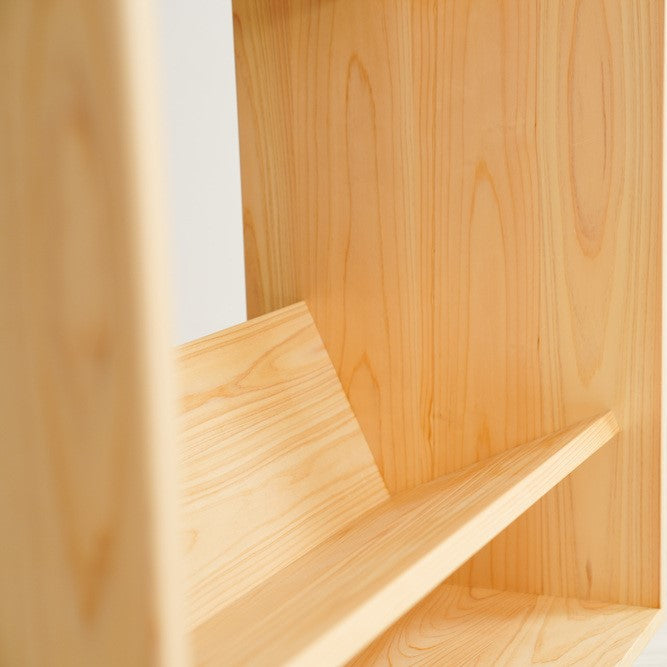 中段、下段は棚に角度をつけて、立った状態での目線からでも背表紙が見やすい作りにしています。