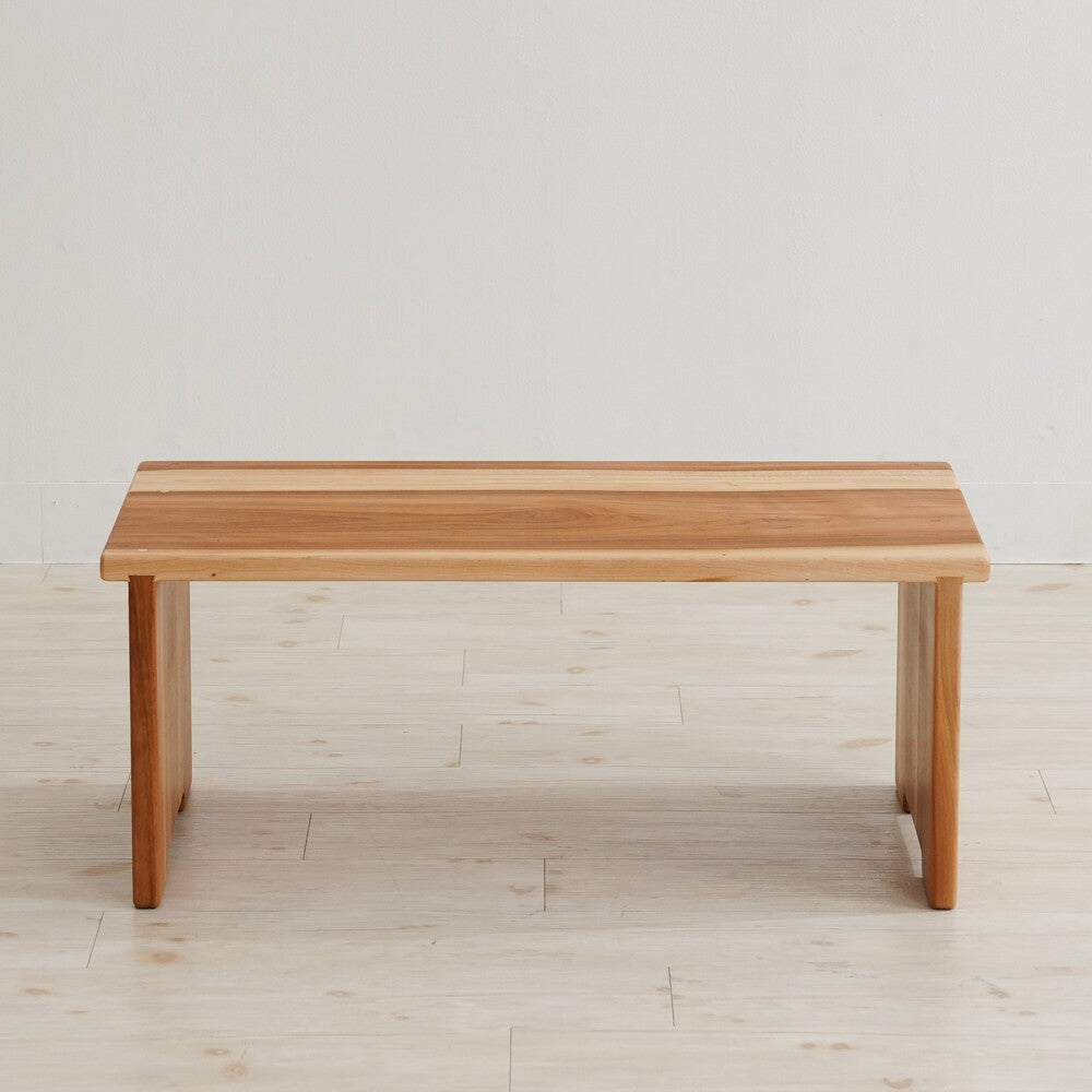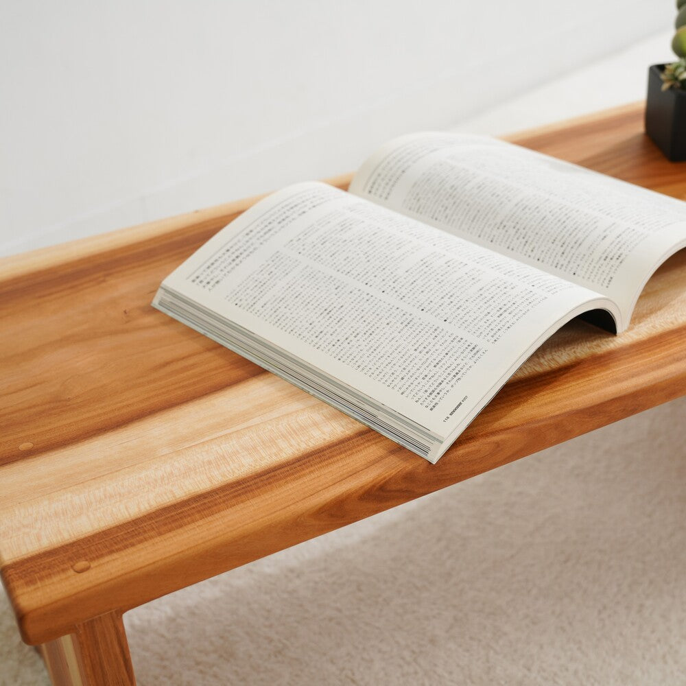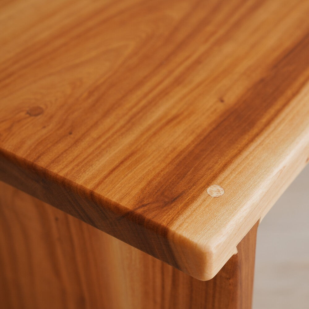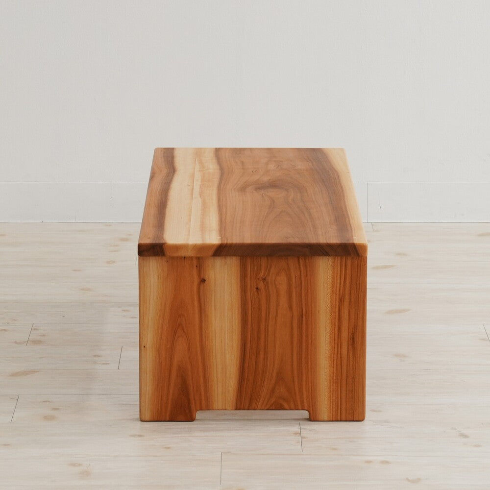 天板表面は非常に硬く、ヒノキなどの一般的な木材に比べて傷や凹みに強く、長くお使いいただける丈夫さが魅力です。シンプルなデザインの中に、シュリサクラの力強い木目が際立ち、ガシッとしたワイルドな印象を与えてくれます。