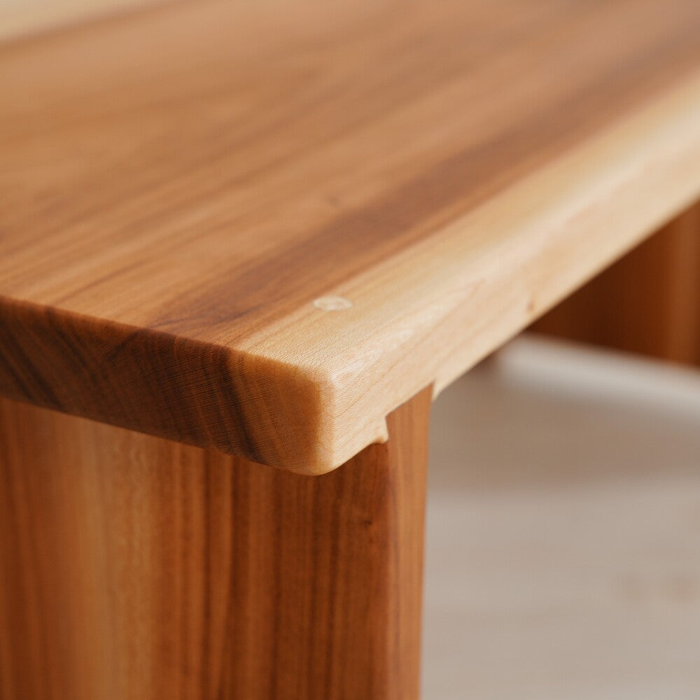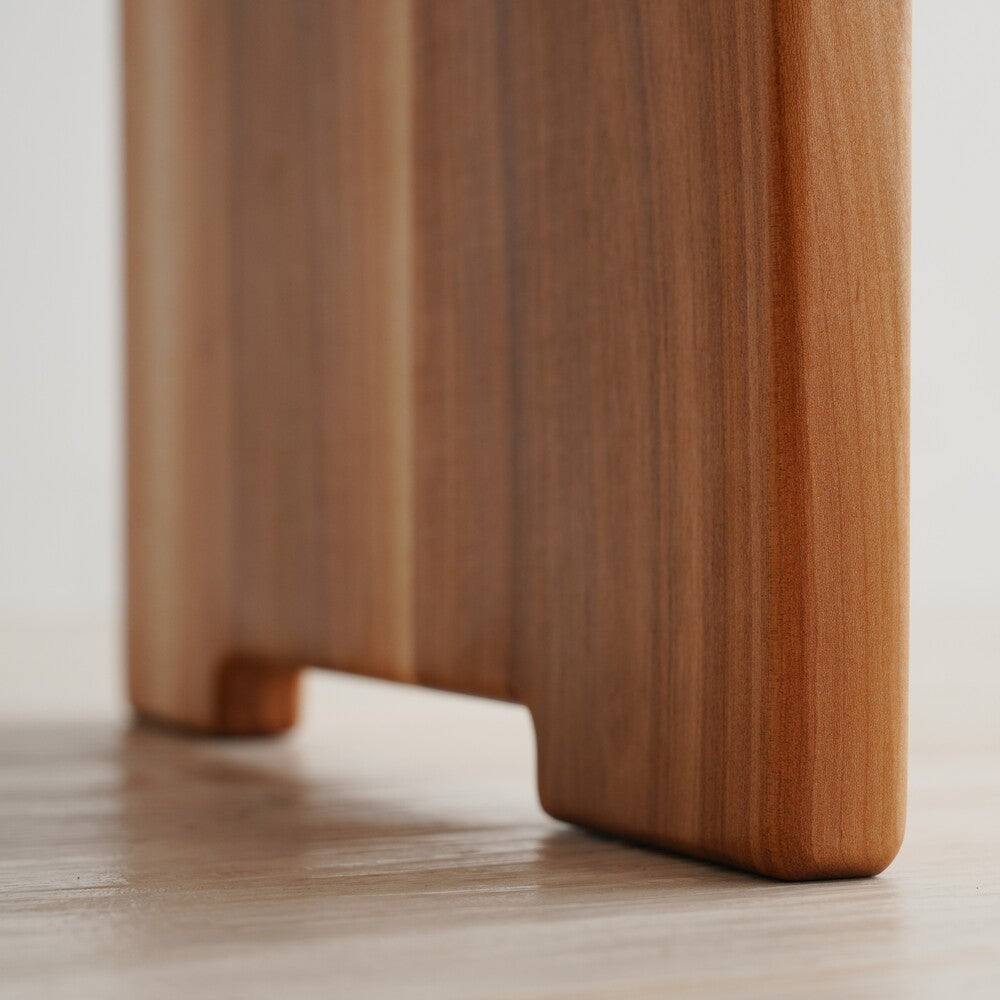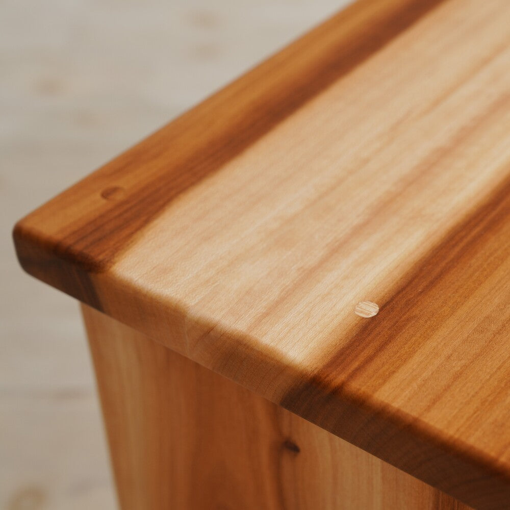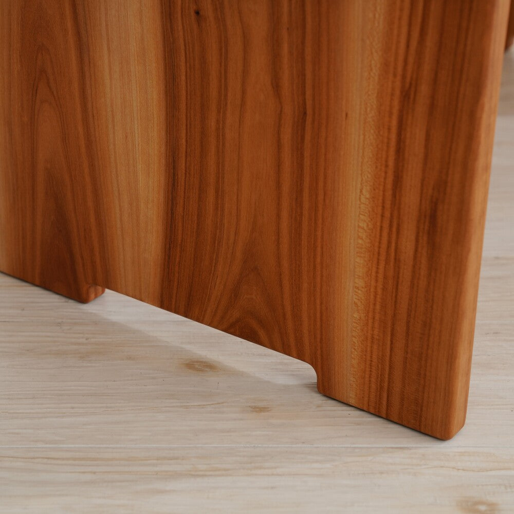 天板表面は非常に硬く、ヒノキなどの一般的な木材に比べて傷や凹みに強く、長くお使いいただける丈夫さが魅力です。シンプルなデザインの中に、シュリサクラの力強い木目が際立ち、ガシッとしたワイルドな印象を与えてくれます。