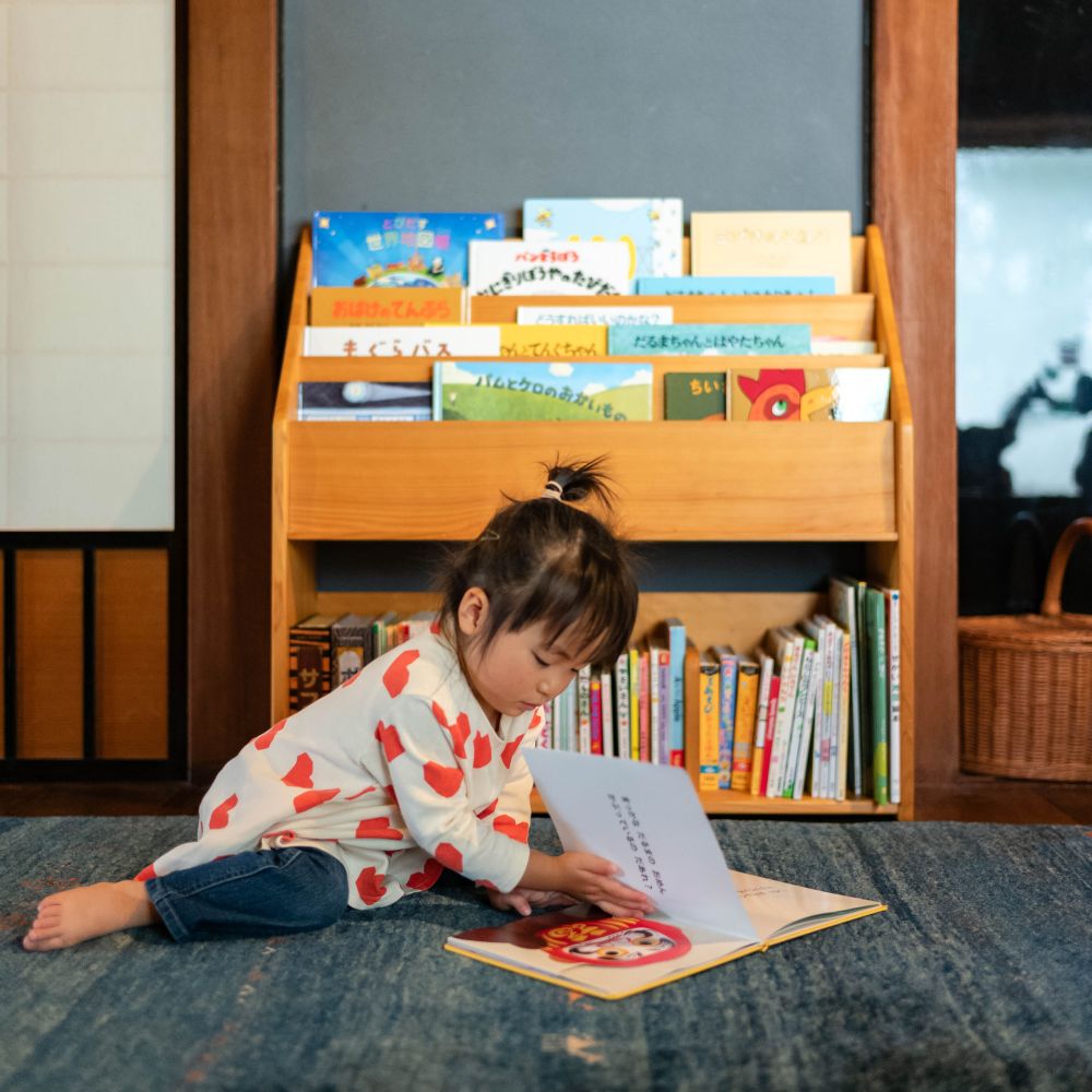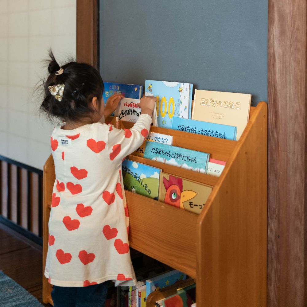 子どもの目線の高さに合わせた設計。表紙が見えることによって、本が生活の一部となり、いつの身近な存在になる中で、読む力が自然に付いてきます。自ら進んで選ぶことで主体性を育みます。
