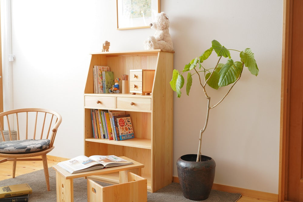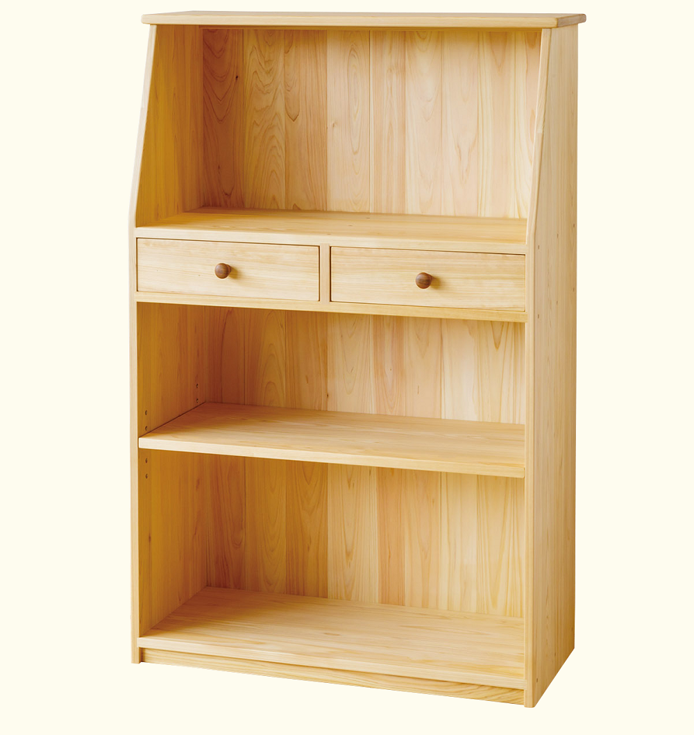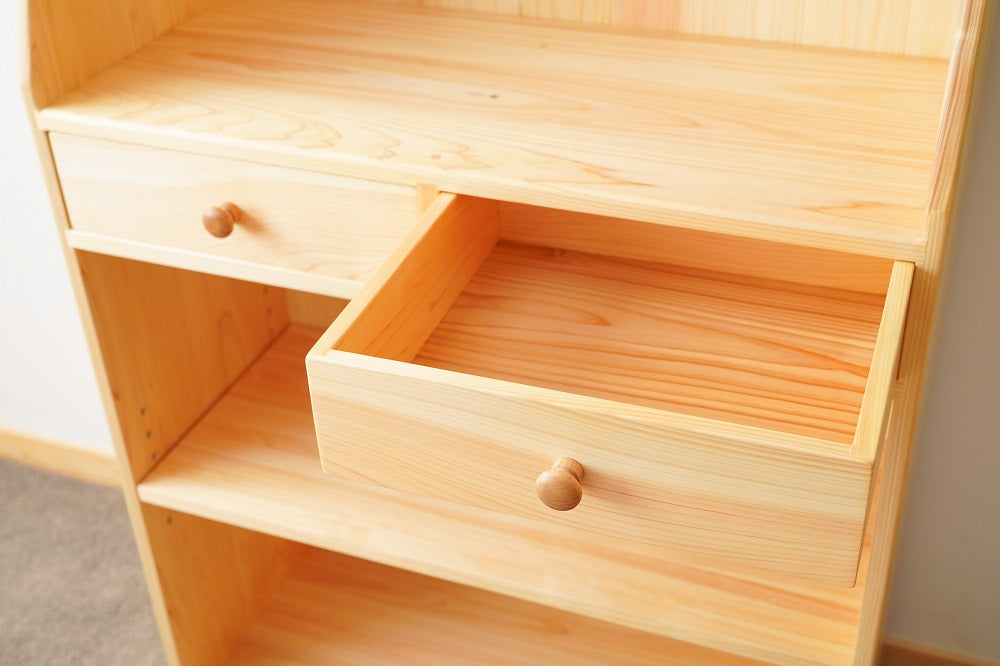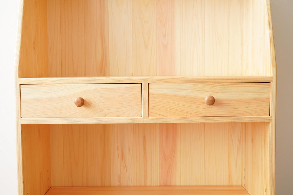 学用品の収納と本棚の機能を兼ね備えた、学用品しっかり収納チェスト。便利な小引き出しも付いています。子ども家具専門店のつくる国産ひのきの収納棚。お子様が口にいれても安心な塗料で仕上げています。