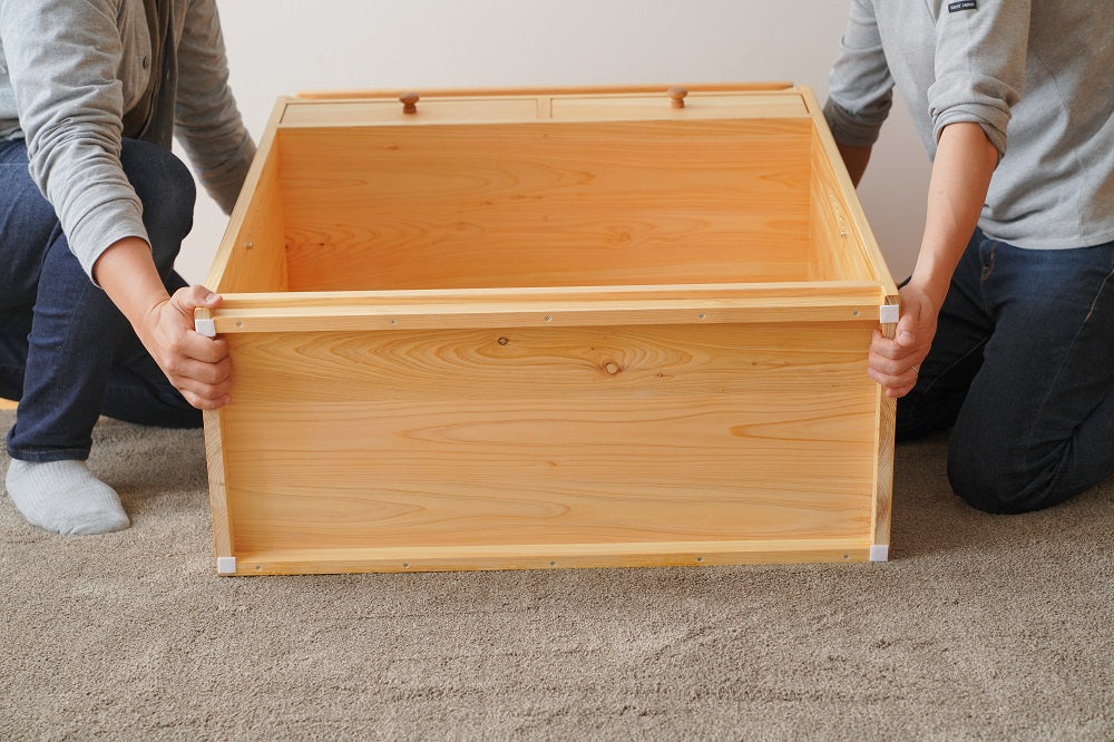 湿気の多い時期には膨らみ、乾燥すると収縮します。木の乾燥は十分に行っているのですが、稀に木のおもちゃの箱に亀裂が入ったり、家具の引出しが少し抜けにくかったりといった動きが見られる場合があります。