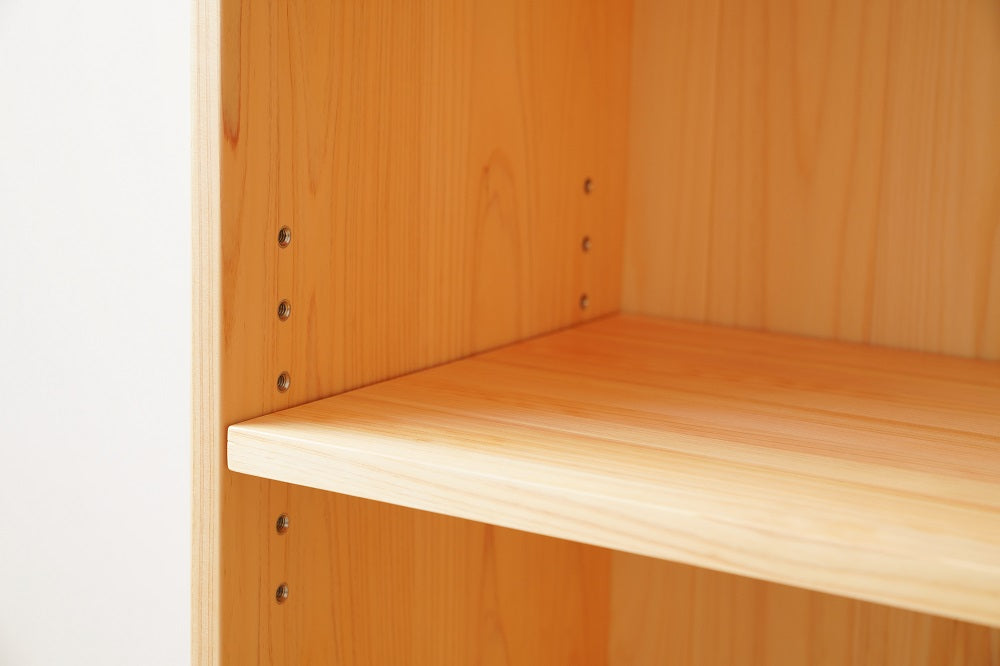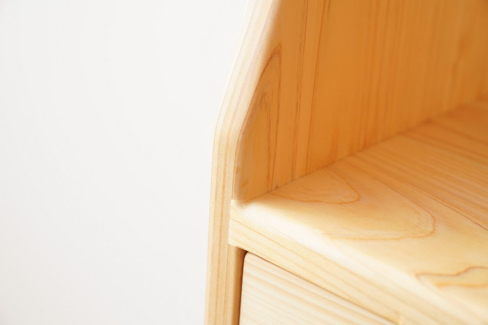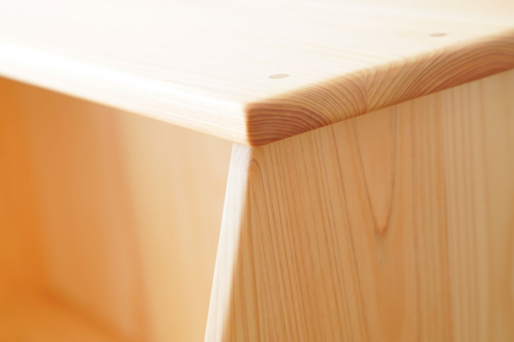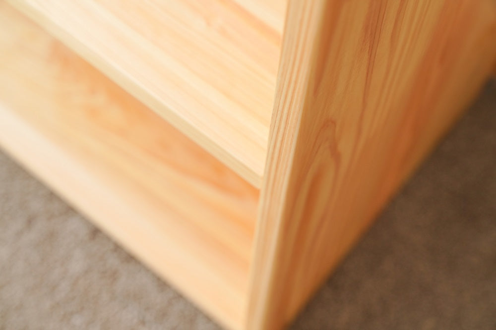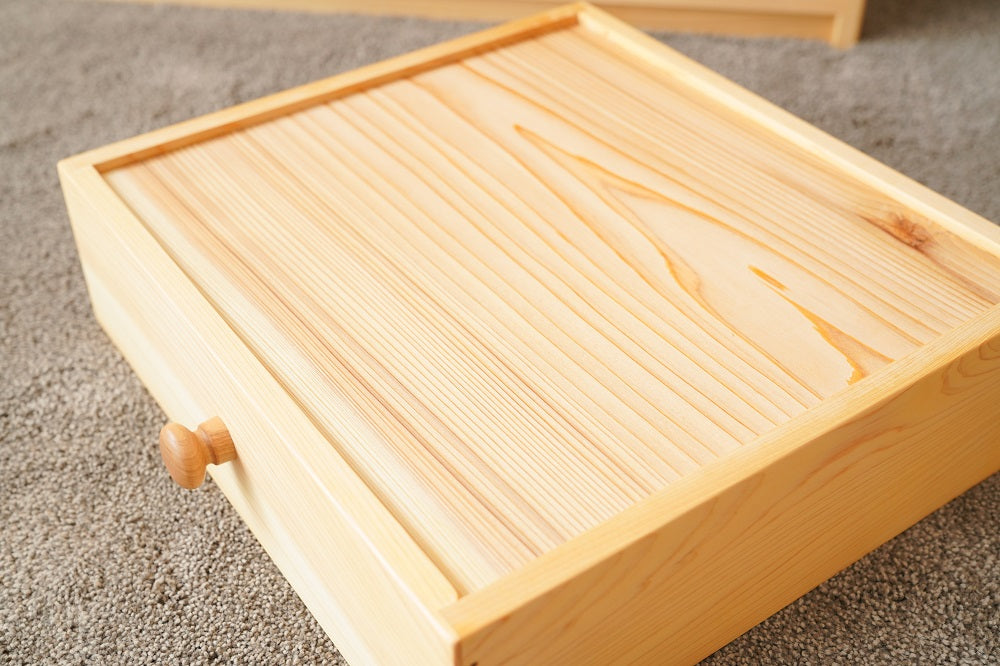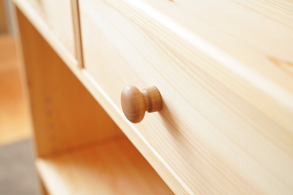 引出しの底板には杉の一枚板を使用します。引出しは合板やベニヤ板を使用するケースが多いのですが、なかよしライブラリーでは木製にこだわり日本建築の天井板と同品の杉一枚板を使用します。開けた時の香りが抜群に良く、部屋全体を木の香る空間にしてくれます。