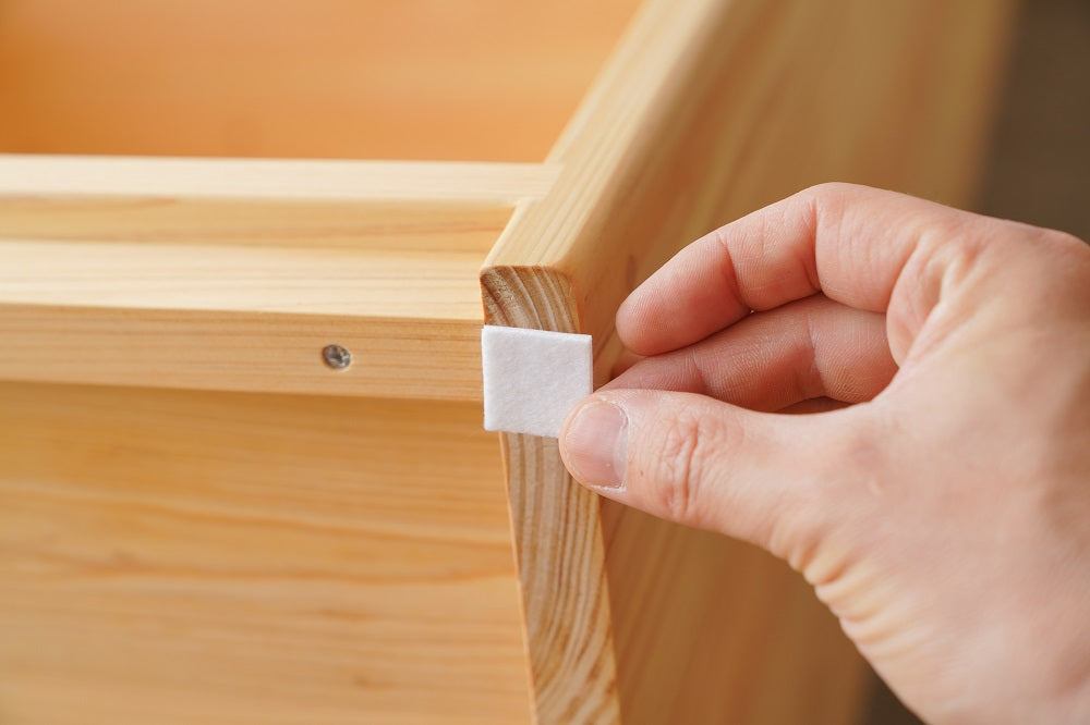 同封のフェルトを脚の下に貼って下さい。家具を動かす時にスムーズに、そして床を保護する役目があります。