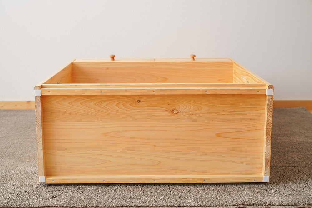 使用する本体の木材はすべて節のない所のみを厳選した高知県産ヒノキです。また合板で作られた家具は表面がめくれたり、買い替え時期が早い一方で、無垢材で作られた家具はめくれることなく永くお使いいただけます。