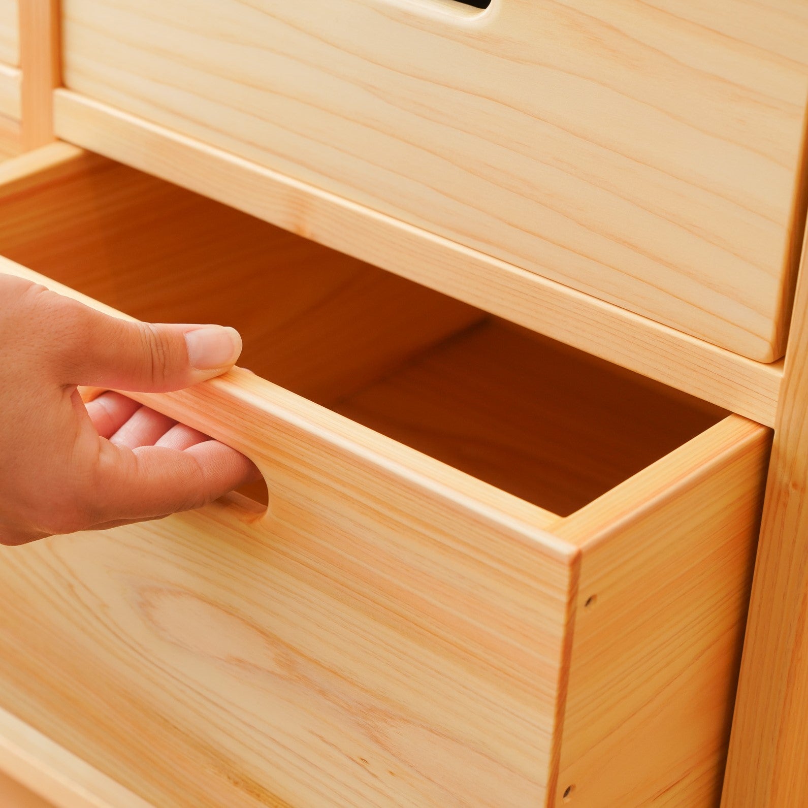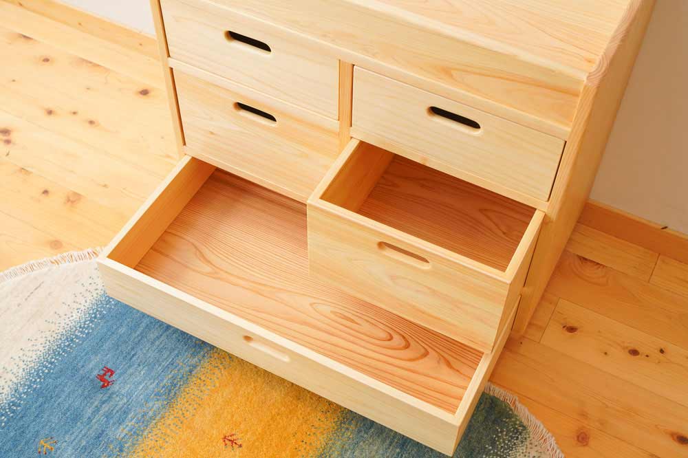 湿気の多い時期には膨らみ、乾燥すると収縮します。木の乾燥は十分に行っているのですが、稀に木のおもちゃの箱に亀裂が入ったり、家具の引出しが少し抜けにくかったりといった動きが見られる場合があります。