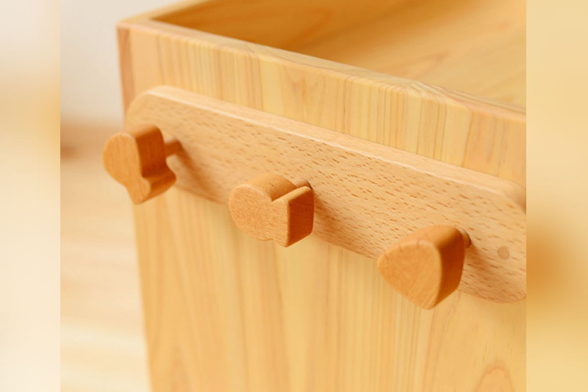 遊びの道具や絵の道具、生活のための各種道具を収納してください。家具の上には鉛筆や筆などを置きます。ランドセルやカバンもドカンとおけます。側面にフックを取り付けることができますので、ご注文の際にコメントをご記入ください。