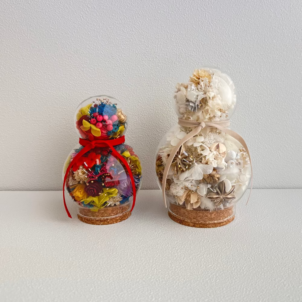 ガラスボトルの中に、数種類のドライフラワーや木の実、クリスマス飾りを入れた、ボトルフラワー。