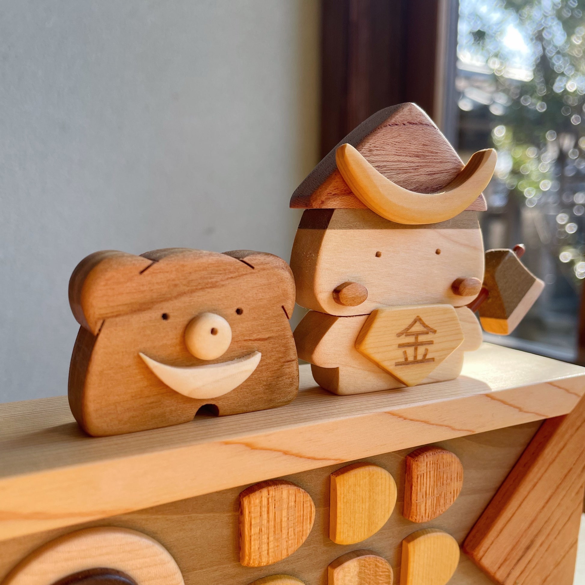 金太郎とクマの人形、こいのぼりをモチーフにした木箱、名札のセット。コンパクトながら、物語を感じられる佇まいで、お部屋にやさしく季節の彩りを添えてくれます。