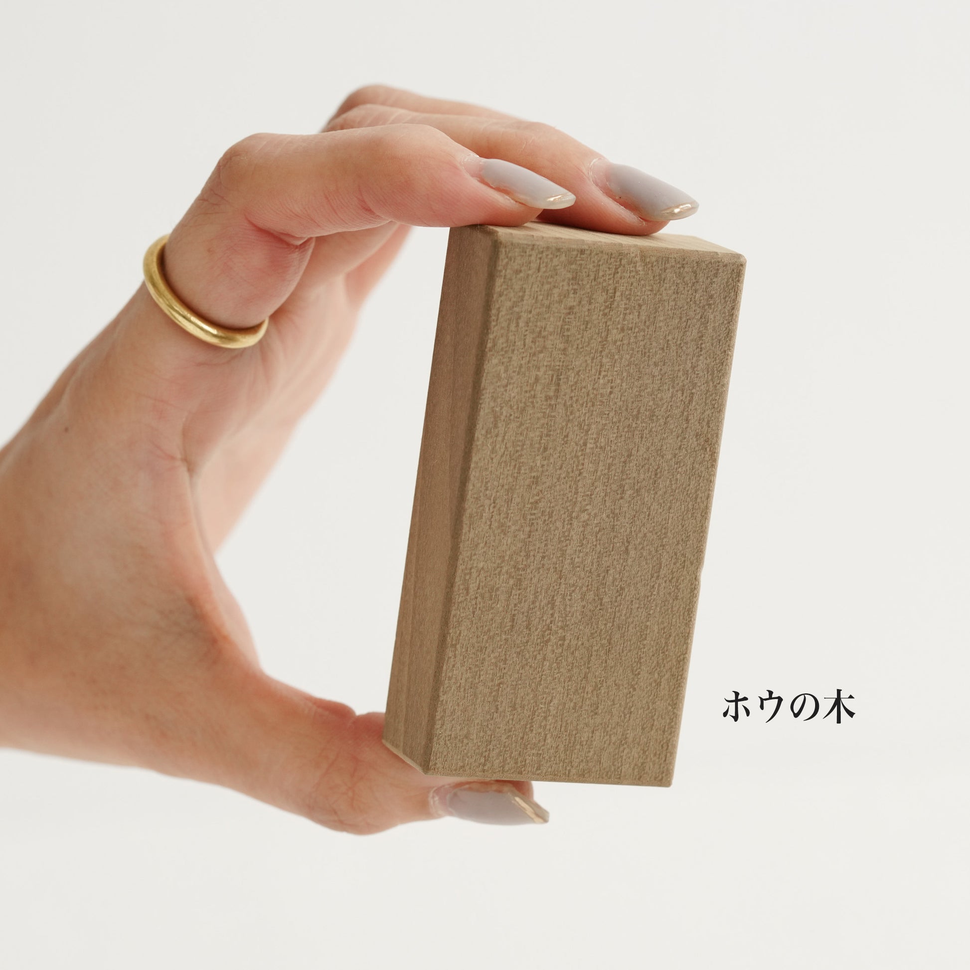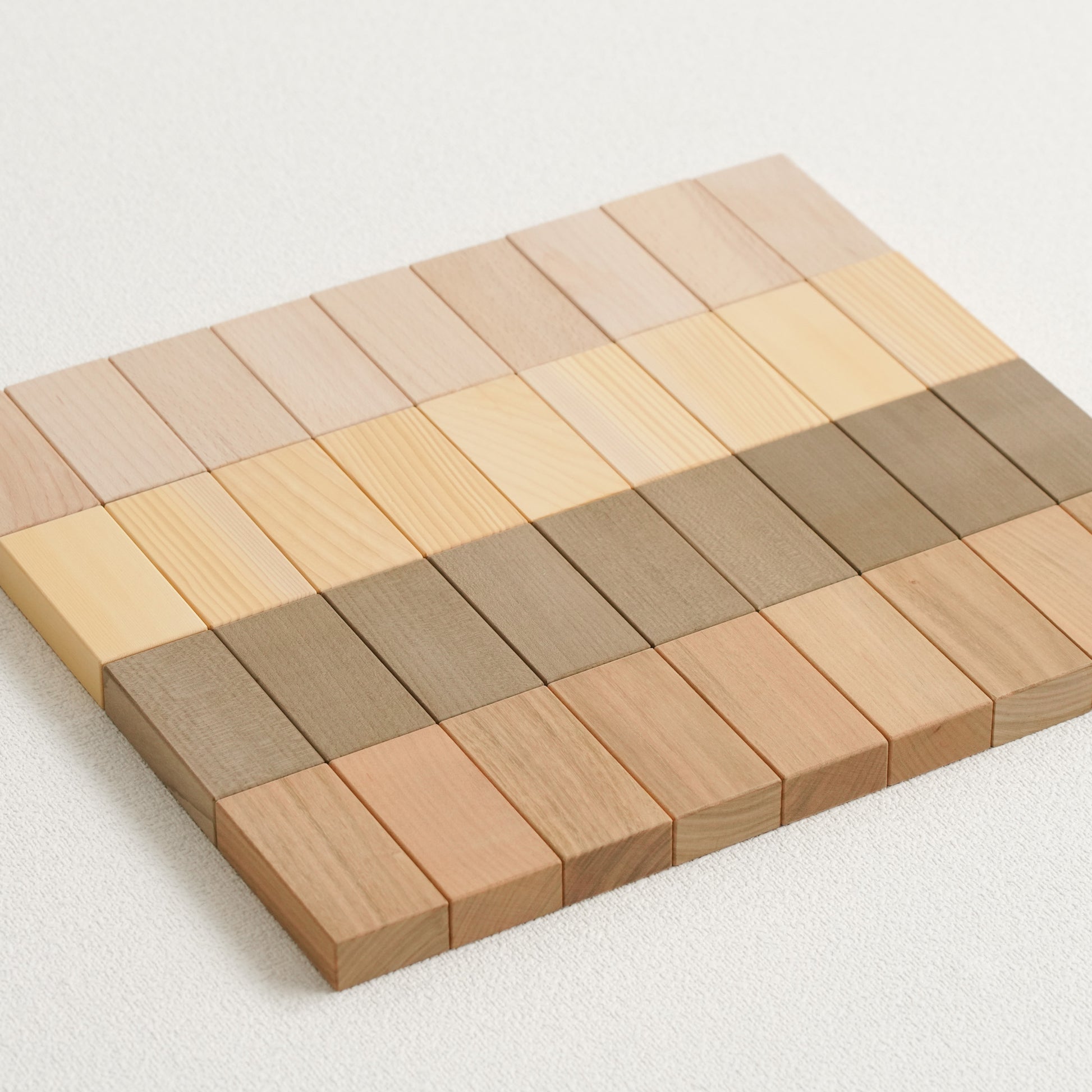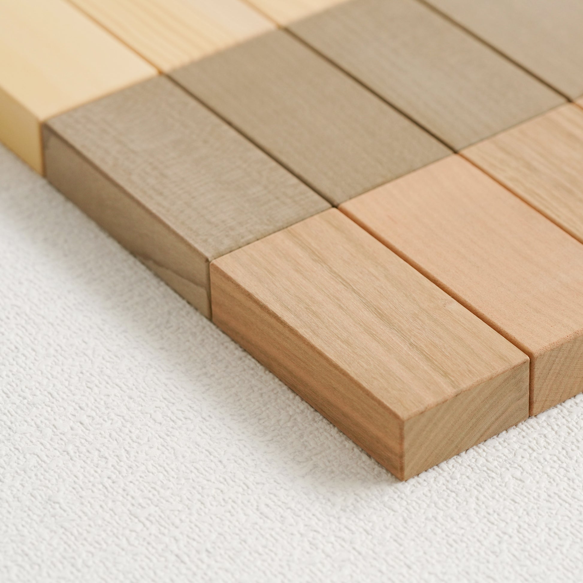 木にふれ、自然に親しみをもち、豊かな心と感性を木のおもちゃを通して育みたい。木育積み木『にーかけよん』はそんな思いから作りました。使用している樹種は数ある中から特徴がある、4種類の樹種に厳選しています。材種ごとの重さや堅さ、香りを感じていただき、積み木を通じて木に親しみを感じていただけると嬉しいです。