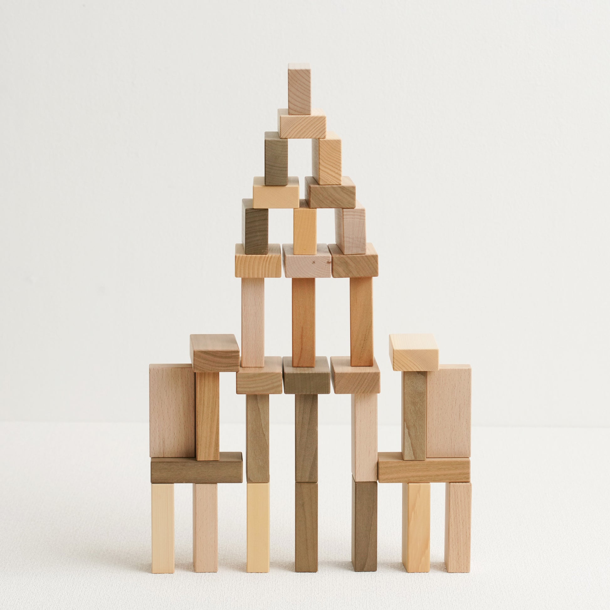 1歳頃から積み木やブロックを積み上げられるようになってきます。積み木遊びは子どもたちの想像力を自由に発揮できるアイテム。にーかけよんは遊びやすく、とてもカラフルな広葉樹の組み合わせでお届けします。