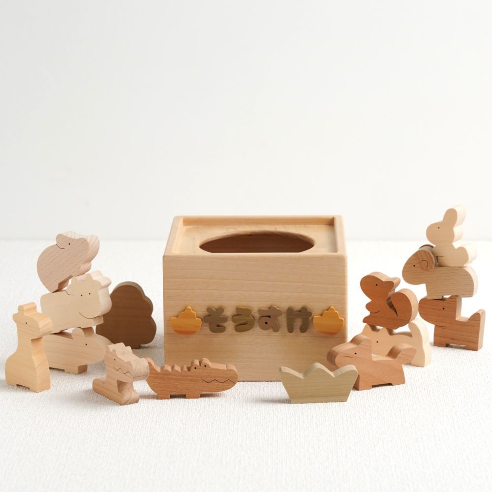 箱の中には、かわいい木の動物たちが16種類。赤ちゃんが中をのぞき、小さな手で一つずつ取り出す体験から、「見て」「触れて」「言葉で表す」ことの楽しさが自然に生まれます。