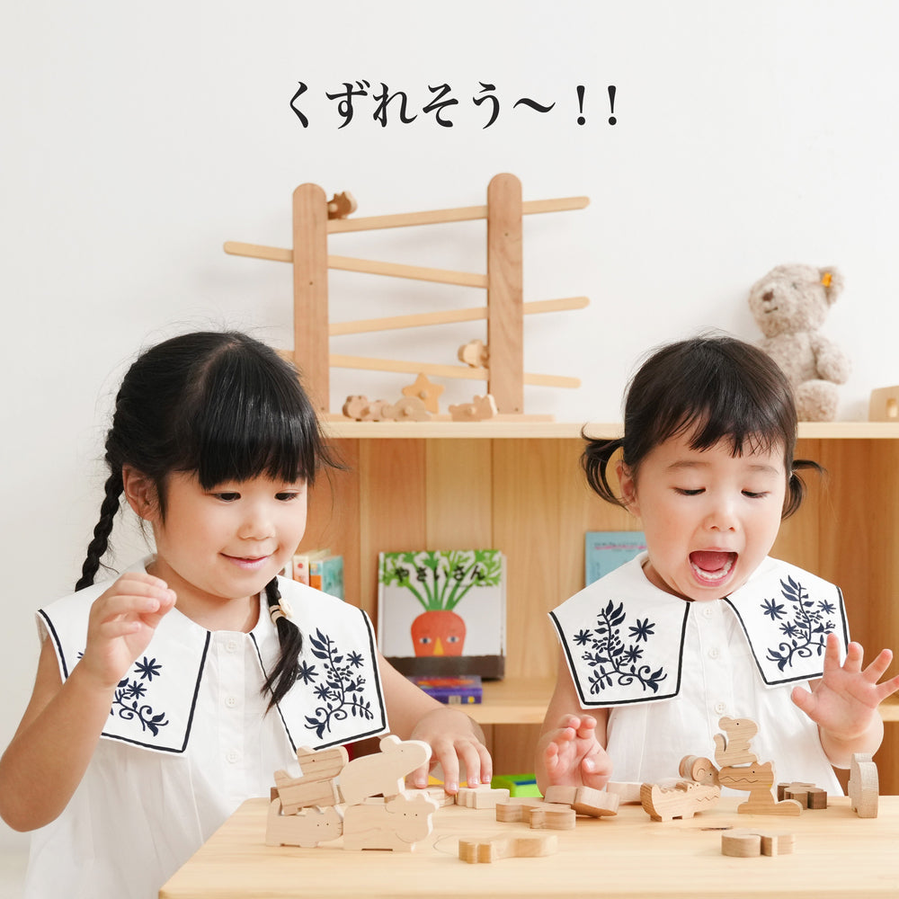 動物たちはバランスを取りながら上に積むことができ、積み木遊びとしても楽しめます。動物の形によって積み方に個性が出るので、親子で「どう積もうか?」と会話しながら楽しめます。わにさんどこ行くの?へー向こうの台所まで・・・うさぎさんは?など、いろいろお話をしているうちに動物に愛着ができて、お友達状態に。