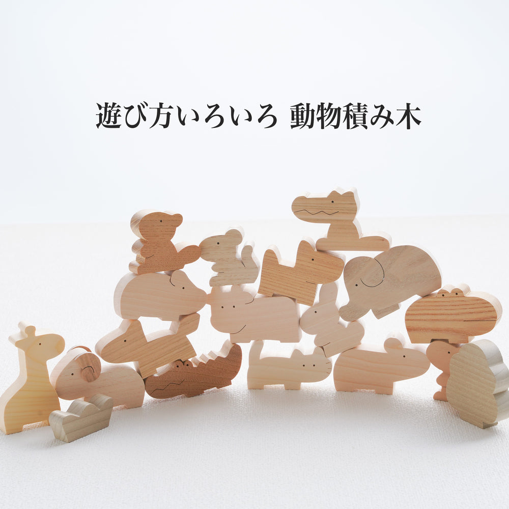 「動物積み木」は、8ヶ月頃から5歳頃まで長く楽しめる木のおもちゃです。名入れ(レーザー加工・切り文字)が可能なため、世界にひとつだけの特別なおもちゃになり、お誕生祝いやご出産祝いに大変喜ばれています。