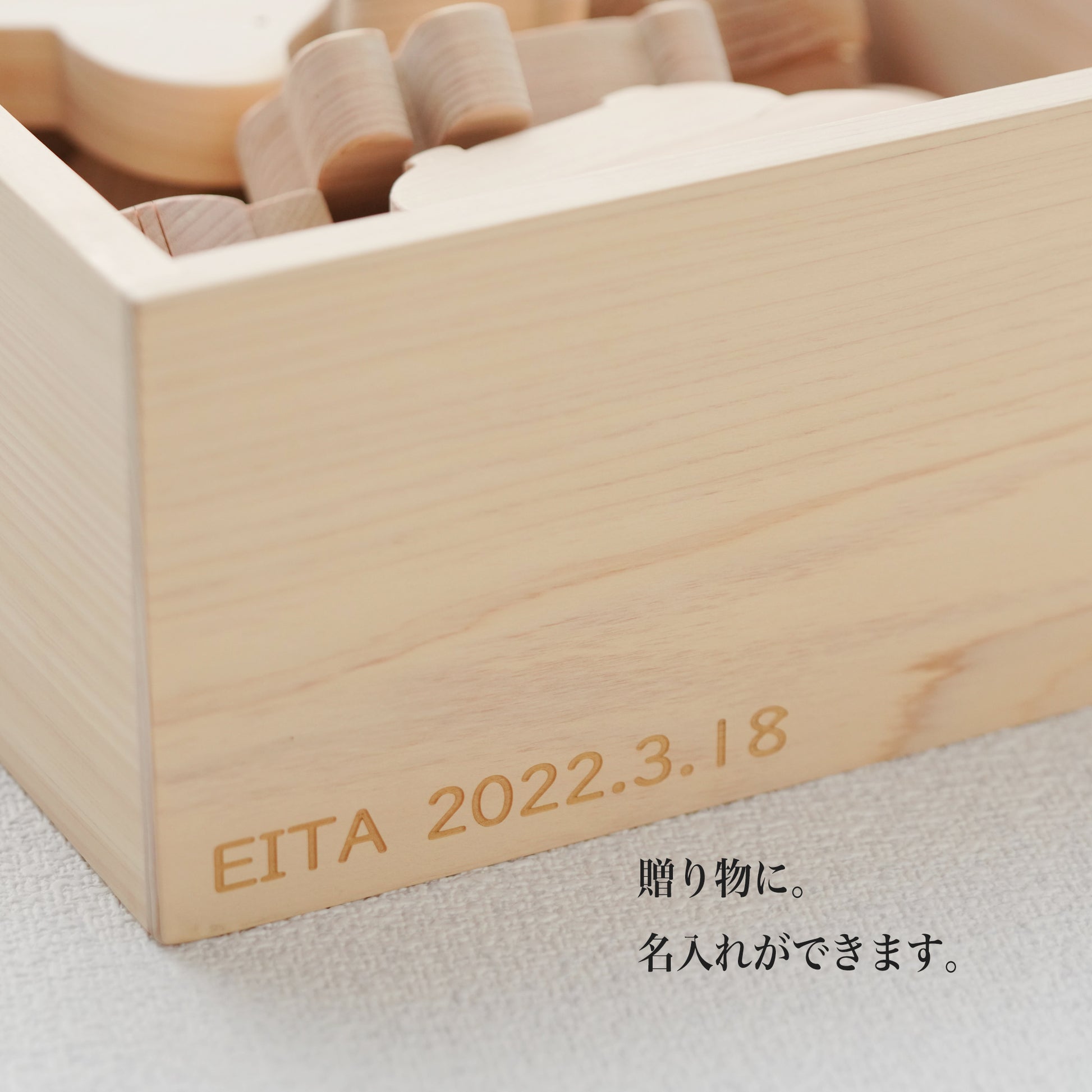 ヒノキの専用箱入り&名入れ(レーザー刻印)対応なので、世界に一つだけのギフトとして喜ばれます。名前は漢字・ひらがな・ローマ字に対応しています。
