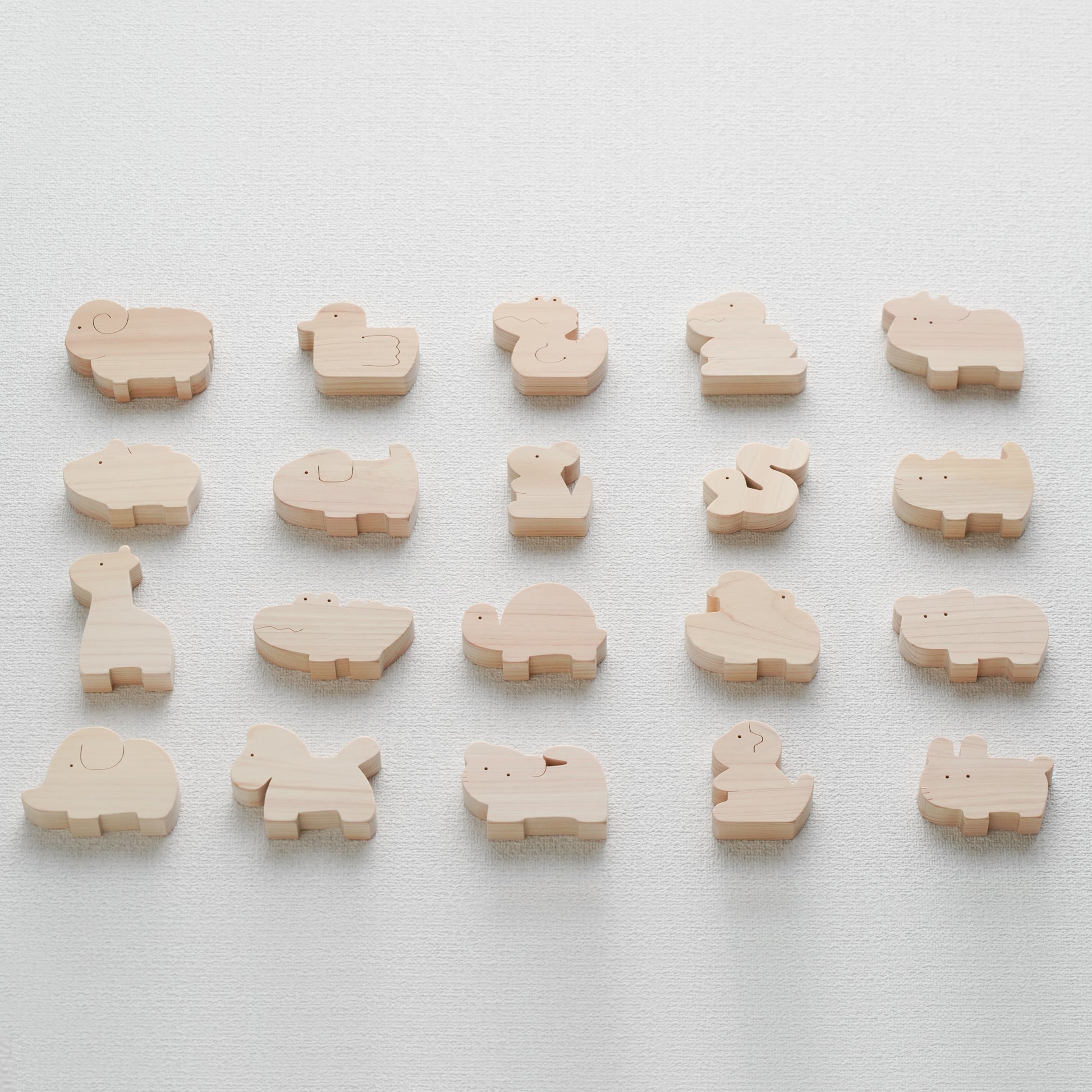 高知の豊かな森で育った国産ヒノキ使って、20種類の動物をひとつひとつ丁寧に手づくりしました。うさぎ・ぞう・きりんなど、バリエーション豊かな仲間たちが勢ぞろい!
