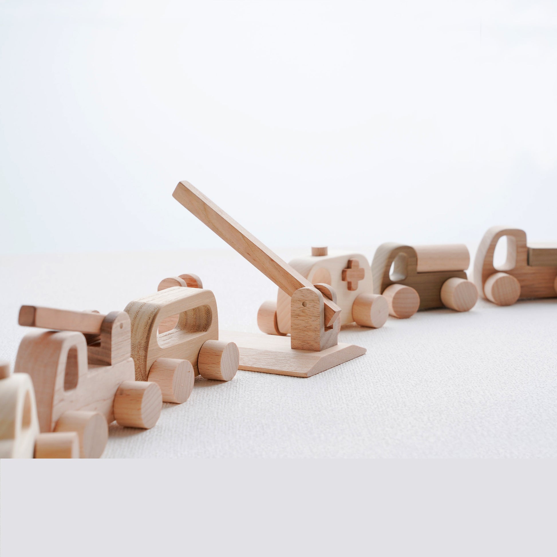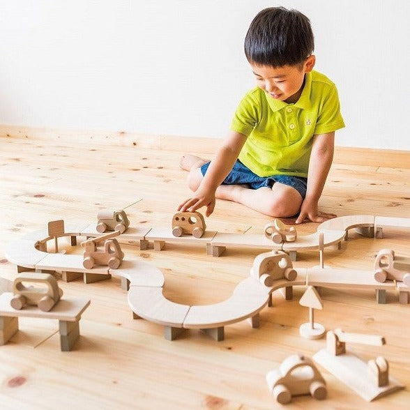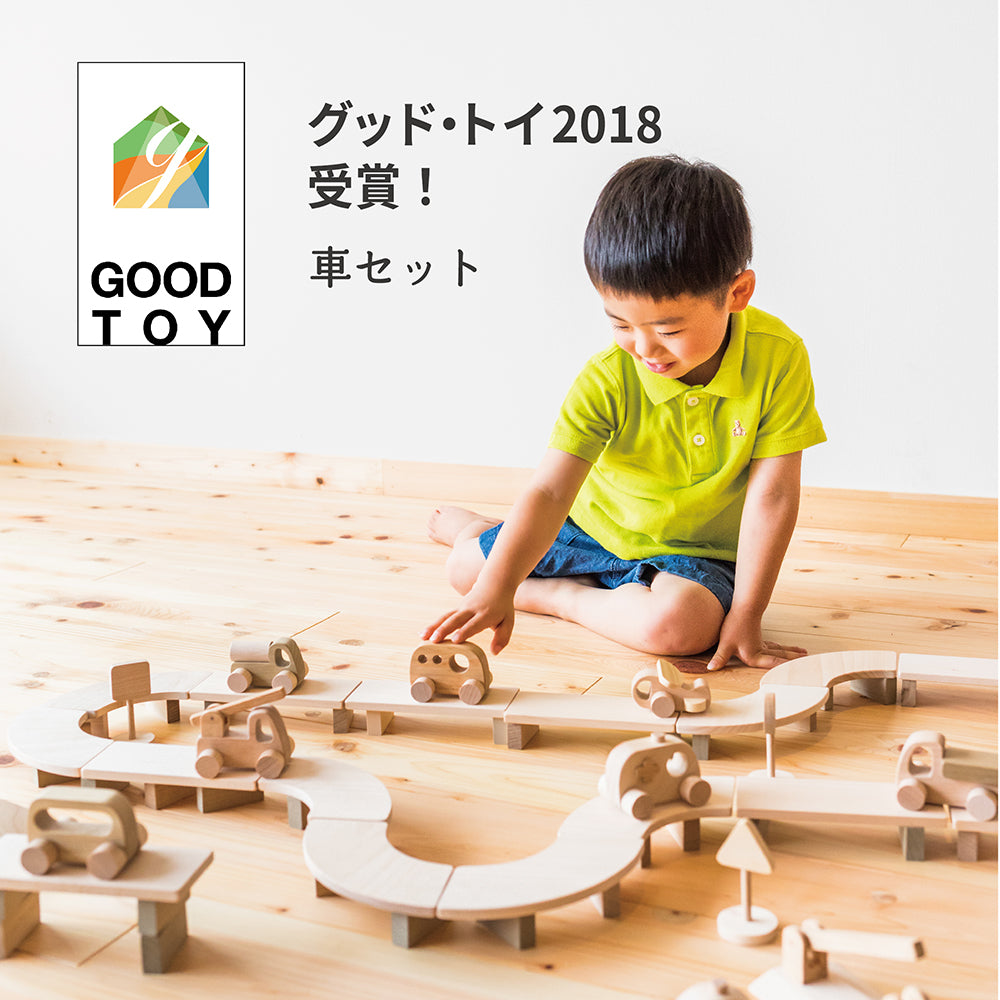 「車セット」は、発売開始から20年、多くのご家庭で愛され続けている木製のくるまのおもちゃです。