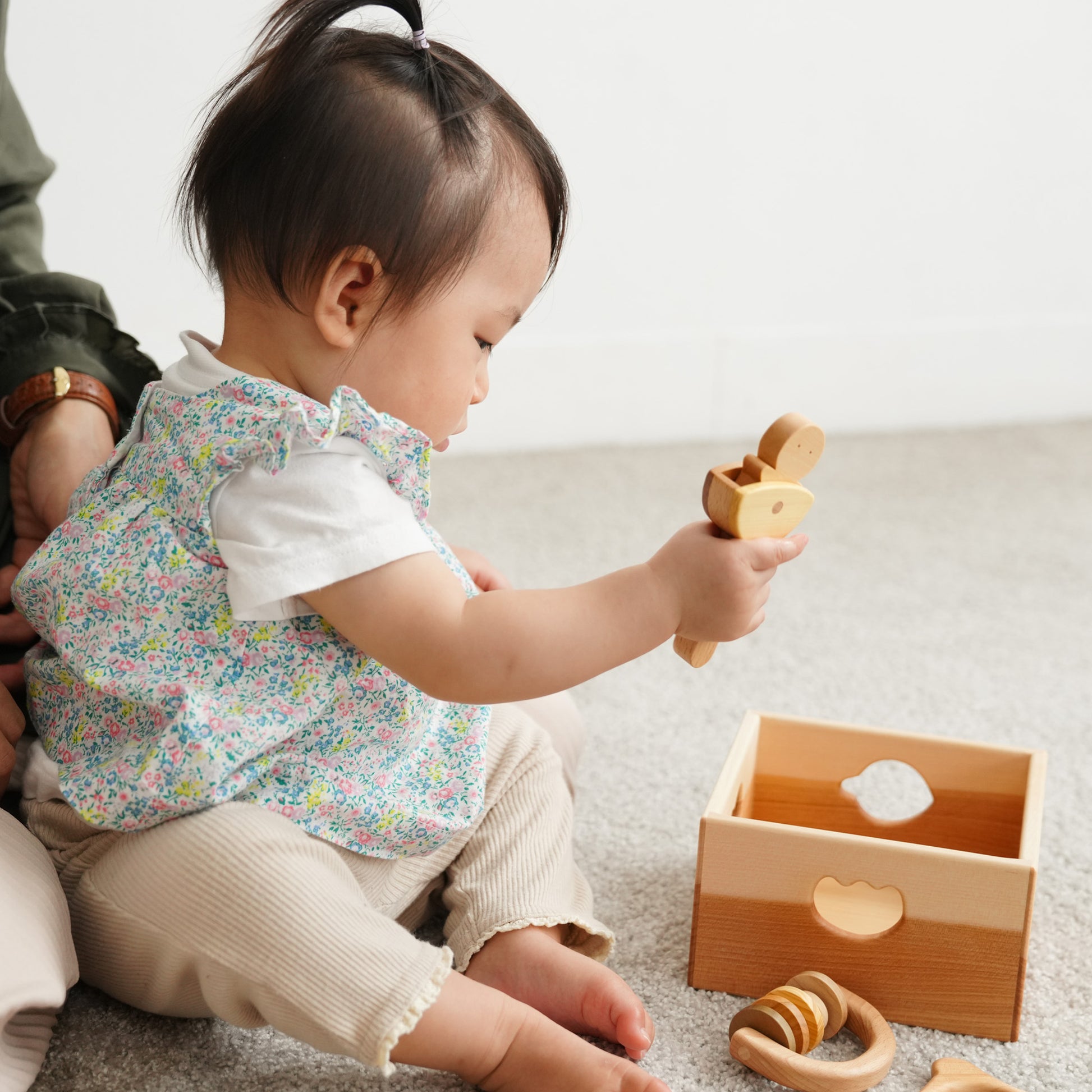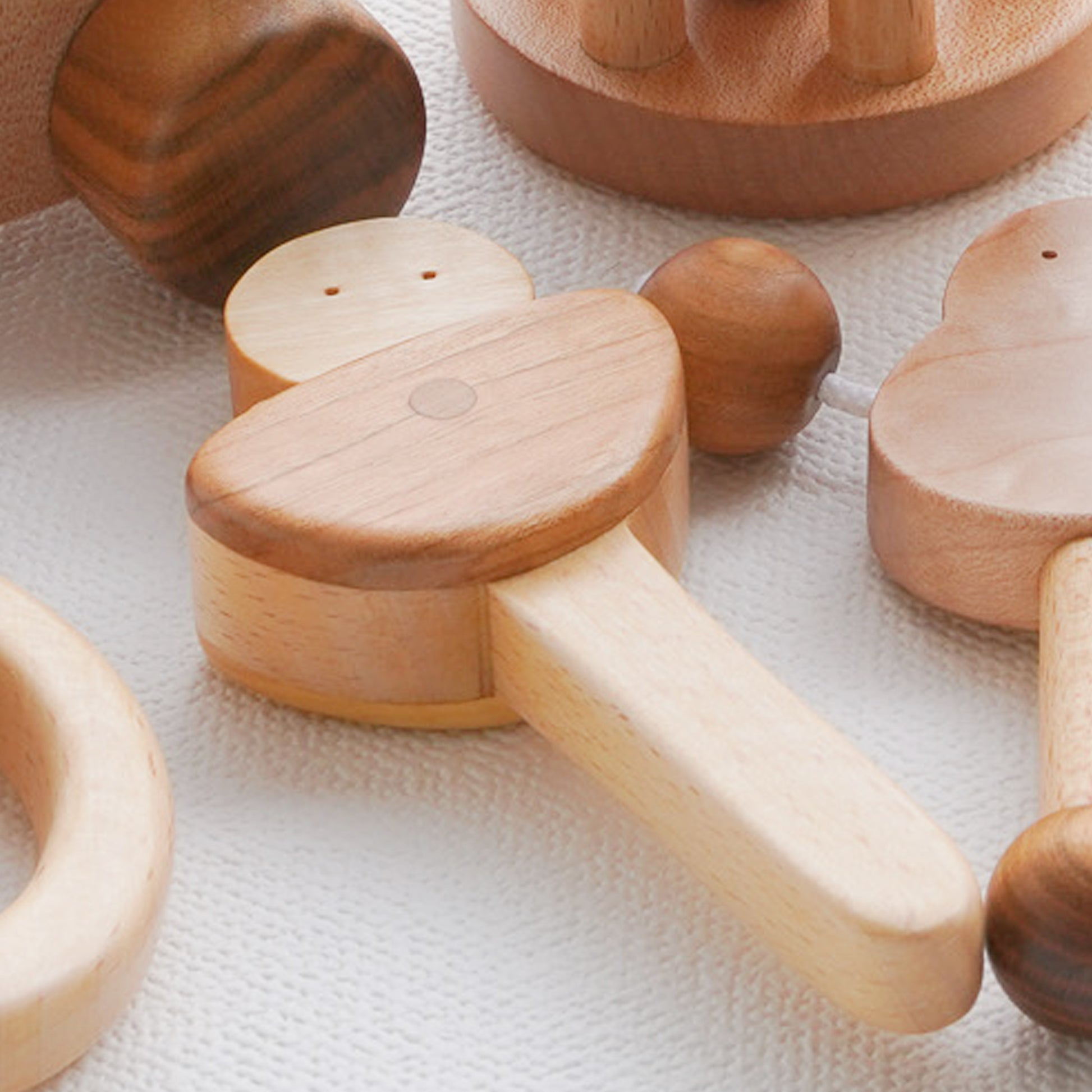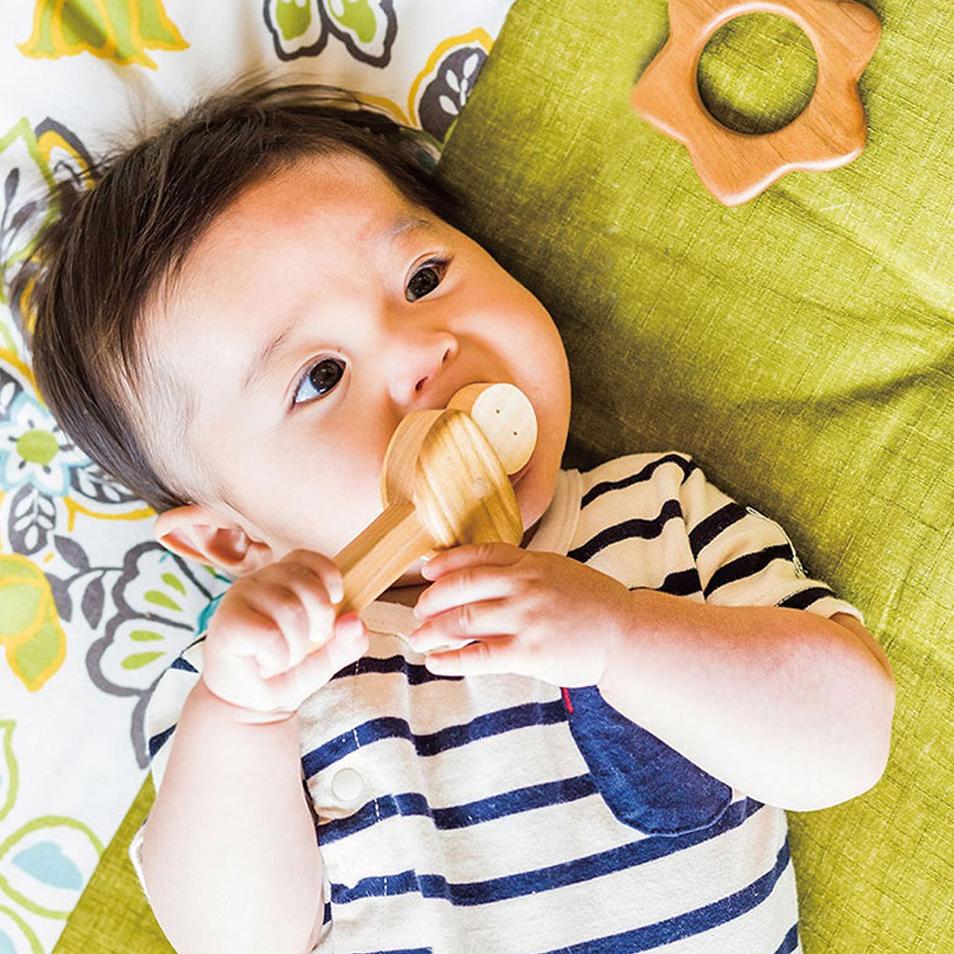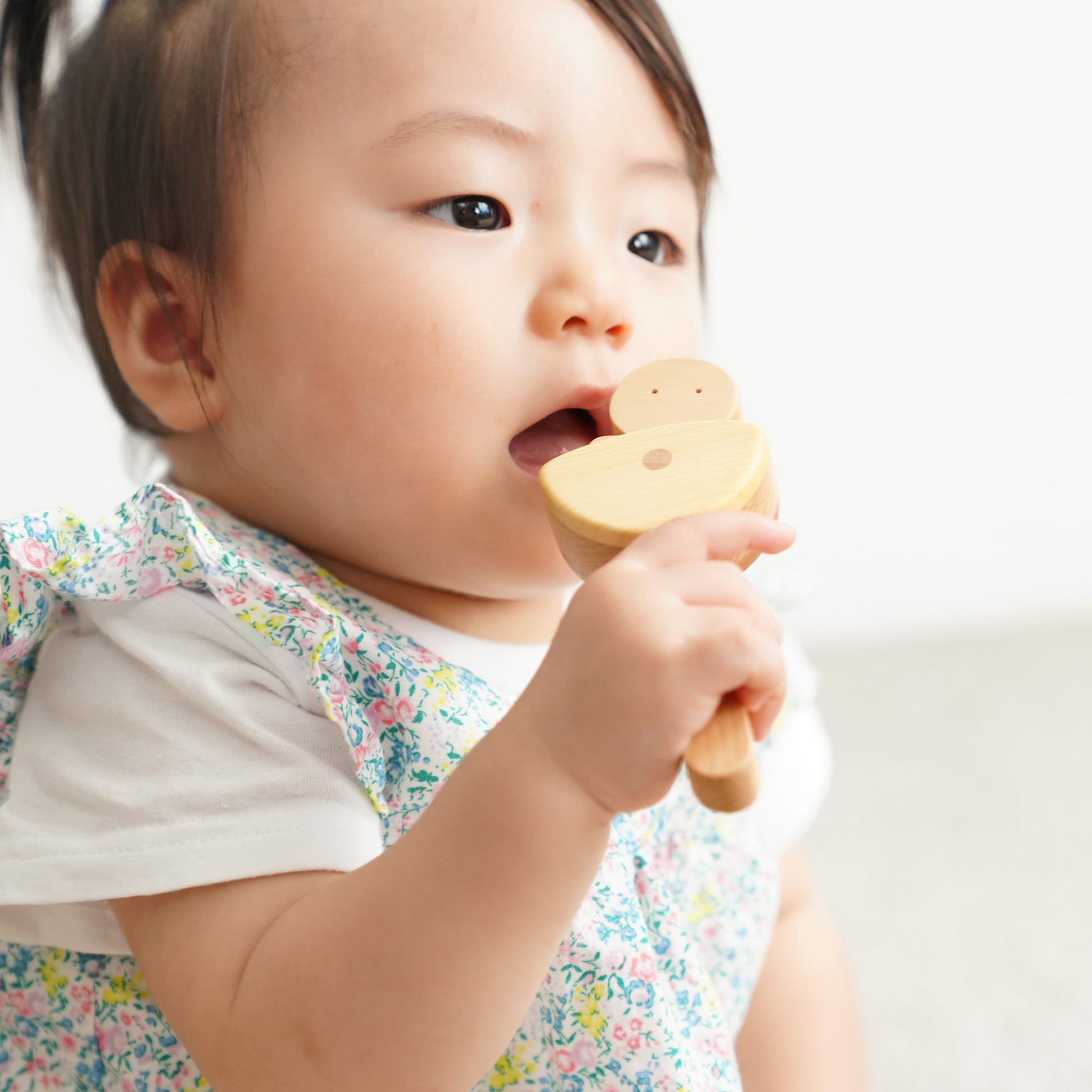 赤ちゃんにとって手や指は突き出た大脳と呼ばれるくらい、脳に繋がった機能を果たします。手でつかんで口まで運ぶ感覚を木のおもちゃを通じて認識します。離乳食が始まったら自分でスプーンを使い、上手に口に運べるようになります。