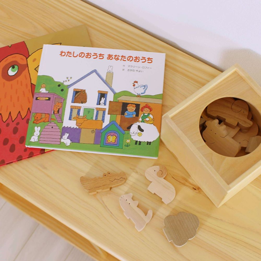 なかよしライブラリーの人気おもちゃ「動物積み木」と、 童話館おすすめのどうぶつ絵本をセットにしました。