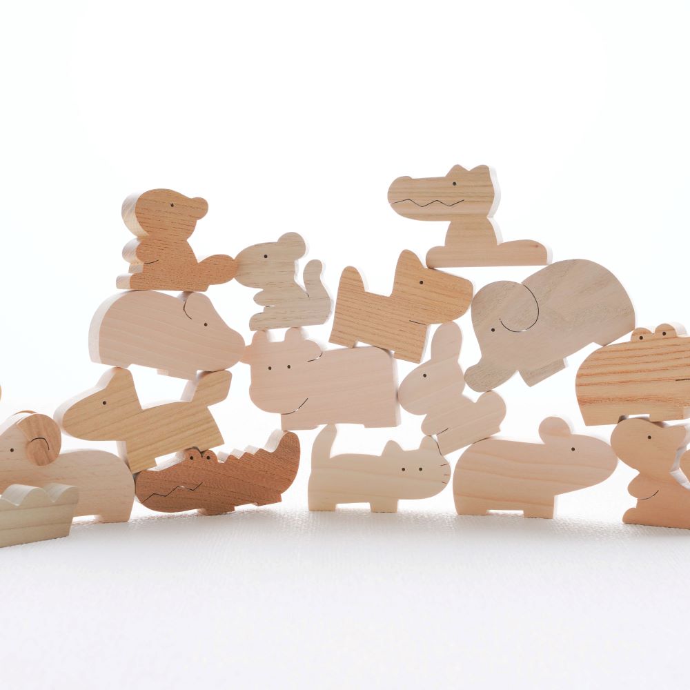 セットのおもちゃは、なかよしライブラリーで長く愛されている「動物積み木」。