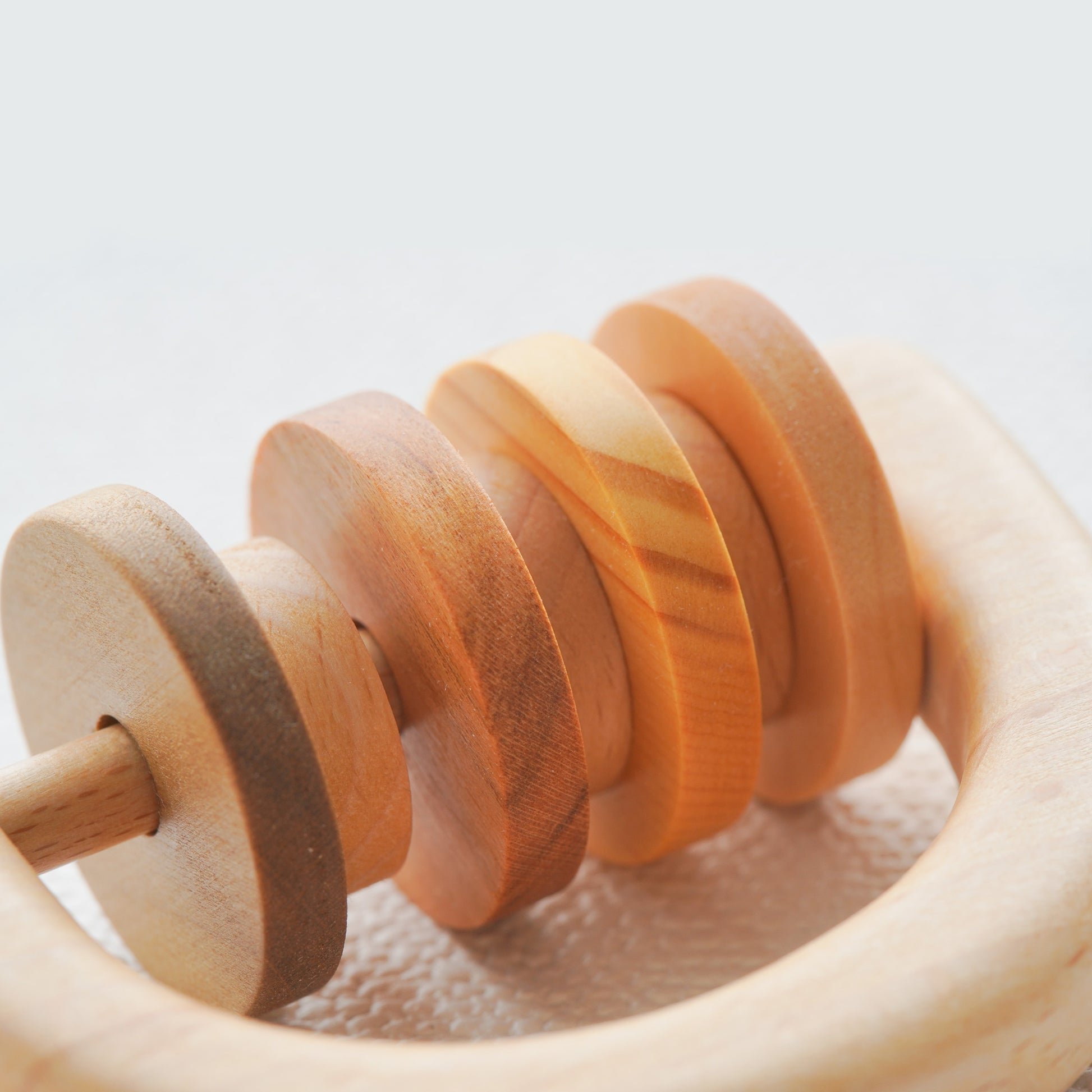 国産の広葉樹を使い、カラフルな赤ちゃんの木のおもちゃにしました。ガチャガチャ遊びは振って遊ぶと、とてもいい音色。4つの輪っかはそれぞれ違う樹種を使って作るため、鮮やかな色を楽しめます。