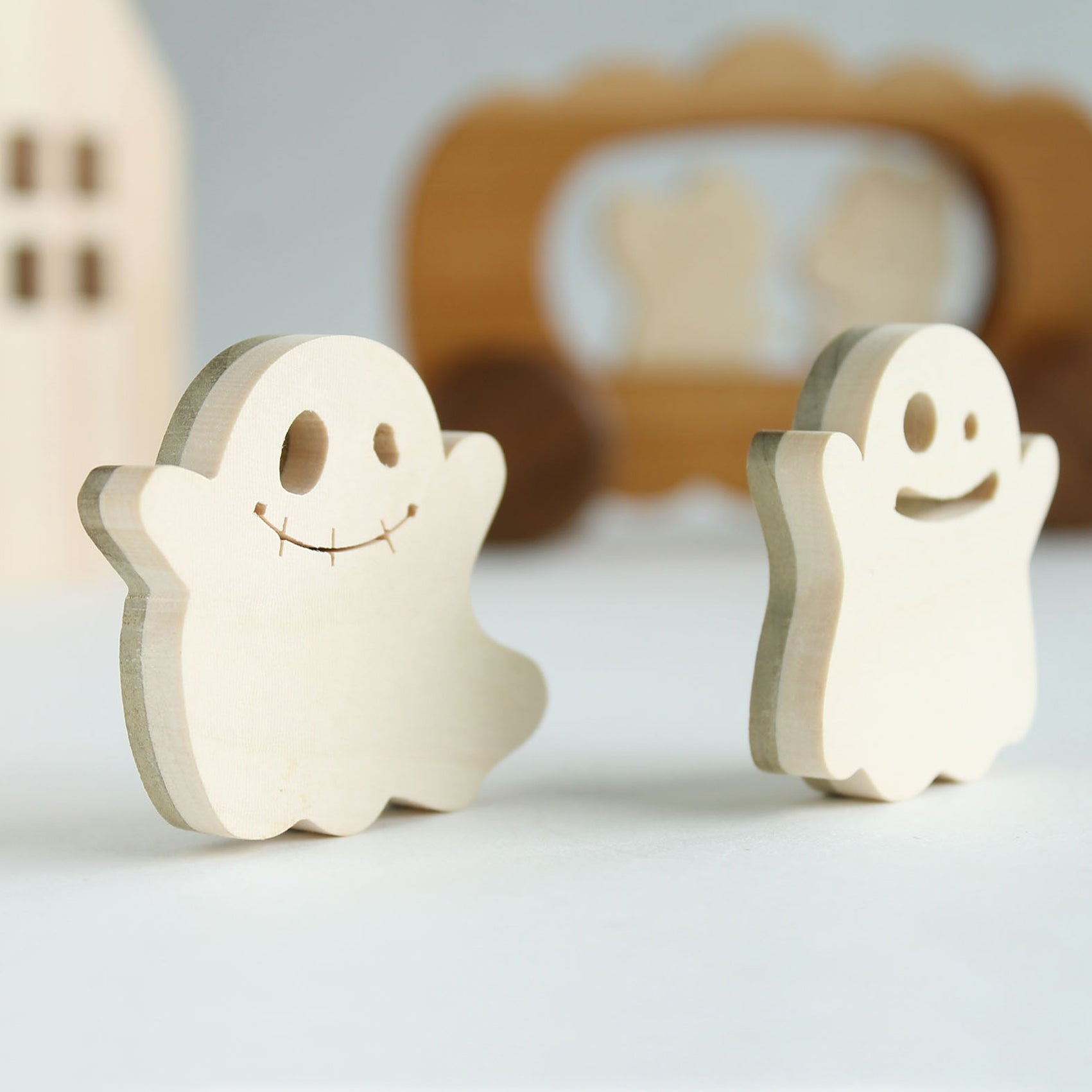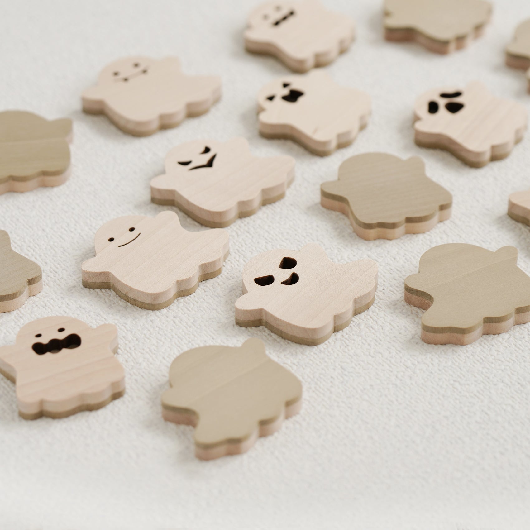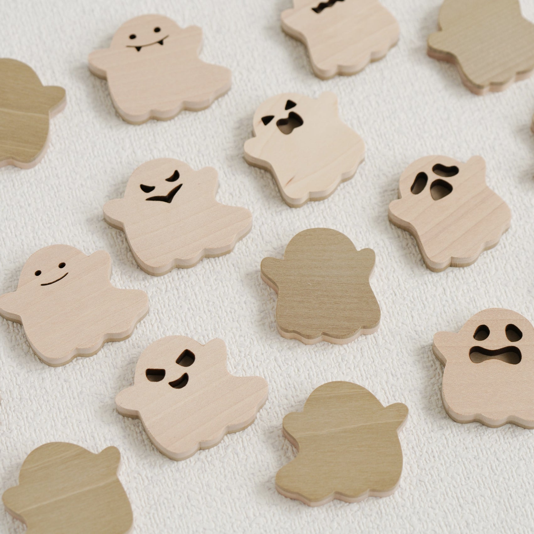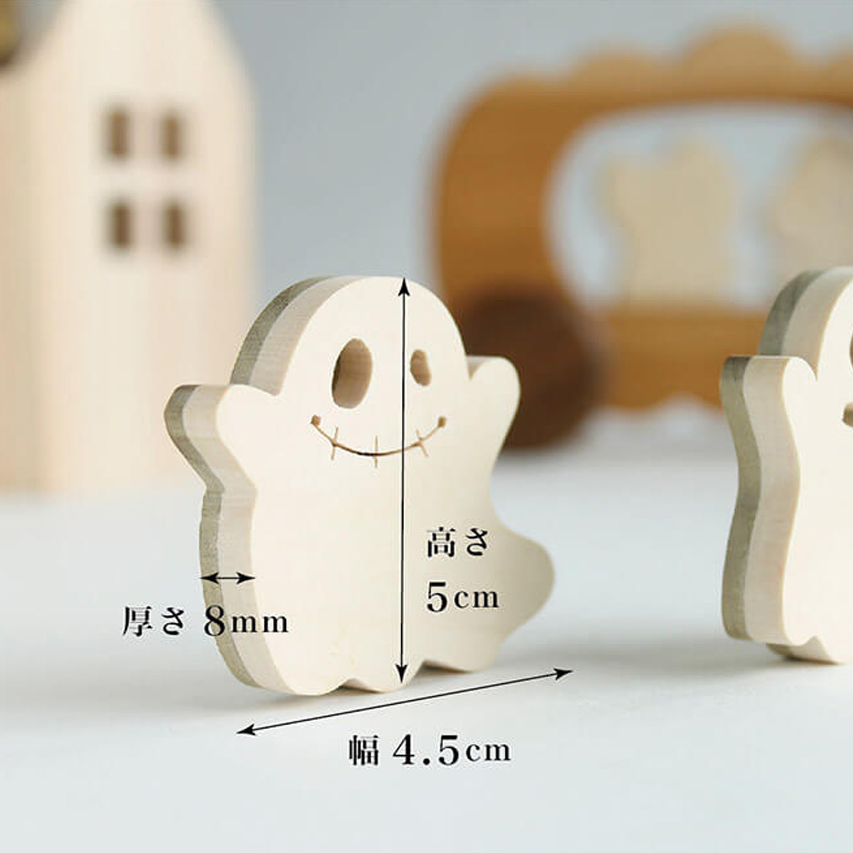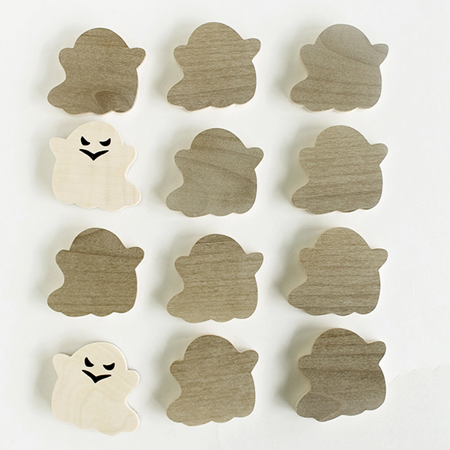 オバケの顔にはカバの木、裏にはホオの木と色の異なる木を組み合わせることで無着色の木の神経衰弱を作ることができました。また、目や口はレーザー加工で仕上げ、外側は糸鋸でカットすることでおばけの表情がハッキリとした美しい木のおもちゃとなっています。