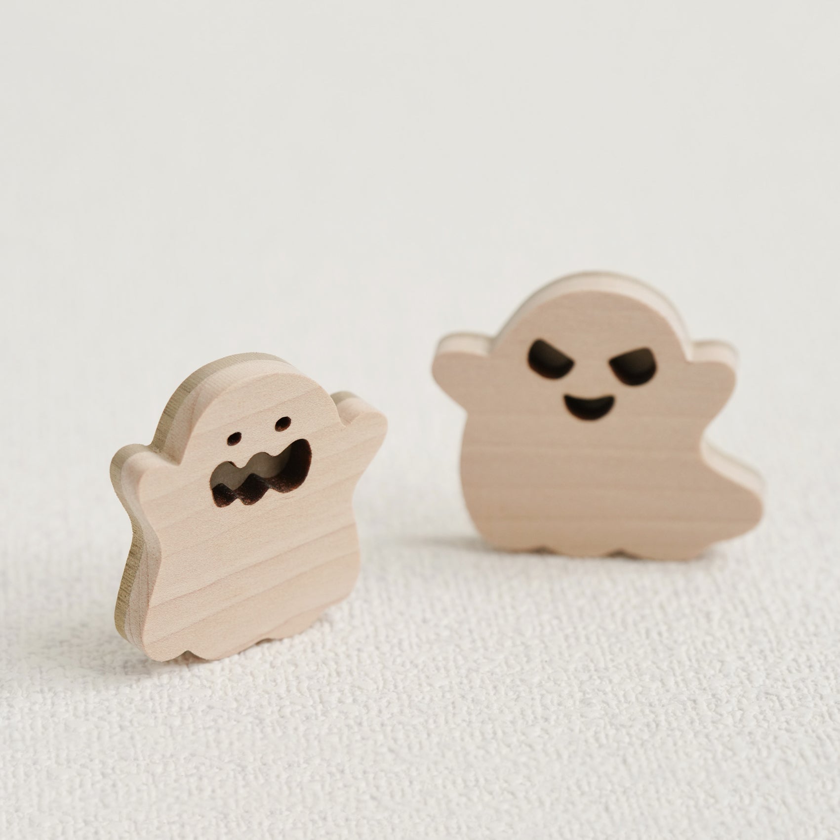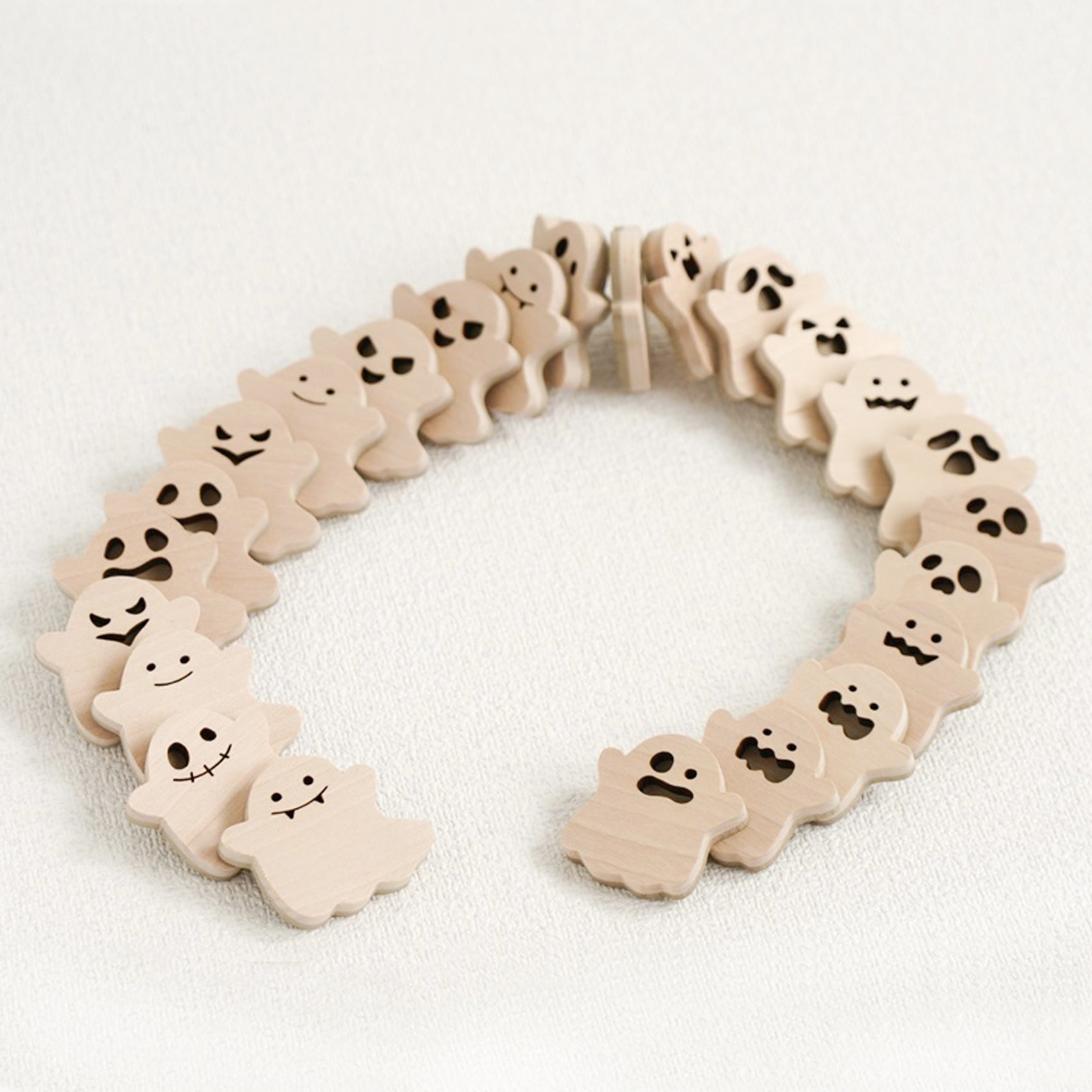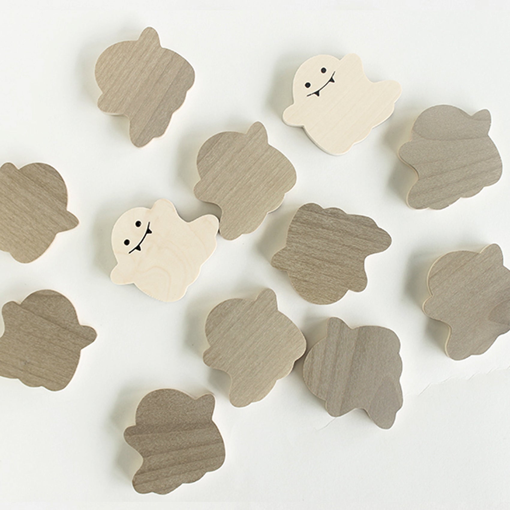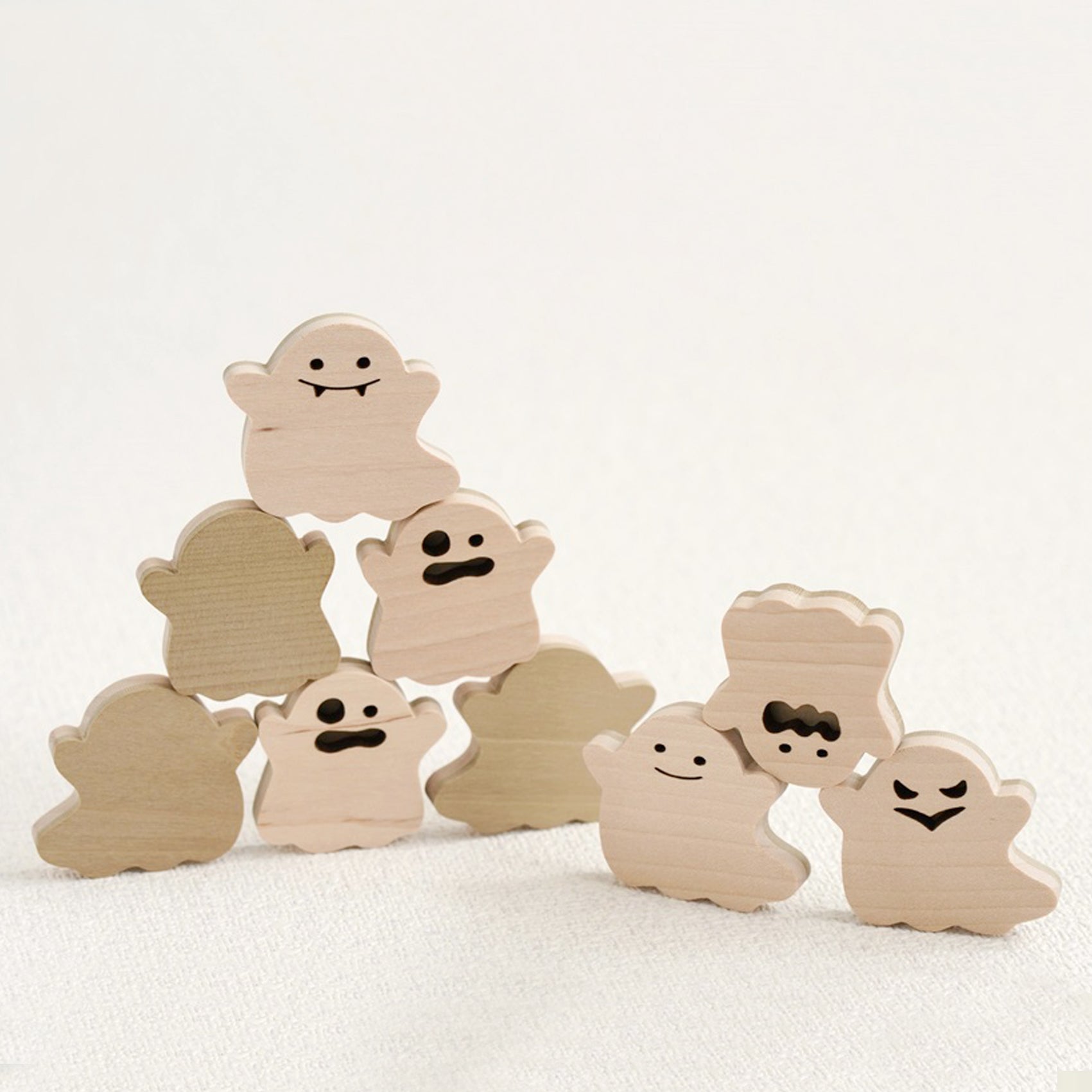 オバケの顔にはカバの木、裏にはホオの木と色の異なる木を組み合わせることで無着色の木の神経衰弱を作ることができました。また、目や口はレーザー加工で仕上げ、外側は糸鋸でカットすることでおばけの表情がハッキリとした美しい木のおもちゃとなっています。