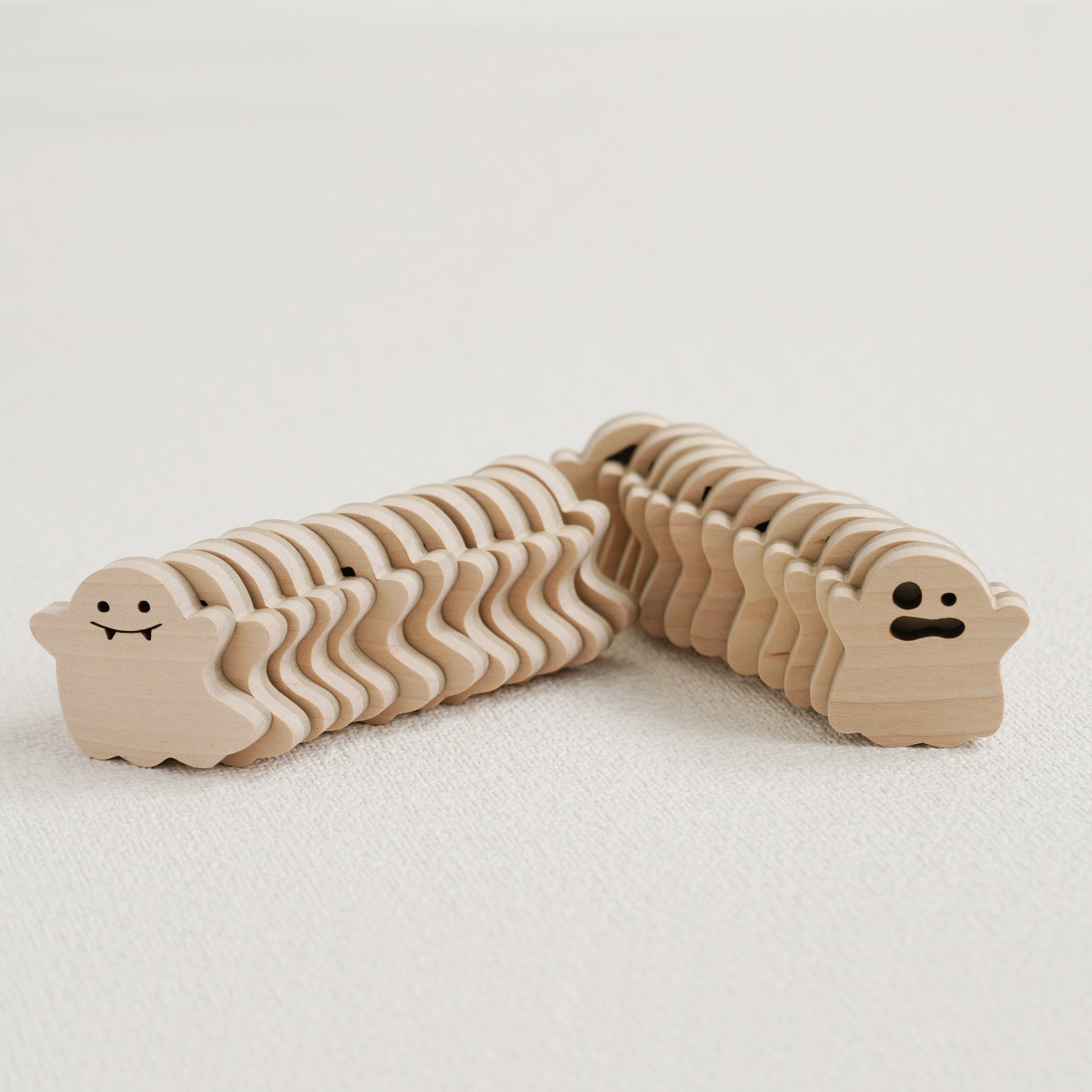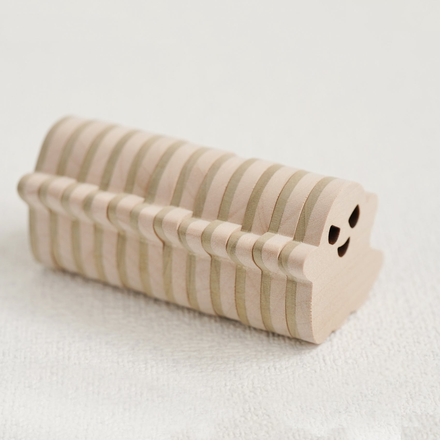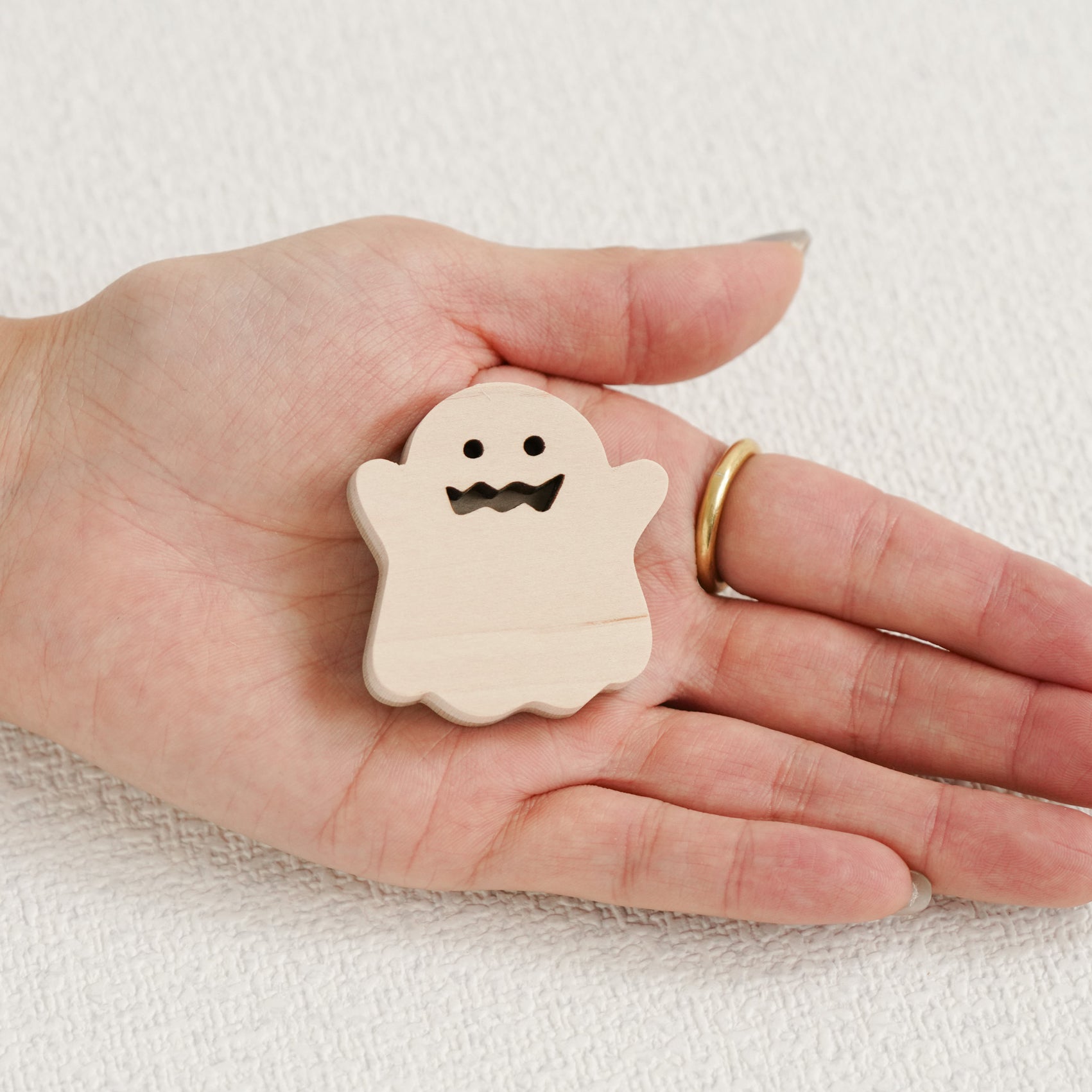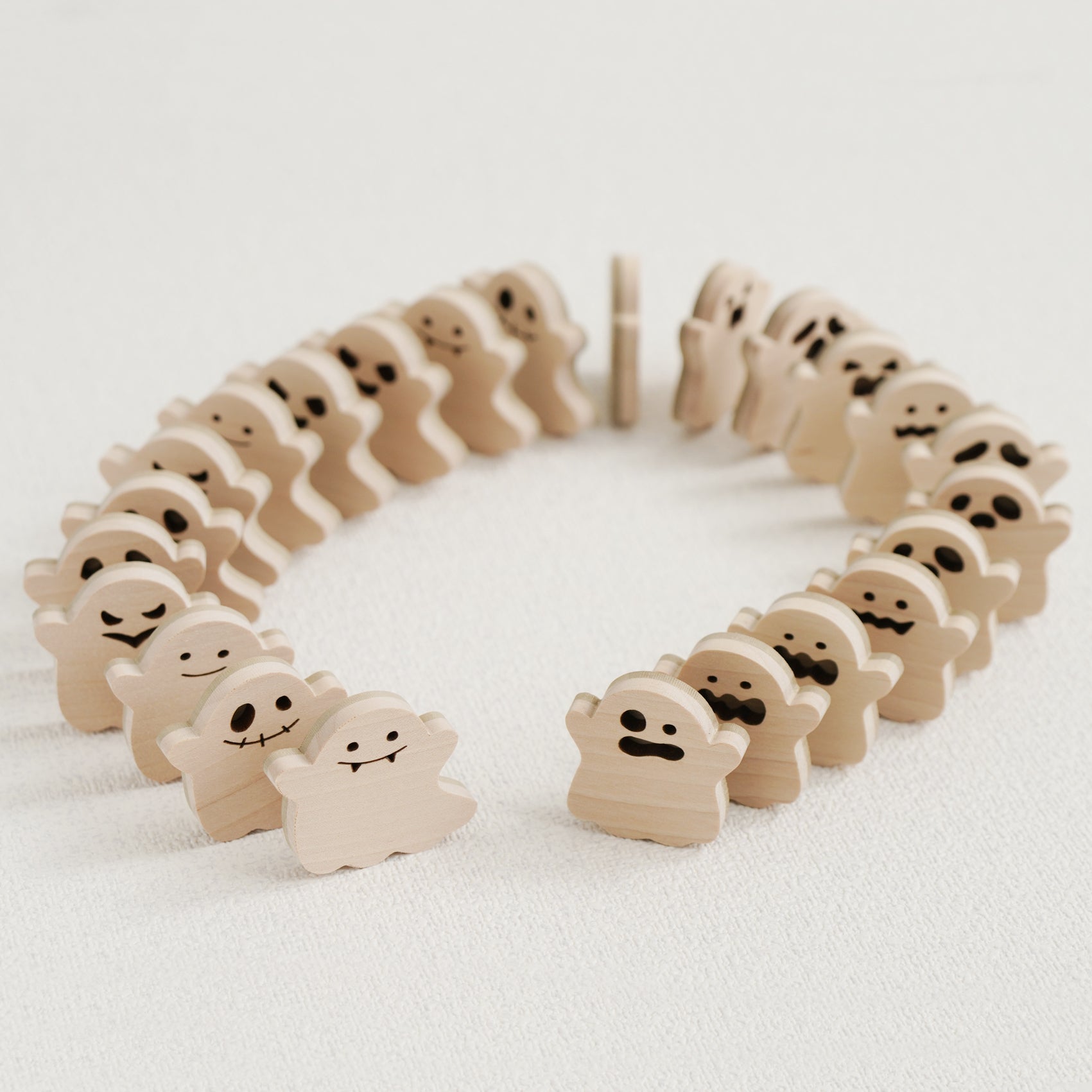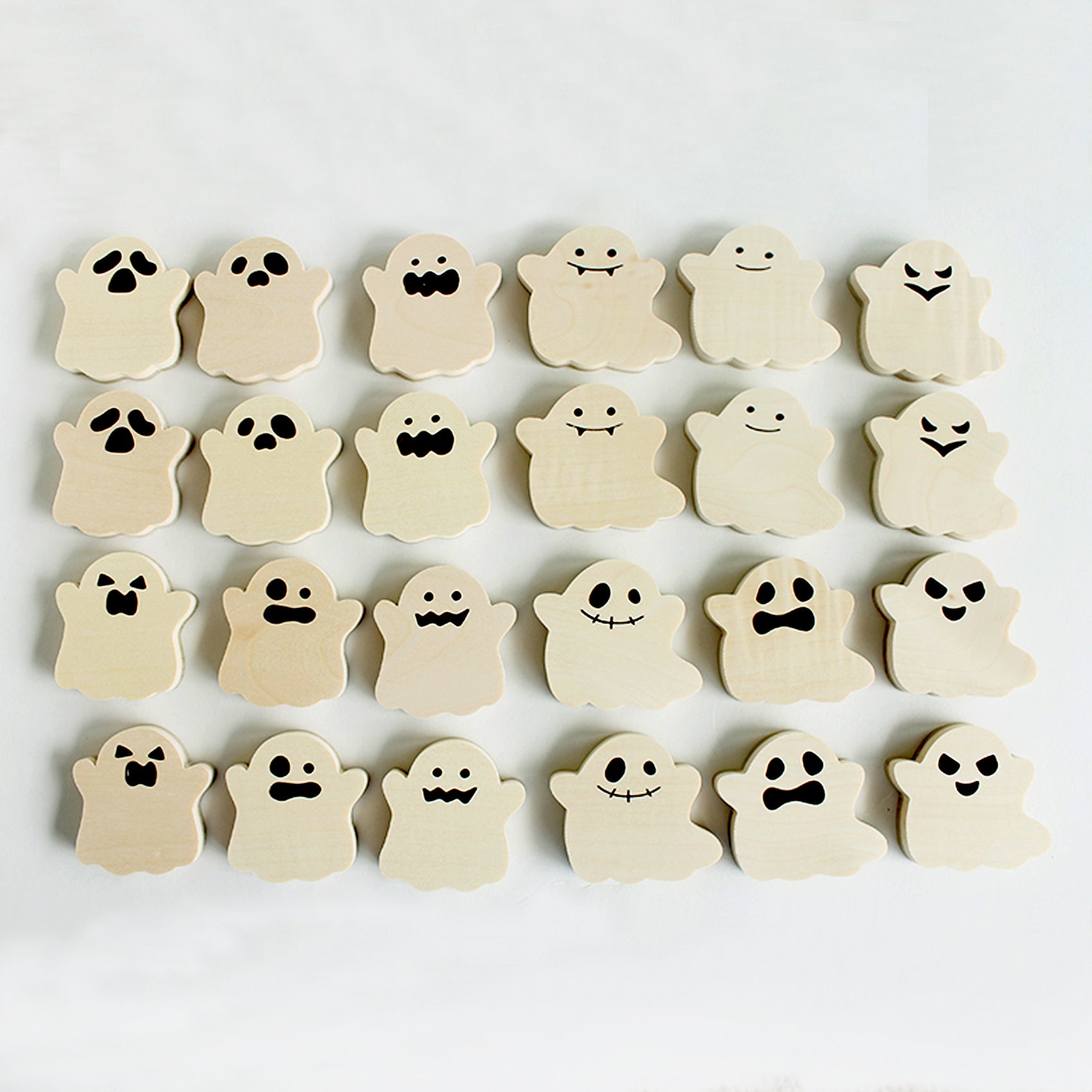 オバケの顔にはカバの木、裏にはホオの木と色の異なる木を組み合わせることで無着色の木の神経衰弱を作ることができました。また、目や口はレーザー加工で仕上げ、外側は糸鋸でカットすることでおばけの表情がハッキリとした美しい木のおもちゃとなっています。