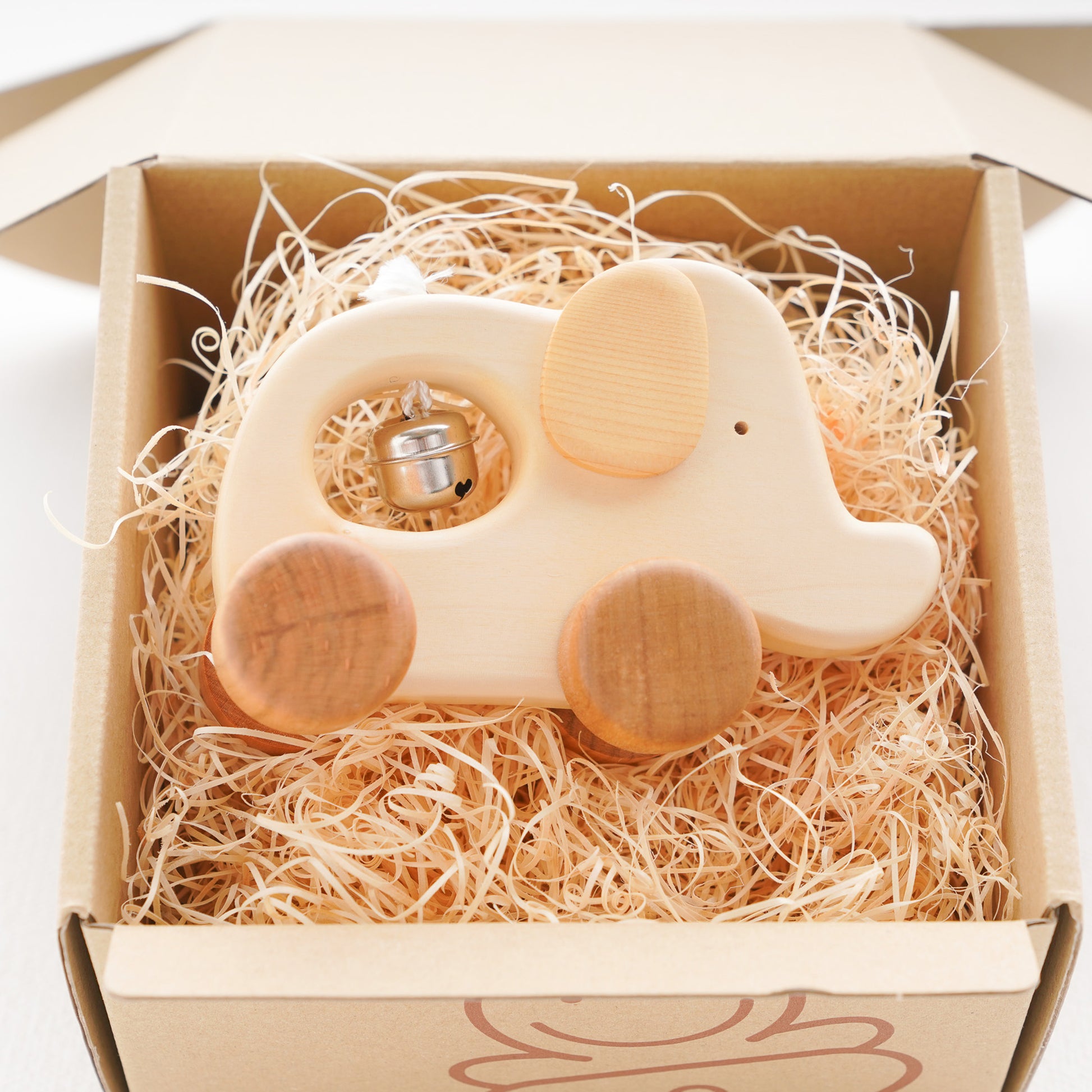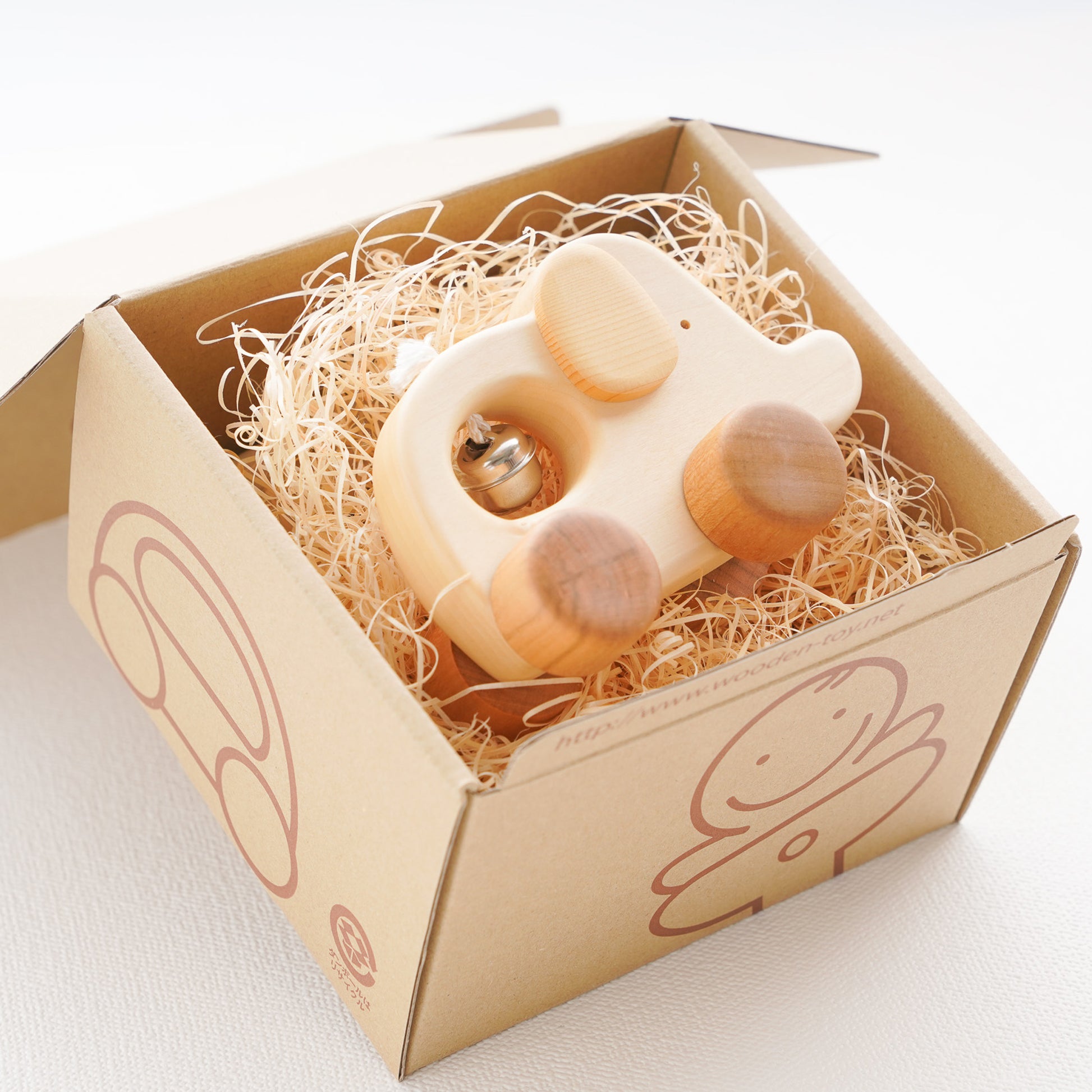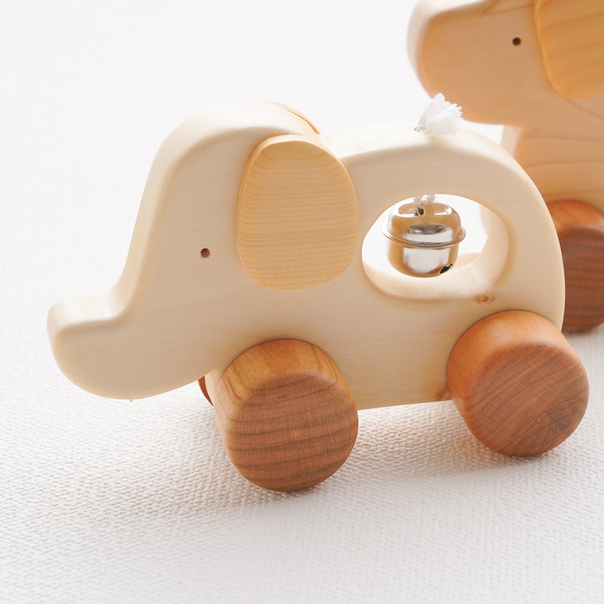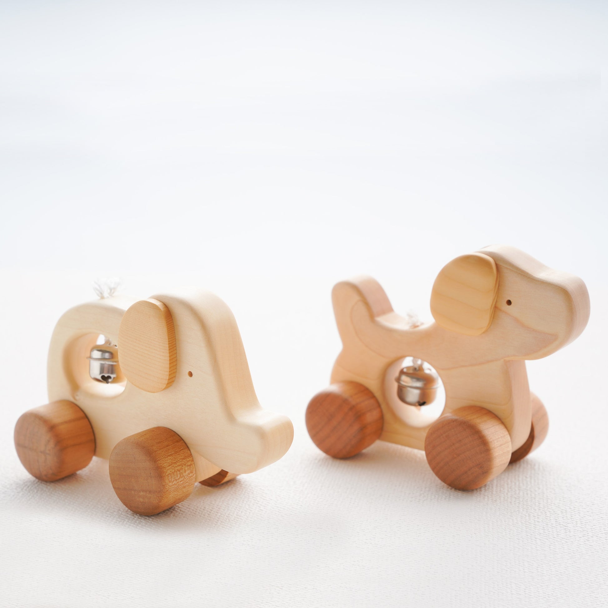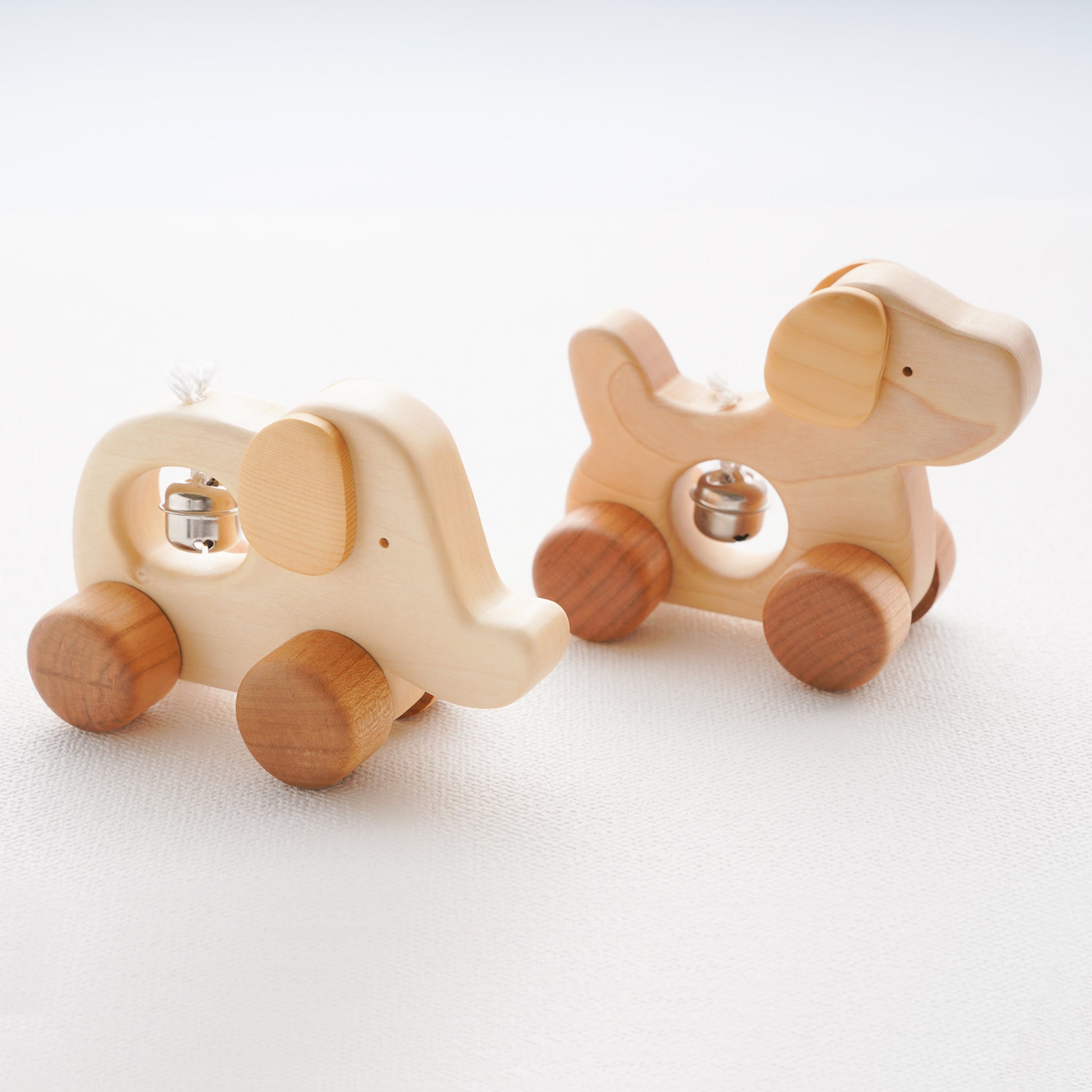 下記のお客さまからのお便りにありますように、ほとんどがギフトにご利用されています。かわいいと言っていただき本当にありがたく思います。以前ある喫茶店に入ったところ、飾り窓にお子様がたっぷり遊んだあとの古ぼけた木の車を飾ってあり、本当にありがたく思いました。使わなくなっても、そっと飾ってください。鈴がついて押せばころころと移動し、鈴の音がする単純なおもちゃです。これからもいろんな種類を制作していきたいと思います。
