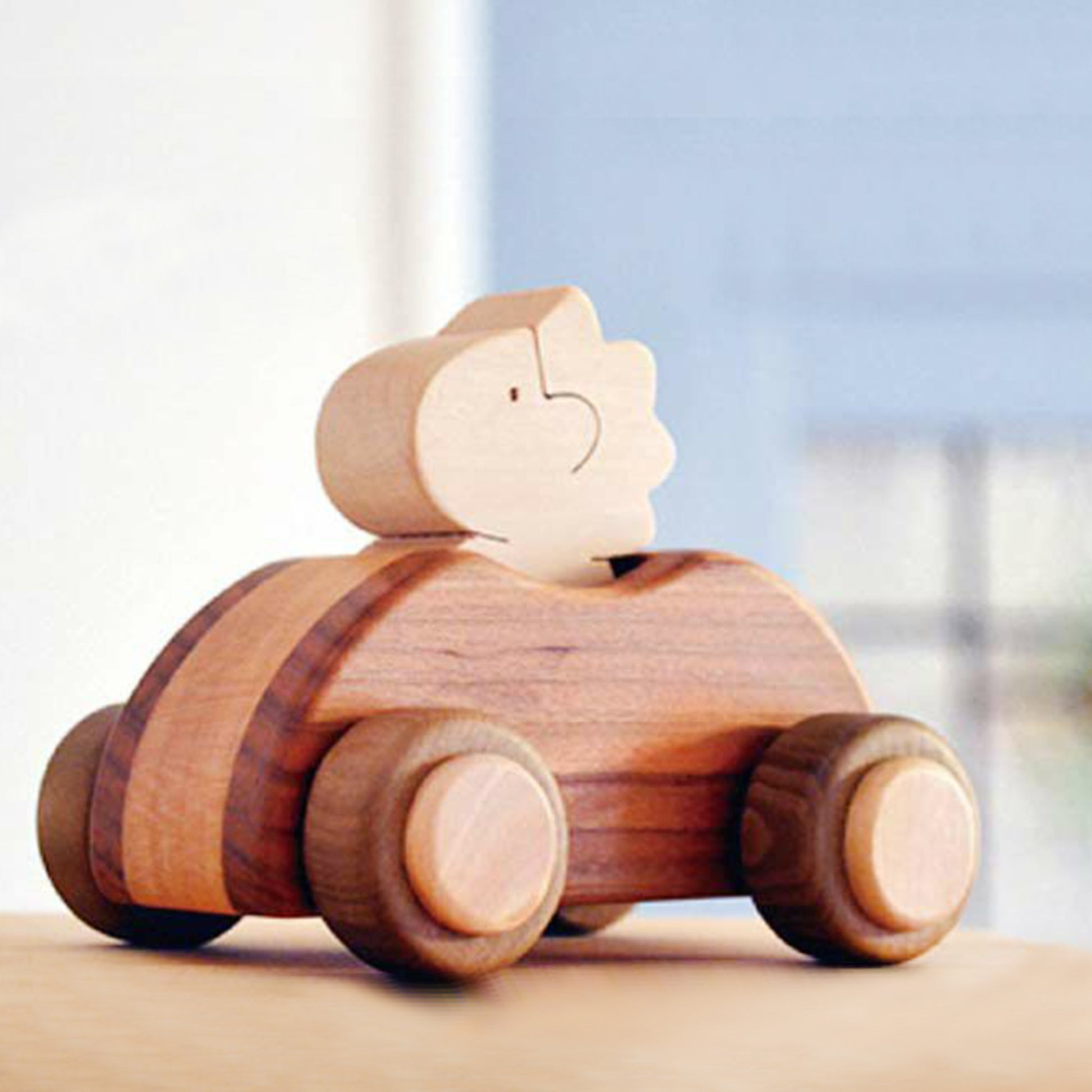 広葉樹の美しい木で完成した手押し車です。乗用タイプで人形をのせて出発です。